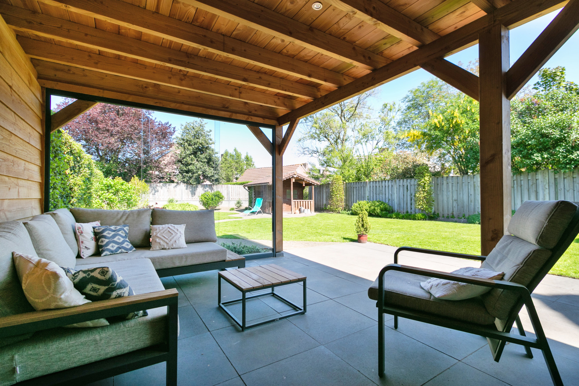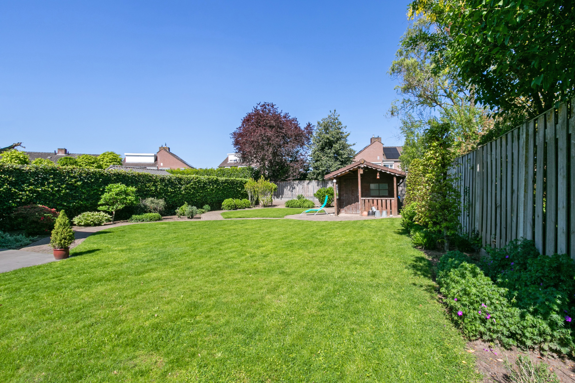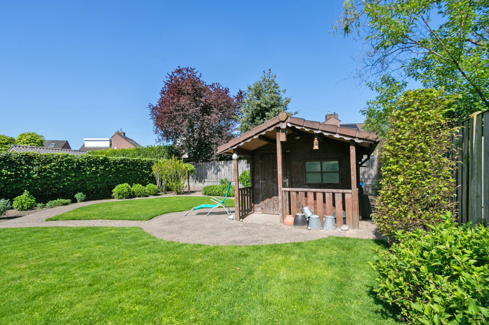 De ruime houten overkapping met elektra vormt een ideale plek om het hele jaar door comfortabel buiten te zitten. Daarnaast biedt het tuinhuis praktische opbergruimte en extra mogelijkheden voor tuinliefhebbers. Deze verzorgde tuin is een heerlijke plek om te ontspannen en te genieten van rust en ruimte, met voldoende plek voor zowel loungen als tuinieren, maar bovenal een plaats waar kinderen naar hartenlust veilig kunnen spelen. Hier komt het buitenleven optimaal tot zijn recht!