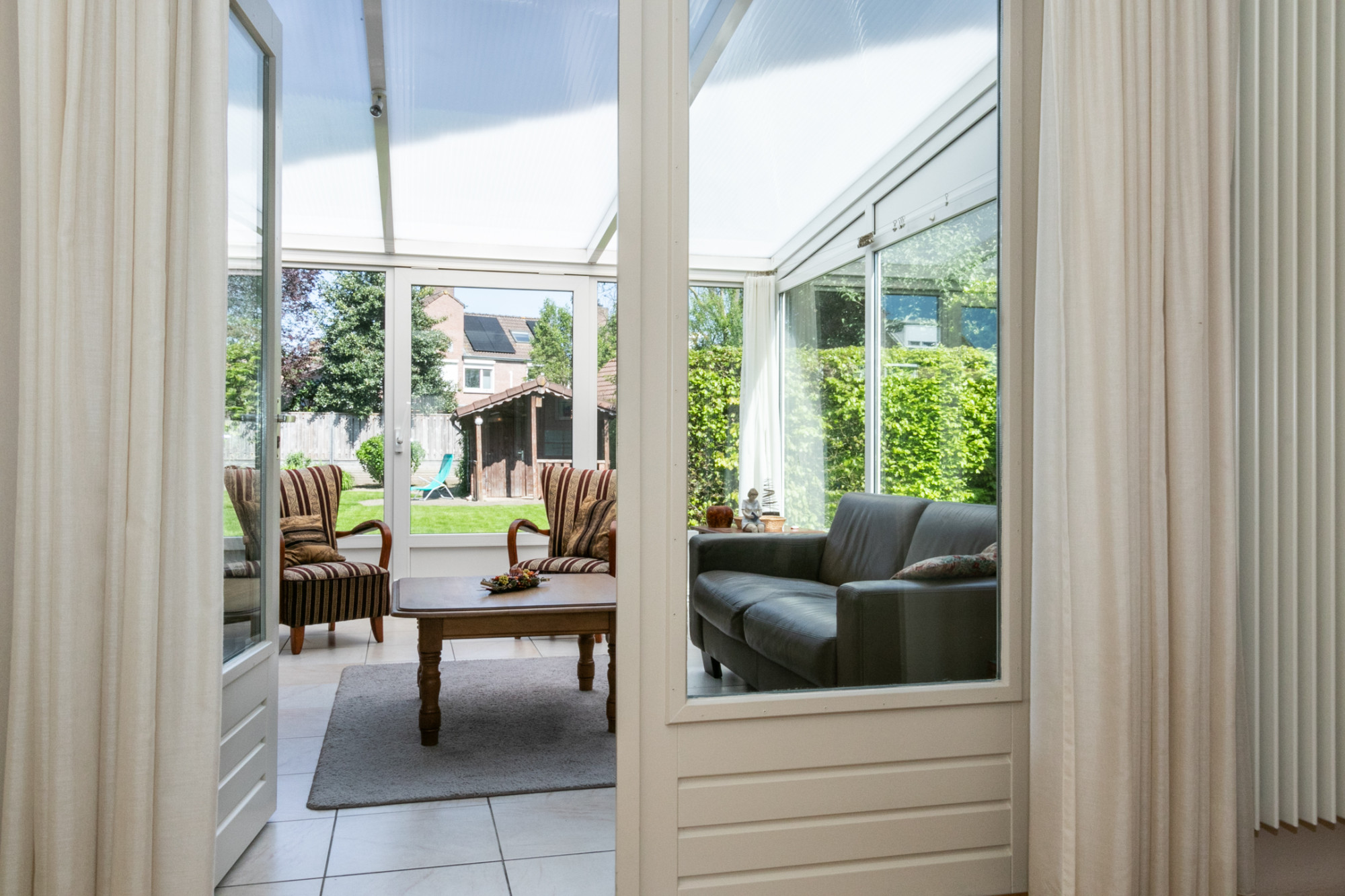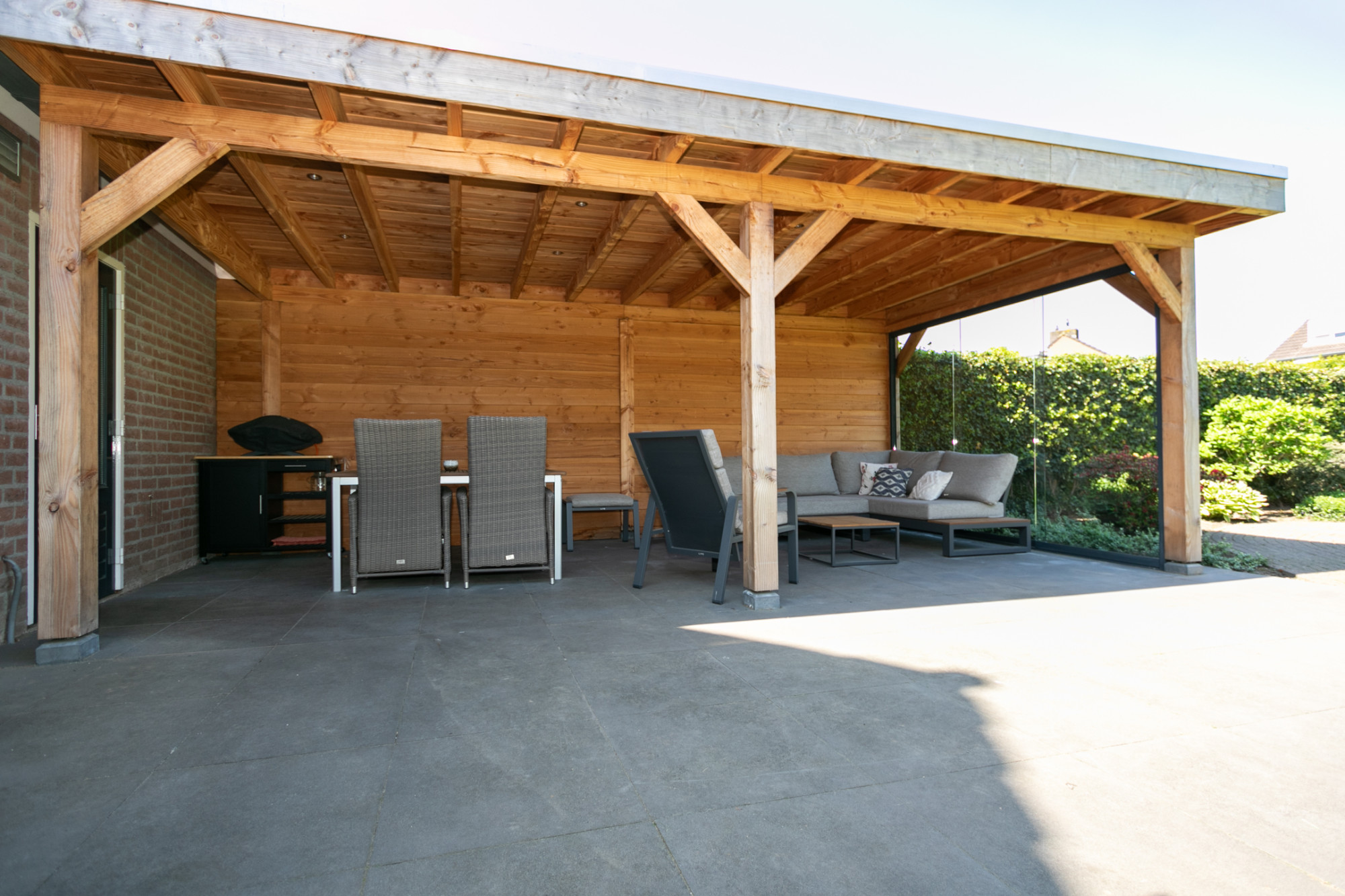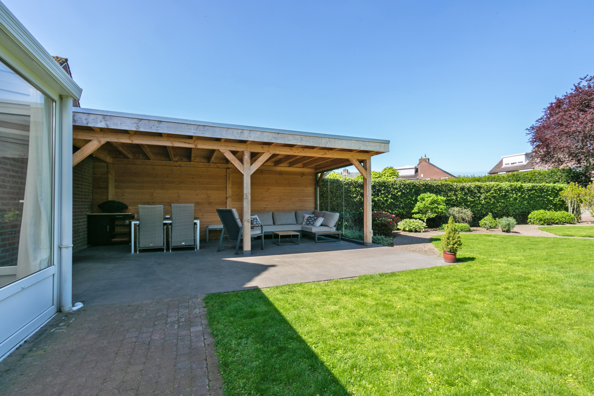 De ruime houten overkapping met elektra vormt een ideale plek om het hele jaar door comfortabel buiten te zitten. Daarnaast biedt het tuinhuis praktische opbergruimte en extra mogelijkheden voor tuinliefhebbers. Deze verzorgde tuin is een heerlijke plek om te ontspannen en te genieten van rust en ruimte, met voldoende plek voor zowel loungen als tuinieren, maar bovenal een plaats waar kinderen naar hartenlust veilig kunnen spelen. Hier komt het buitenleven optimaal tot zijn recht!
