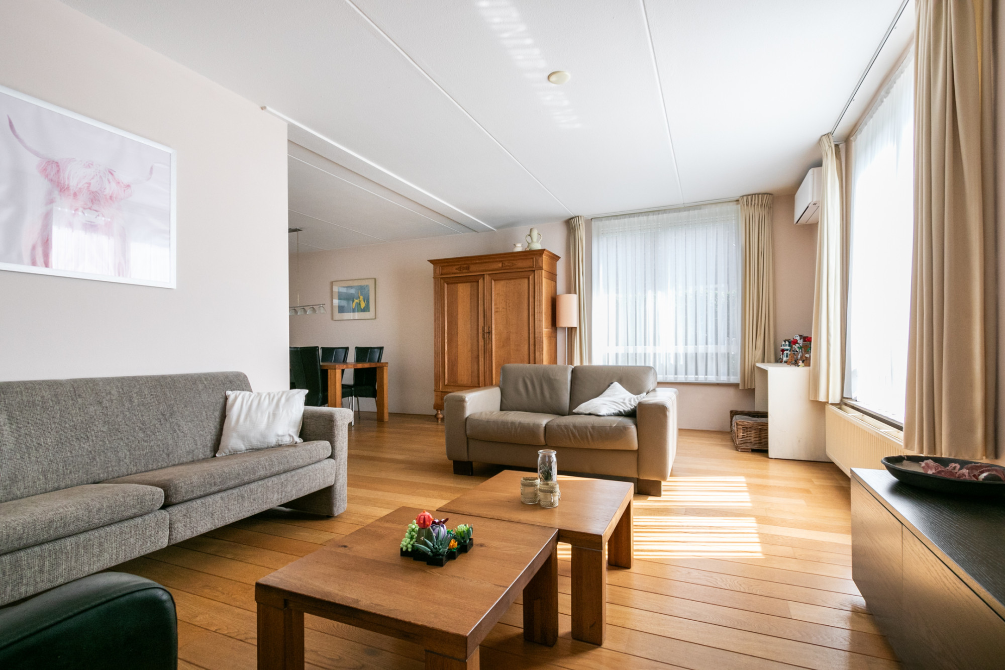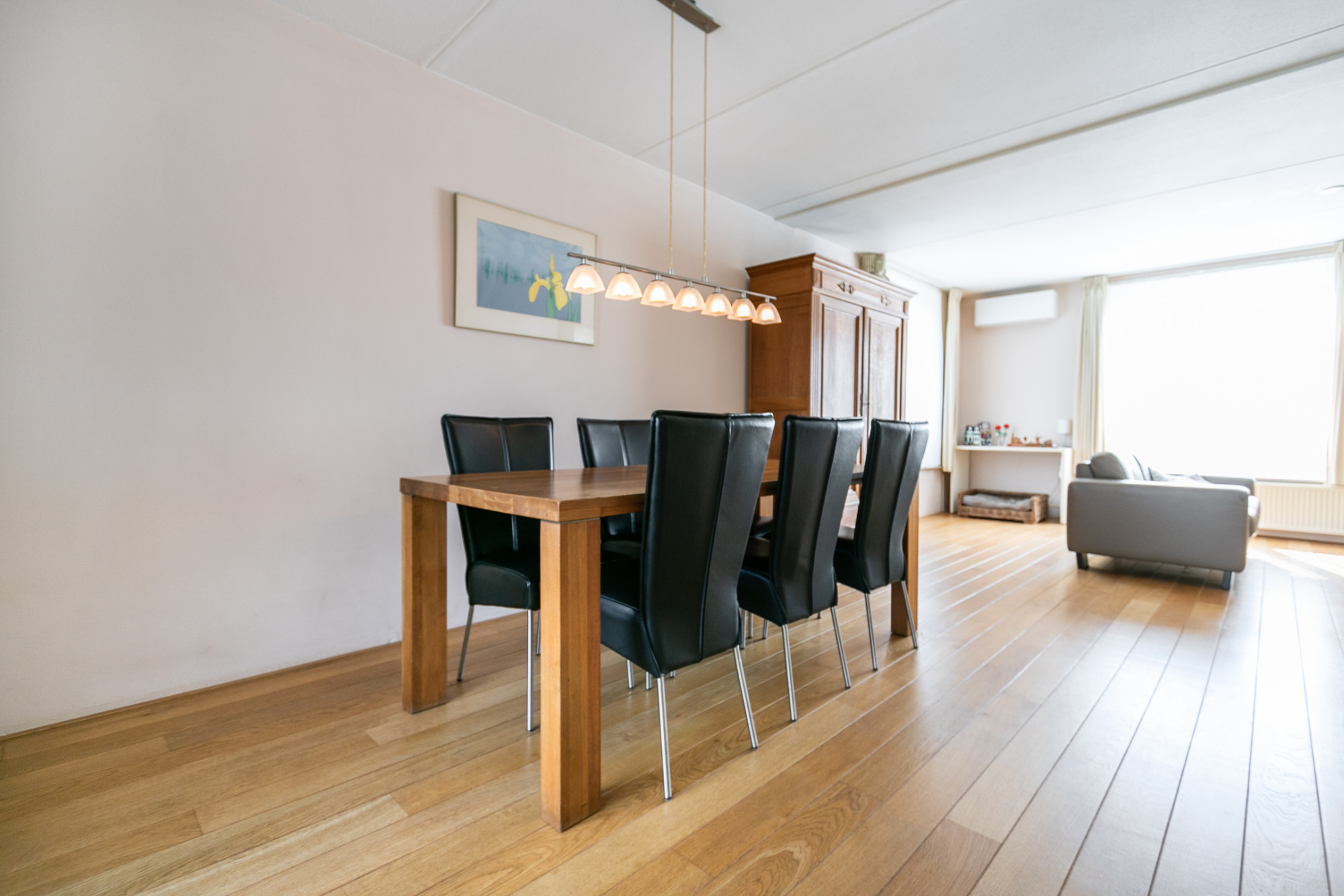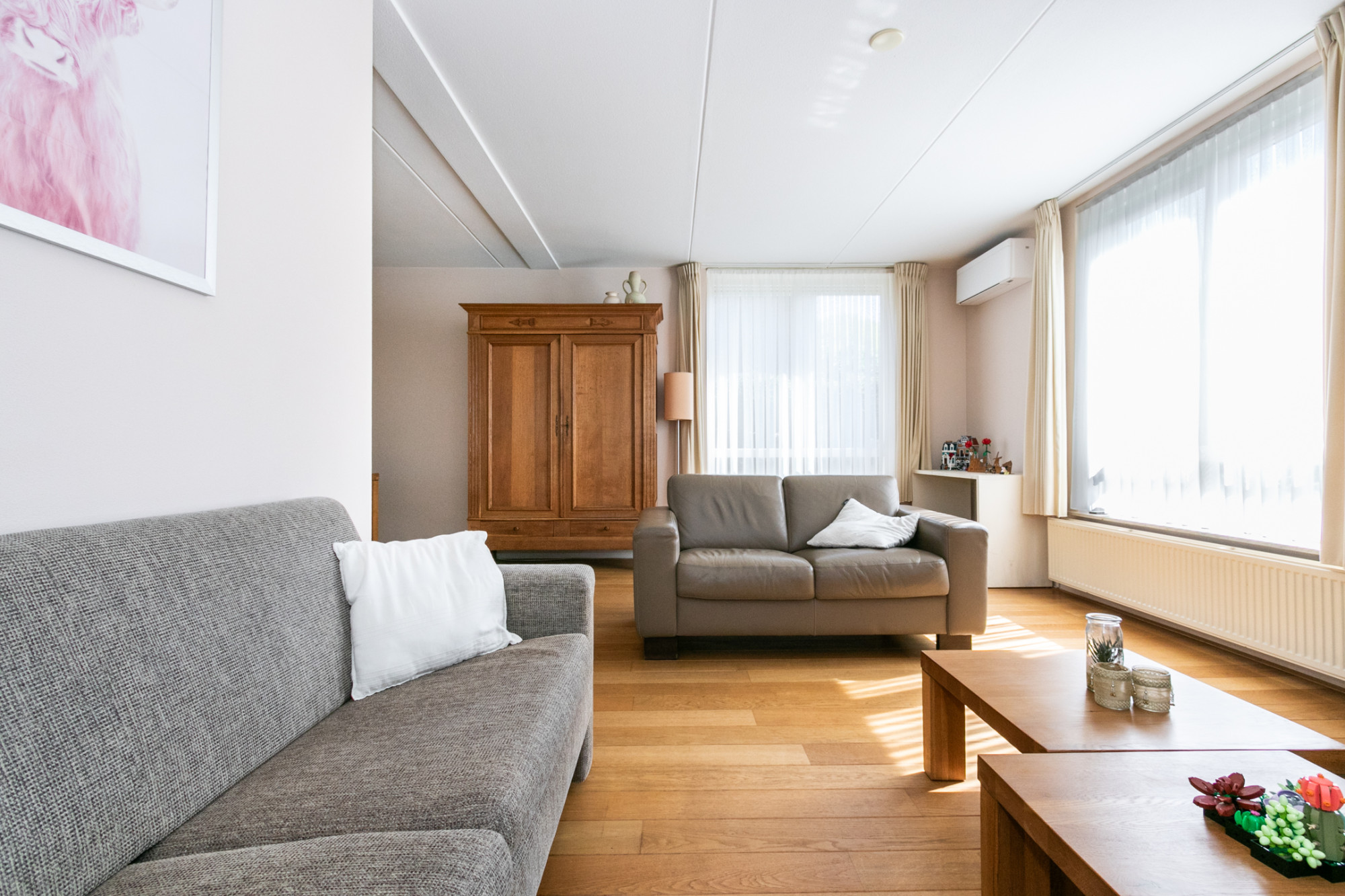 Bij binnenkomst treft u een ruim opgezette woonkamer met een massief eiken vloer, veel lichtinval een comfortabele airco (verwarmen en koelen) en elektrisch bedienbare screens als zonwering. De eethoek biedt directe toegang tot een stijlvol afgewerkte geïsoleerde serre met ingebouwde spots, van waaruit u de fraai aangelegde achtertuin kunt bereiken.