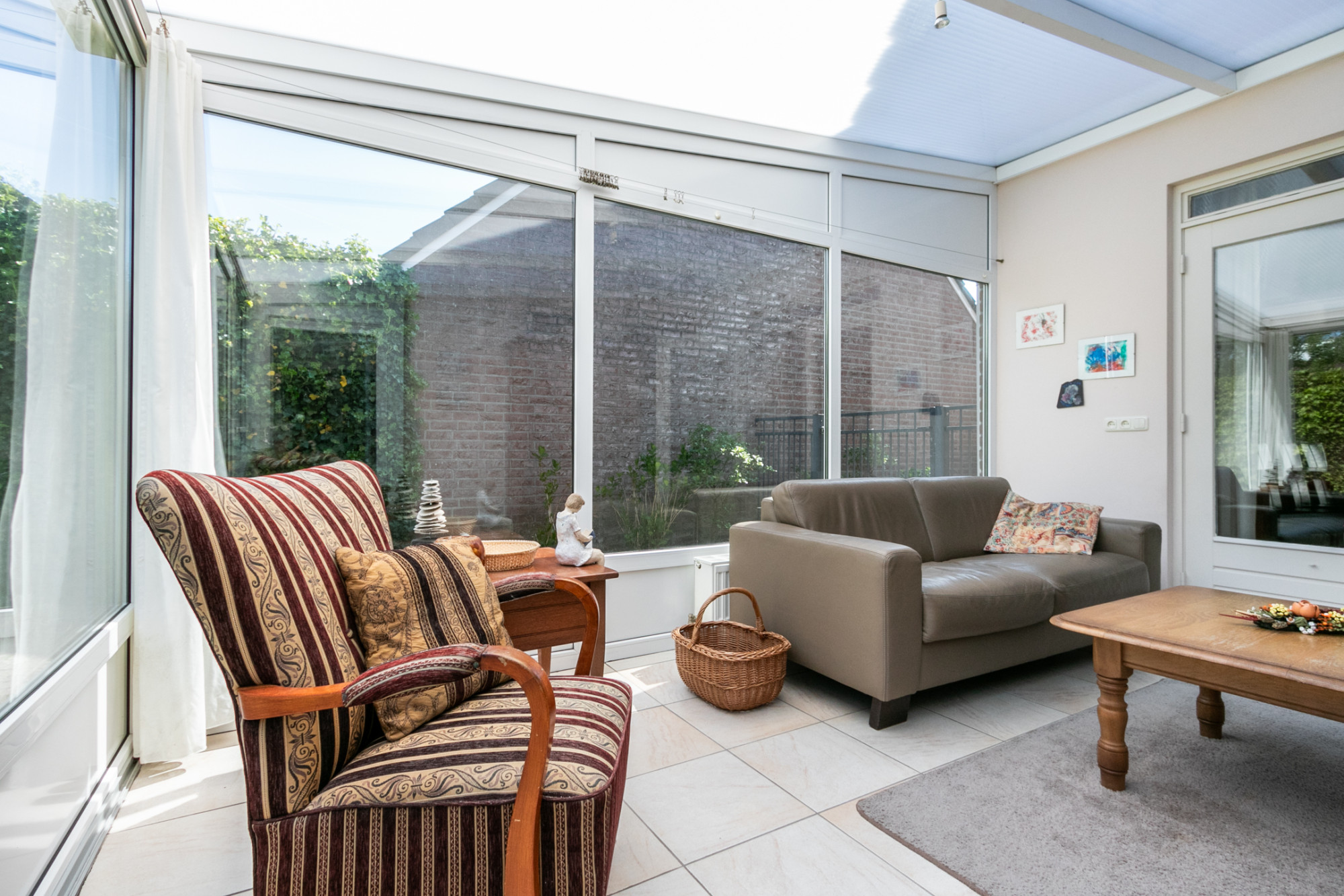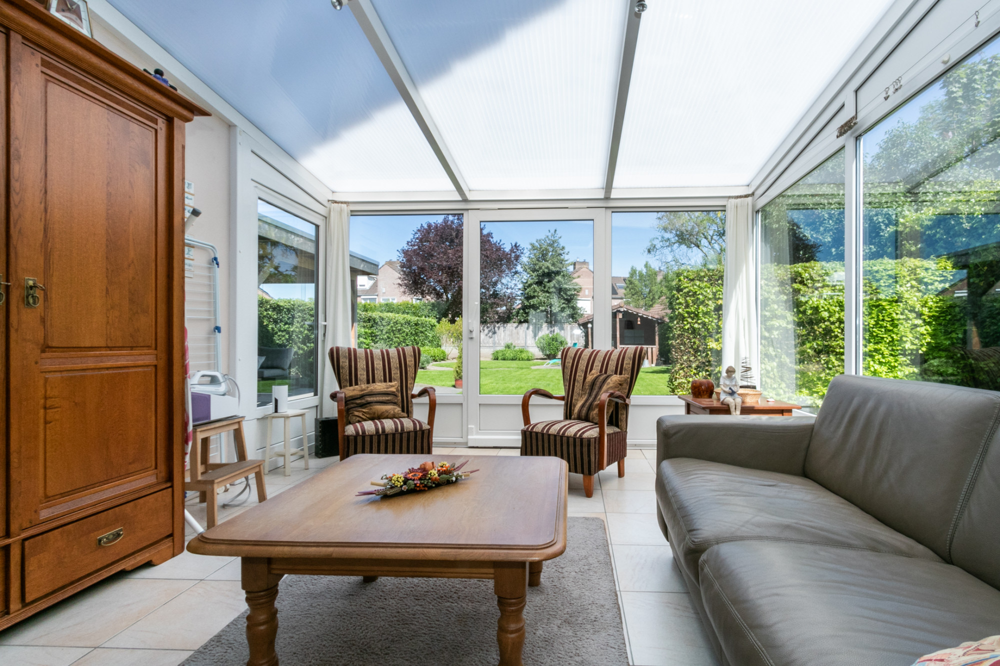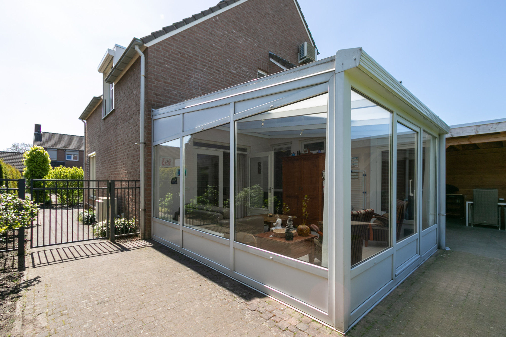 Bij binnenkomst treft u een ruim opgezette woonkamer met een massief eiken vloer, veel lichtinval een comfortabele airco (verwarmen en koelen) en elektrisch bedienbare screens als zonwering. De eethoek biedt directe toegang tot een stijlvol afgewerkte geïsoleerde serre met ingebouwde spots, van waaruit u de fraai aangelegde achtertuin kunt bereiken.