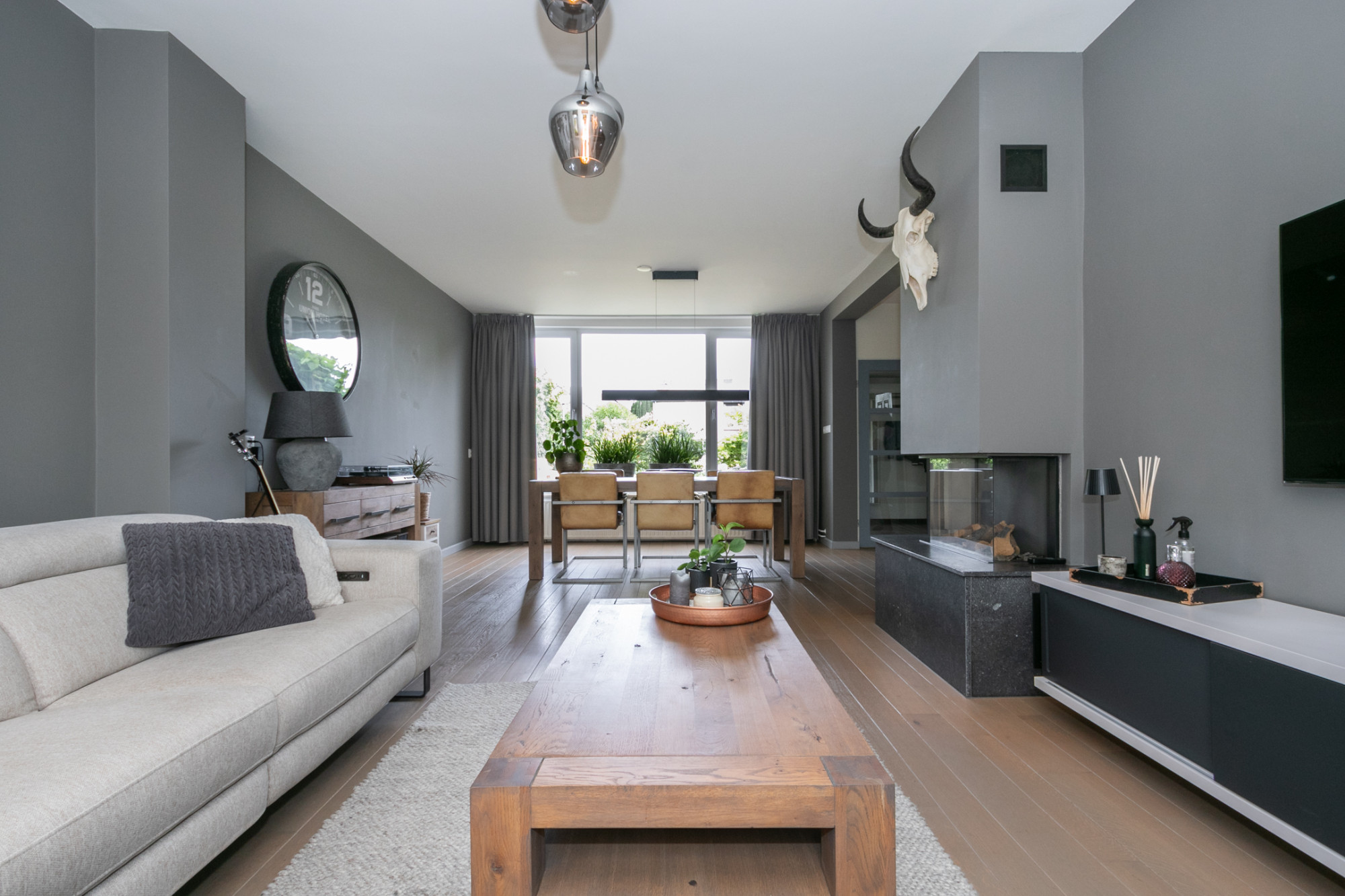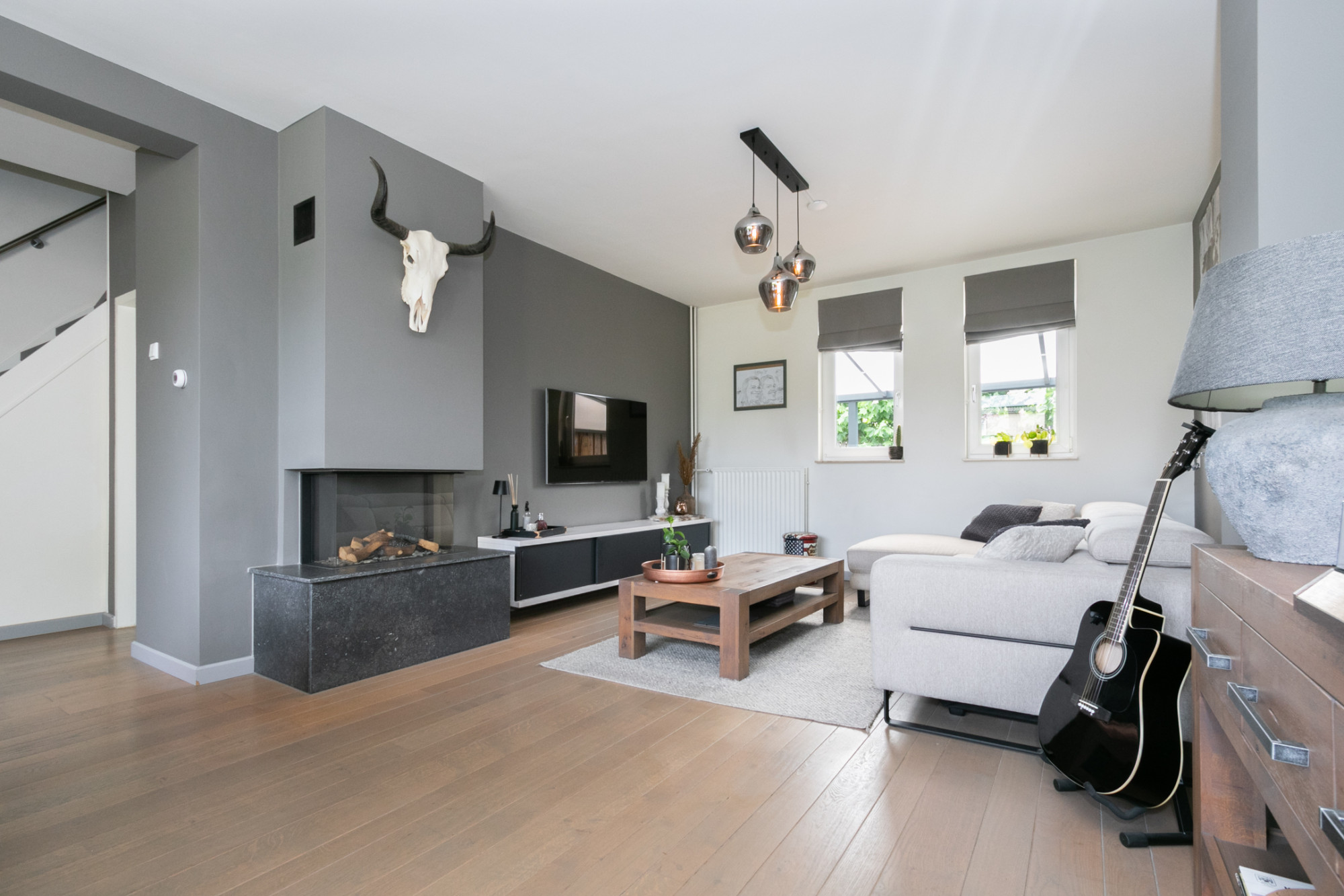 Bij binnenkomst in de woning word je begroet door de ruime woonkamer op de begane grond, die baadt in het natuurlijke licht dankzij de grote ramen. De gashaard en de onlangs gerenoveerde trap met verlichting geven de woonkamer extra sfeer.
