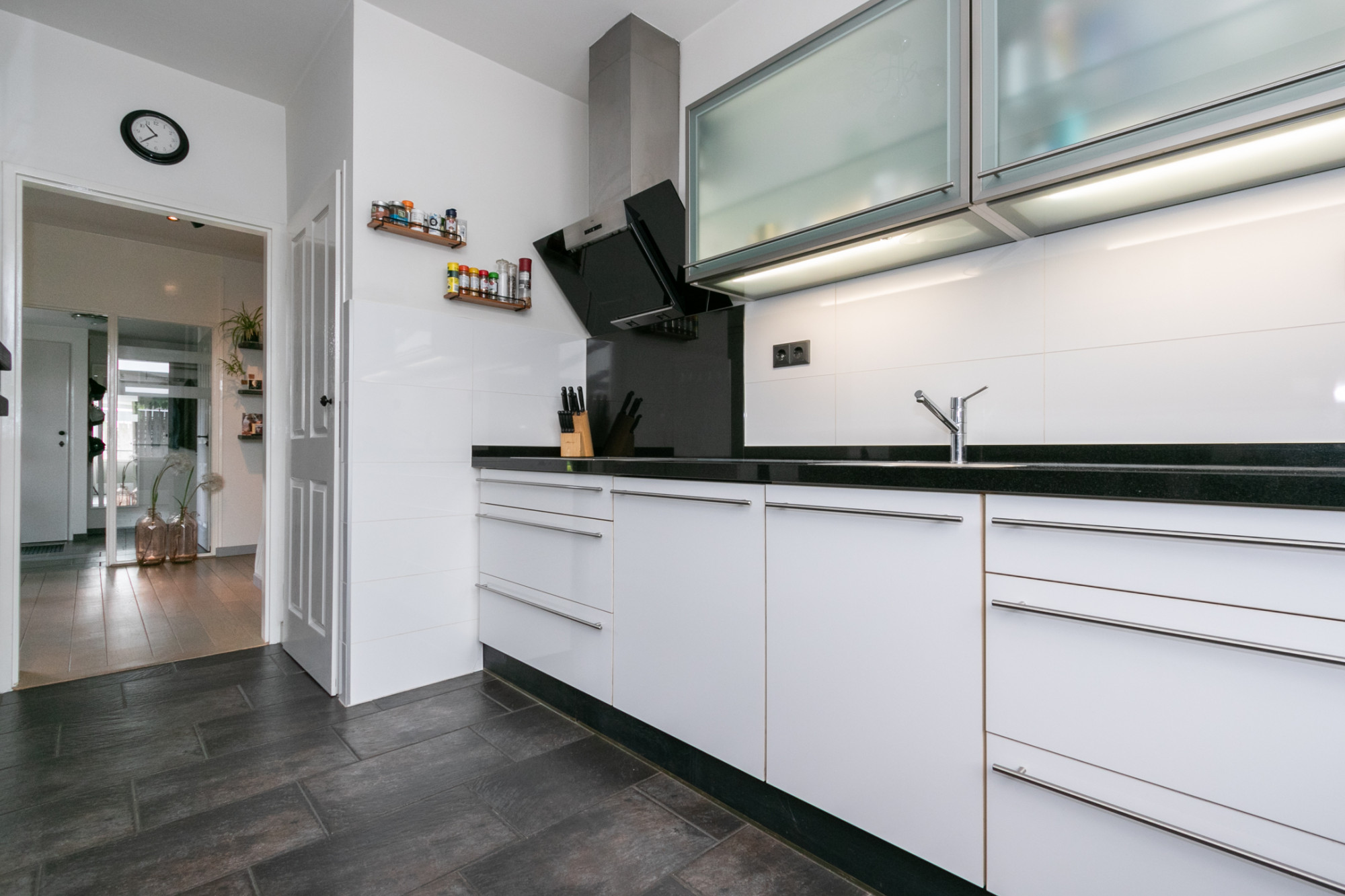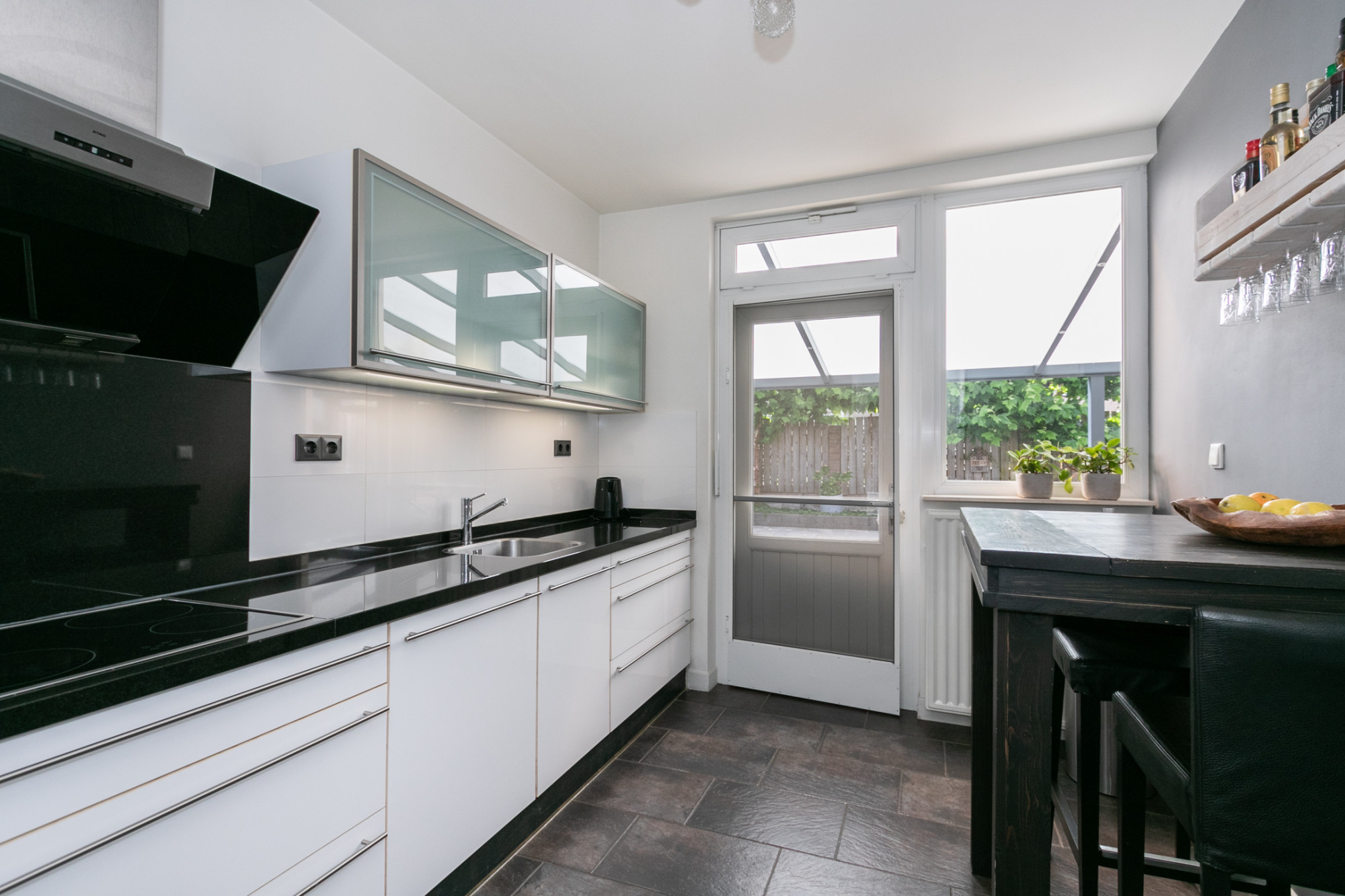 De keuken heeft een witte opstand met granieten werkblad en is uitgerust met een inductie kookplaat, spoelbak, recent vervangen vaatwasser en koelkast. Genoeg ruimte om lekker te koken en dagelijkse maaltijden te nuttige.