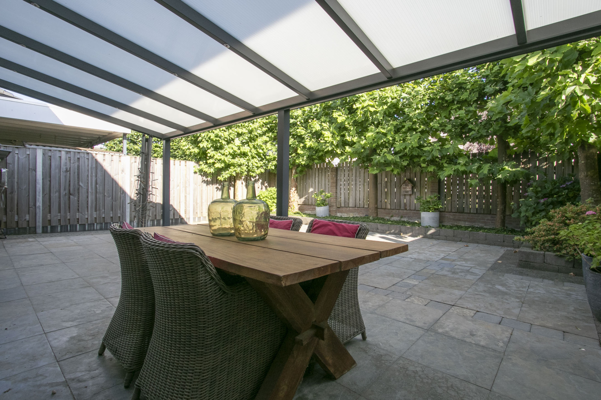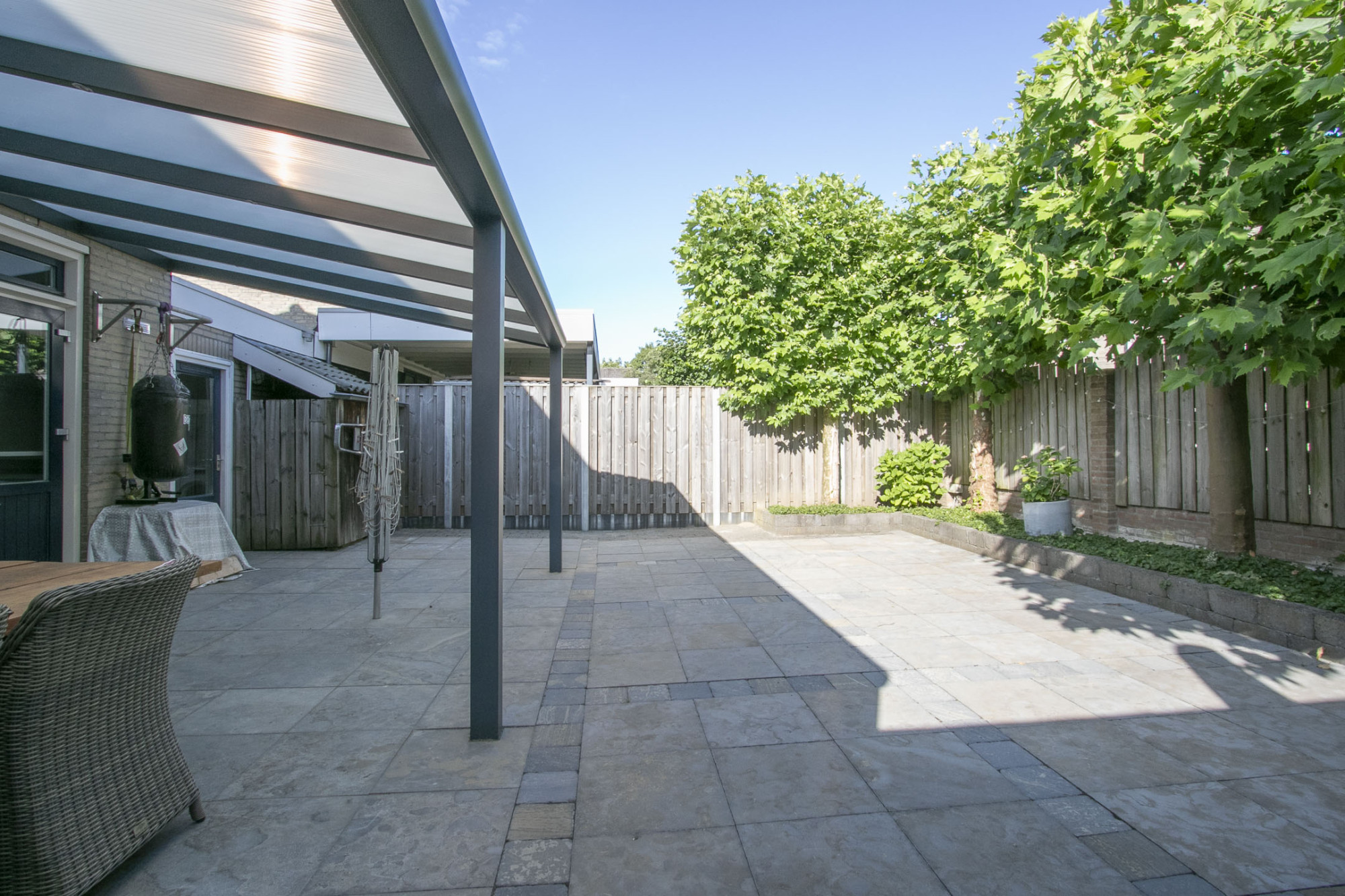 De achtertuin van de woning is onderhoudsvriendelijk beklinkerd en heeft een mooie overkapping aan de achtergevel. Enkele bomen aan de achterkant zorgen voor privacy. De grote voortuin zorgt ervoor dat je heerlijk terug ligt vanaf de straat.