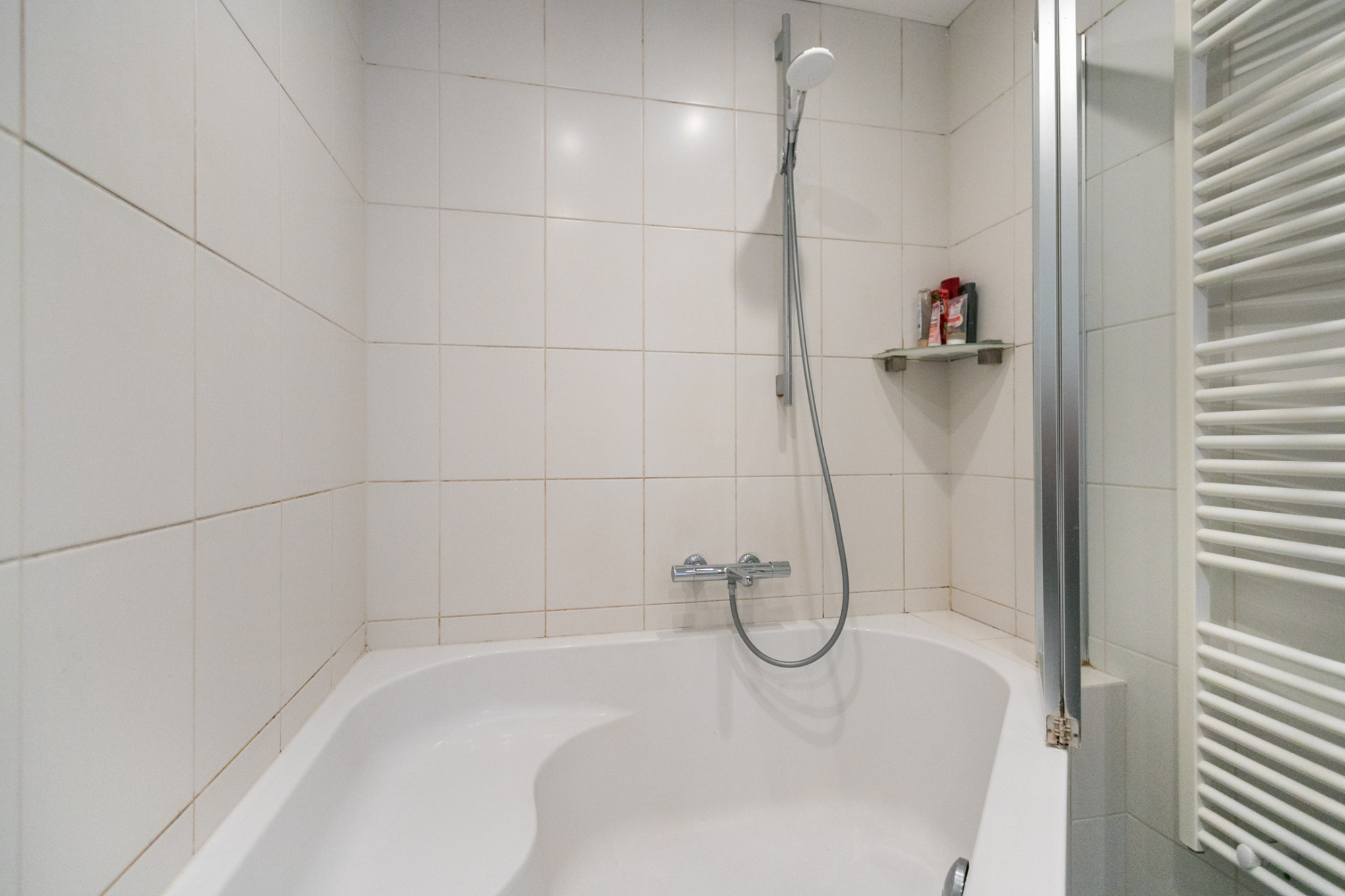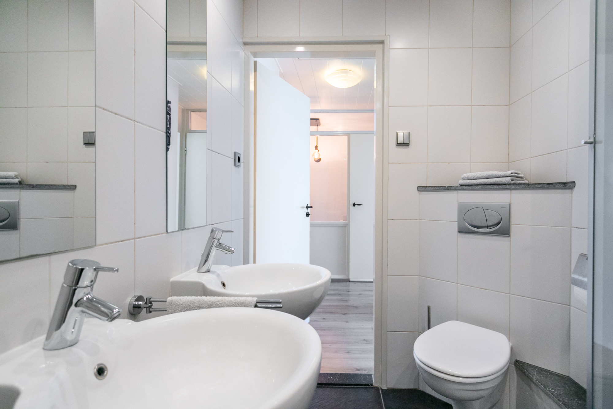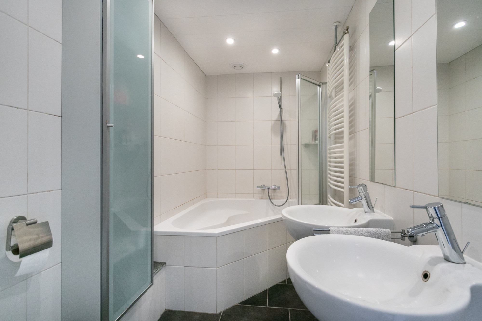 De badkamer heeft een luxe hoekbad, douchescherm, twee ronde wastafels, design radiator en een vrij hangend toilet.