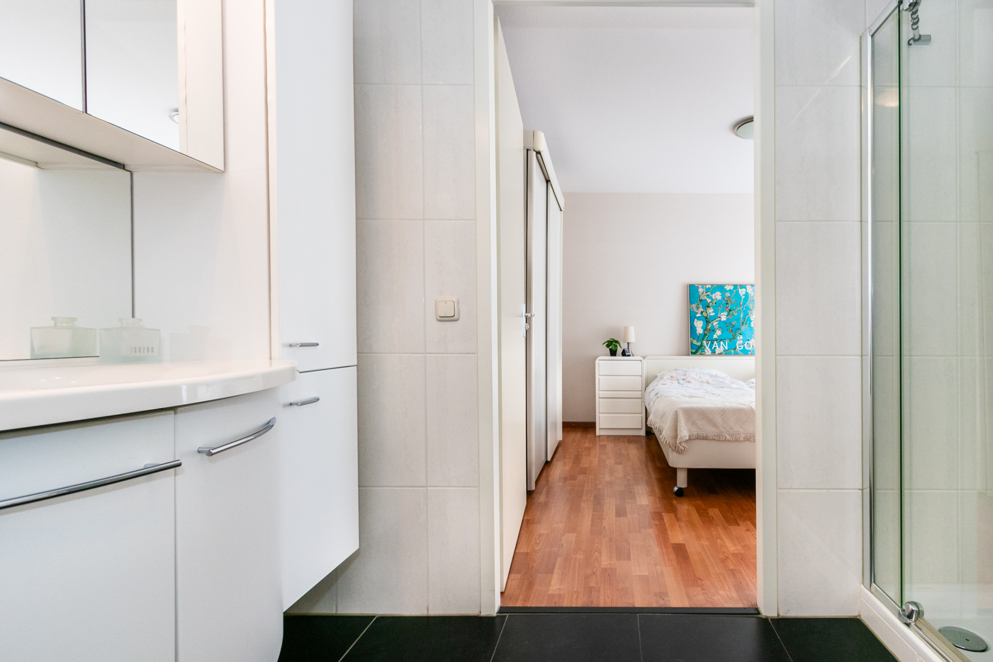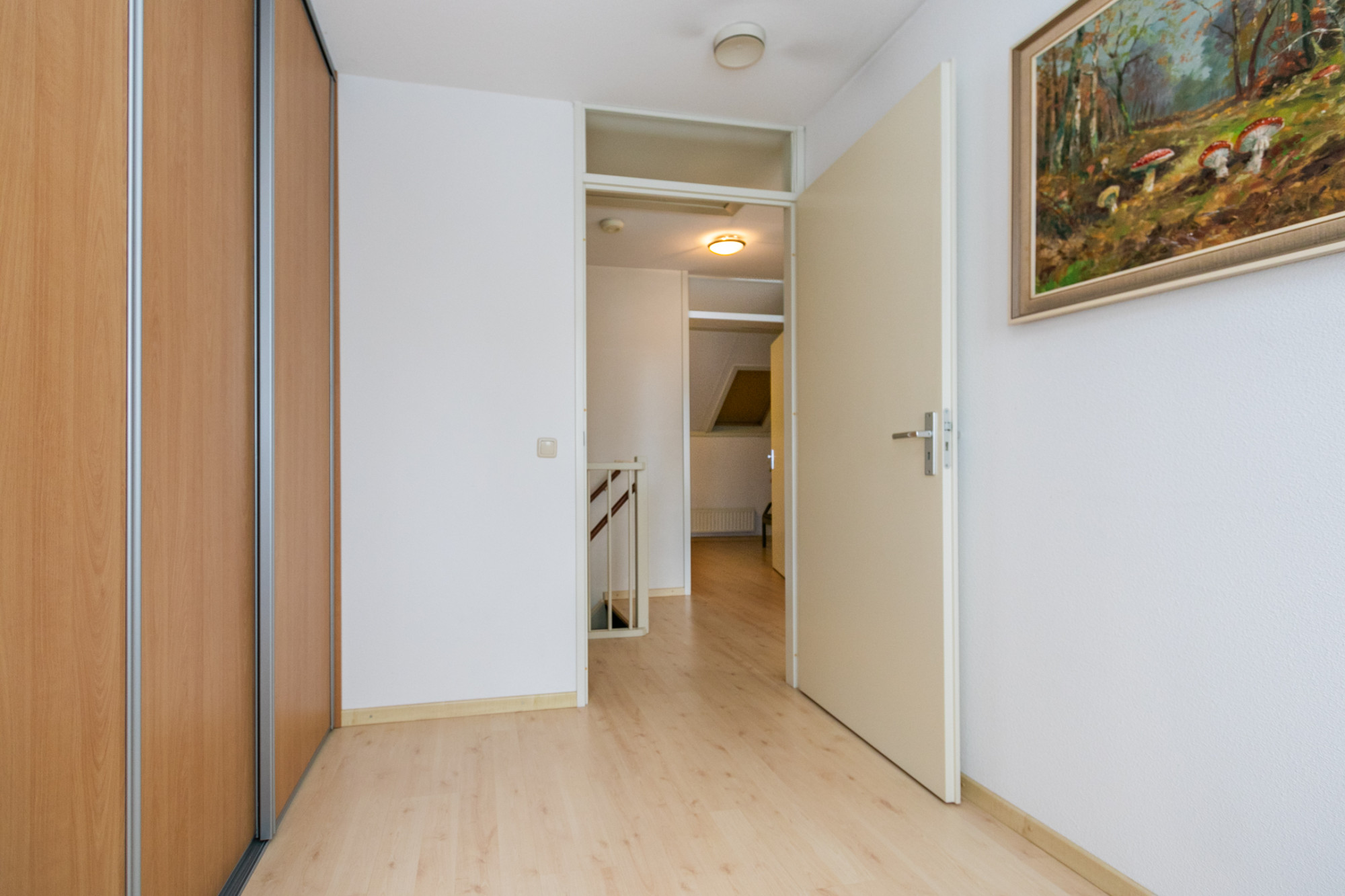 Op de eerste verdieping vind je de overige drie slaapkamers. Twee slaapkamers van gelijke grootte waarvan er één toegang heeft tot het balkon. De grotere derde slaapkamer wordt momenteel gebruikt als werk/hobbykamer. Ook beschikt deze verdieping over een saunaruimte voor ultieme ontspanning. Deze ruimte beschikt over het nodige leidingwerk om, indien gewenst, een tweede badkamer met wastafel en douche te realiseren. Tegenover de saunaruimte bevindt zich nog een separaat toilet met fontein.