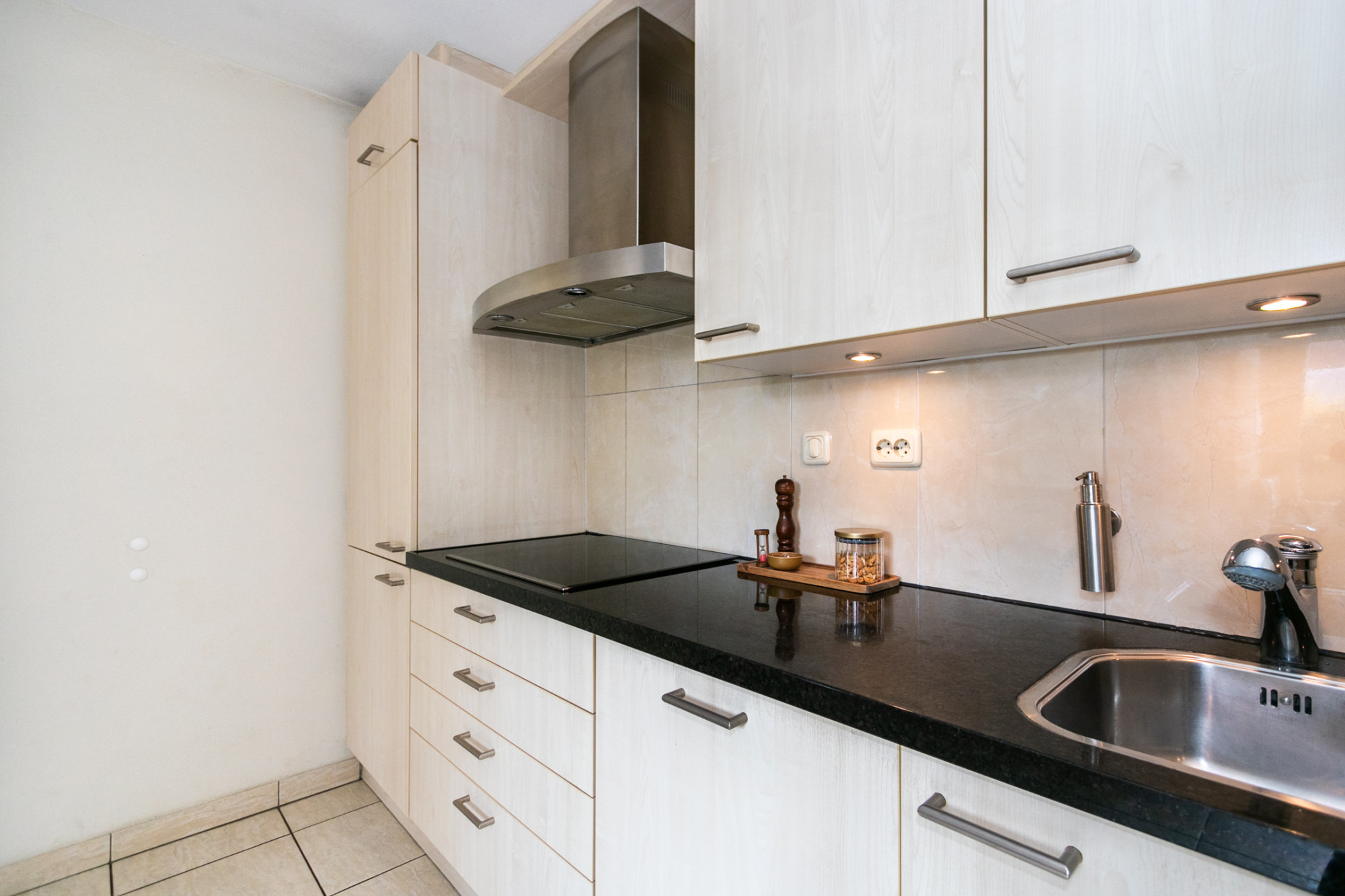 Via de entree kom je in de ruime en lichte woonkamer met open keuken. De woonkamer is zowel aan de voorzijde als aan de zijkant van de woning voorzien van een grote raampartij en heeft aan de achterzijde openslaande deuren die direct toegang geven tot de tuin. De keuken, met granieten werkblad, is voorzien van een 4-pits inductiekookplaat en inbouwapparatuur zoals een vaatwasser, combi-oven (grill), koel/vriescombinatie en afzuigkap.