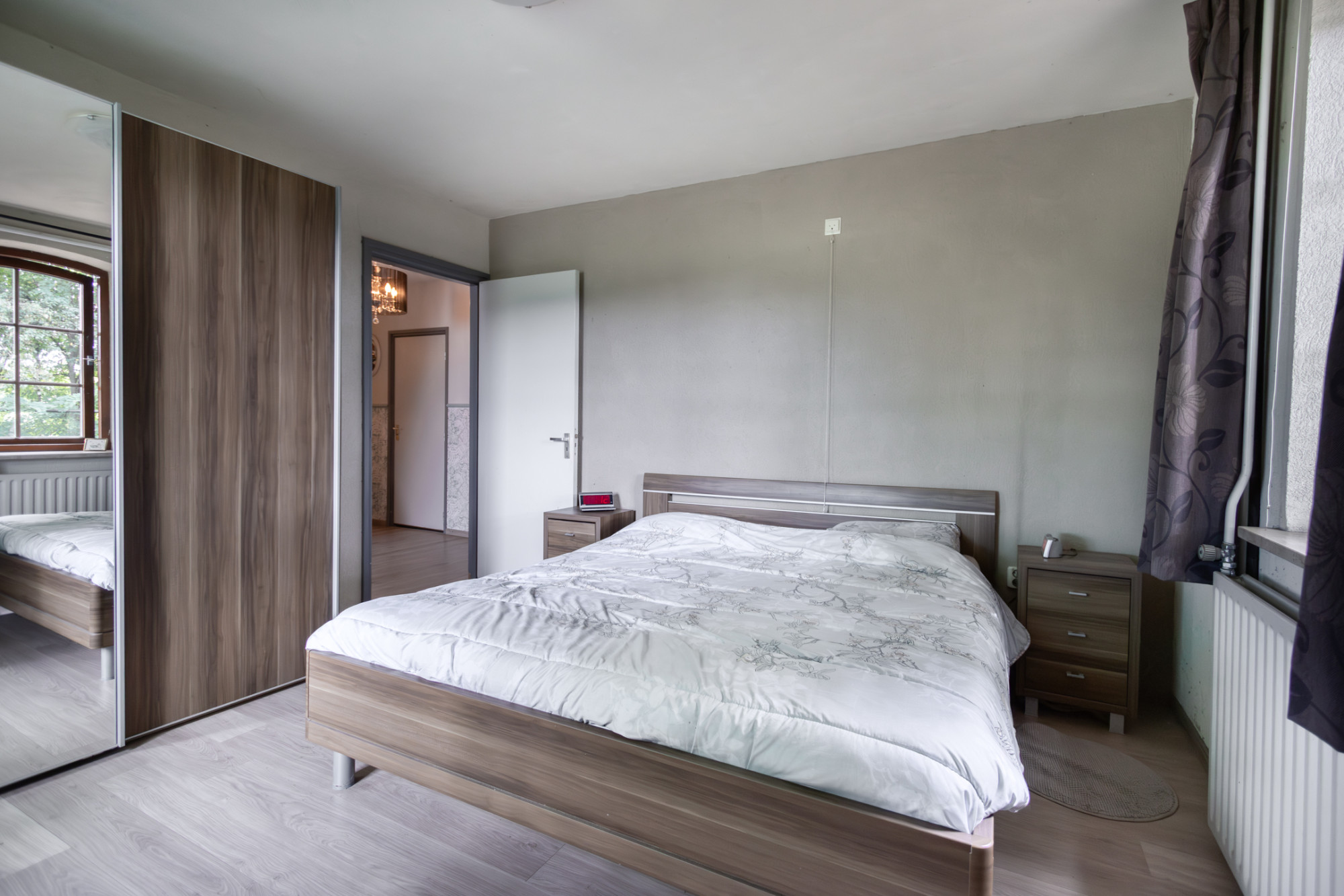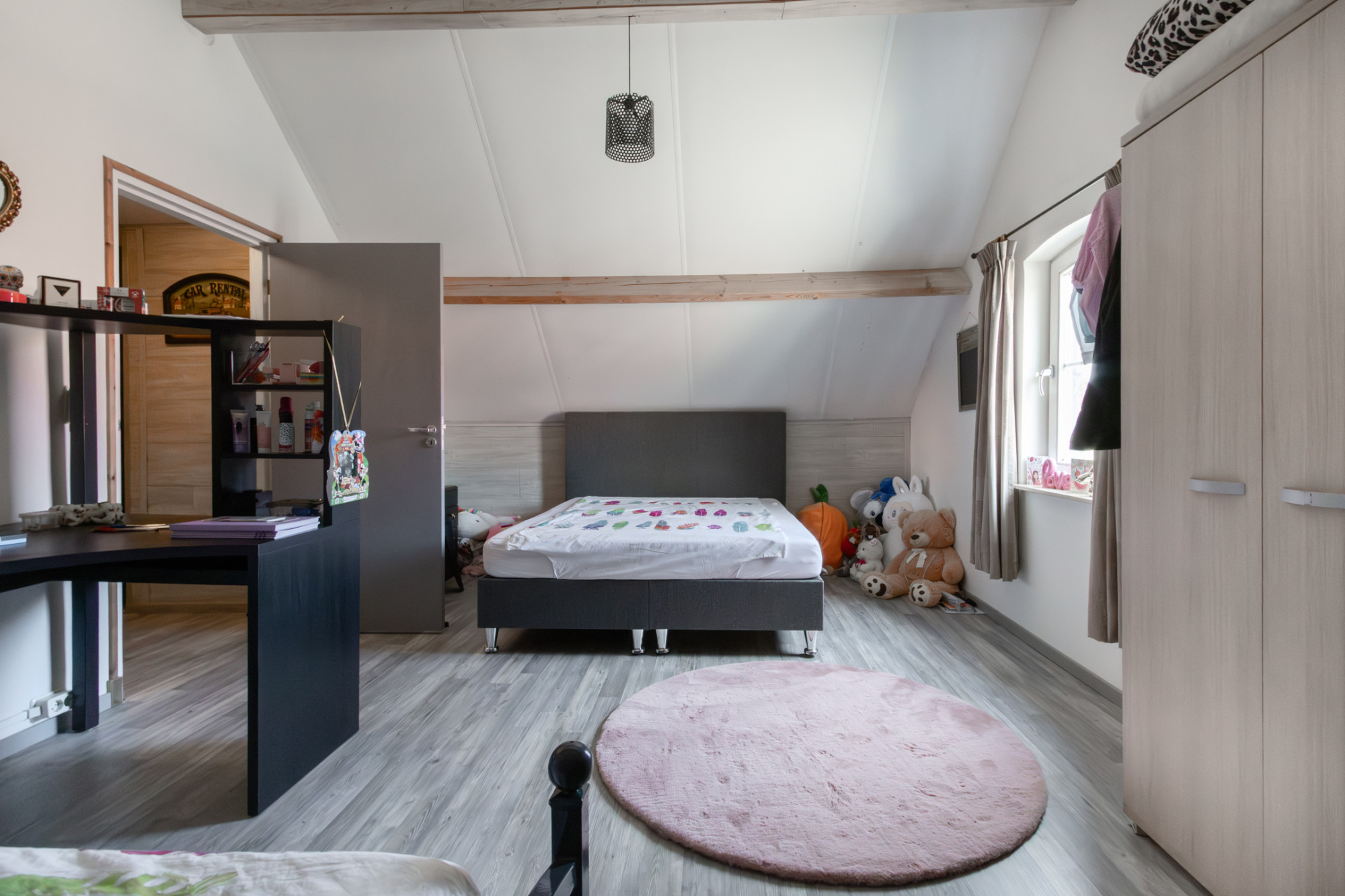 Op de eerste verdieping biedt de overloop toegang tot een grote slaapkamer en een zolder. In de slaapkamer ligt een laminaatvloer.