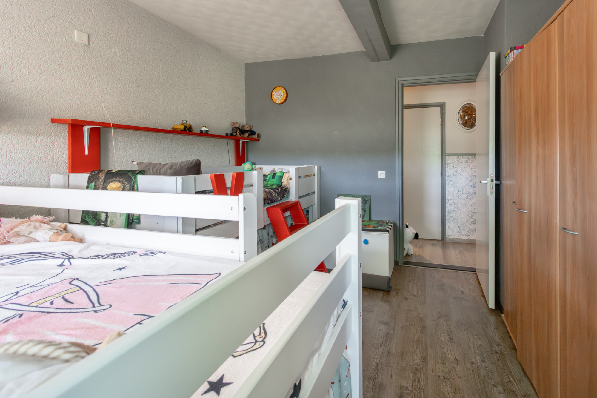 De slaapkamer is voorzien van een mooie laminaatvloer en lichte wandafwerking.