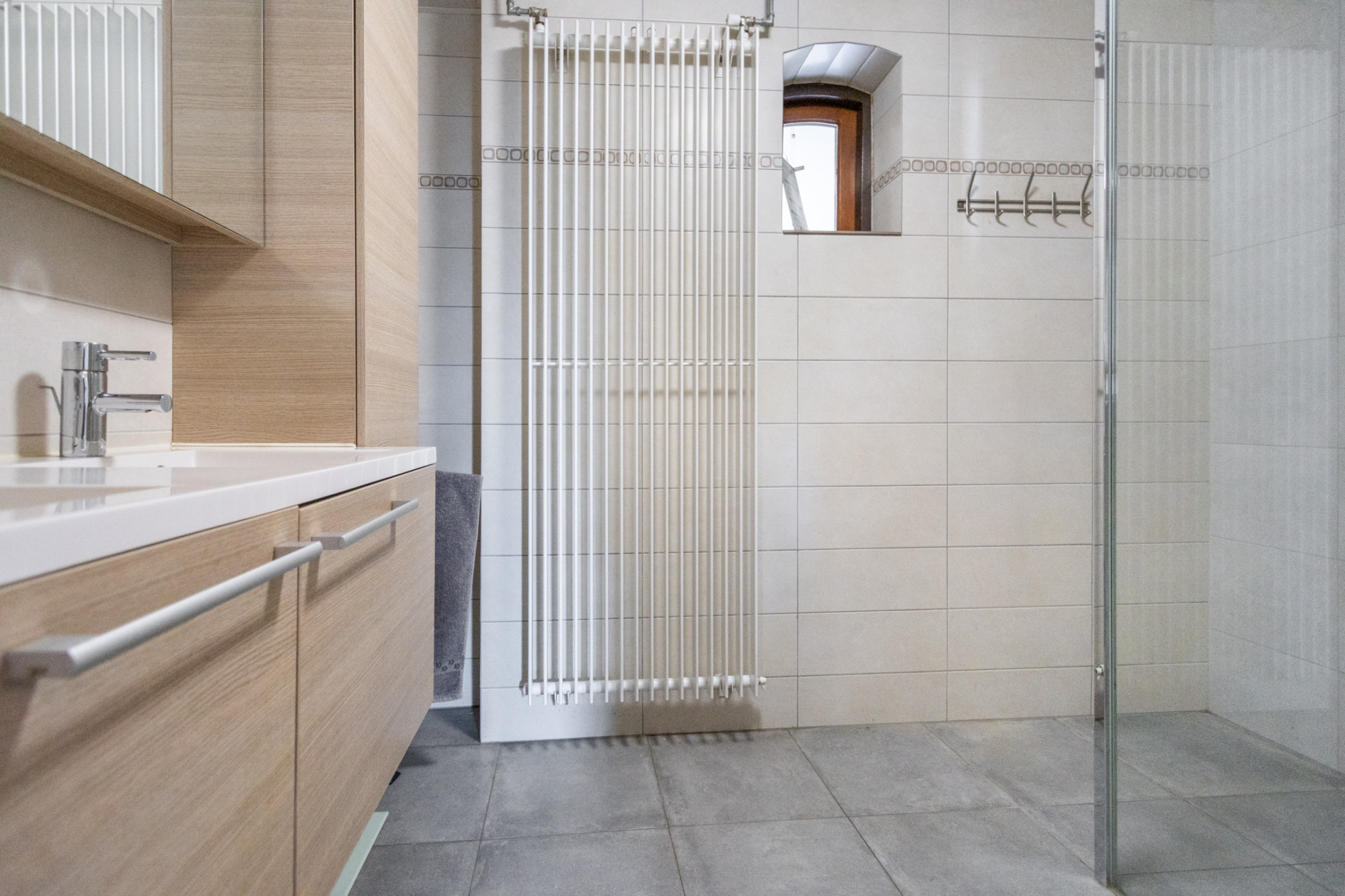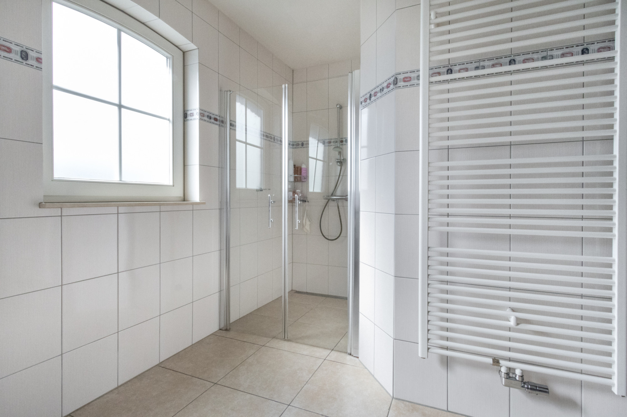 De badkamer is uitgerust met een inloopdouche en een dubbel wastafelmeubel. De ruimte wordt verwarmd met vloerverwarming en een extra wandradiator.