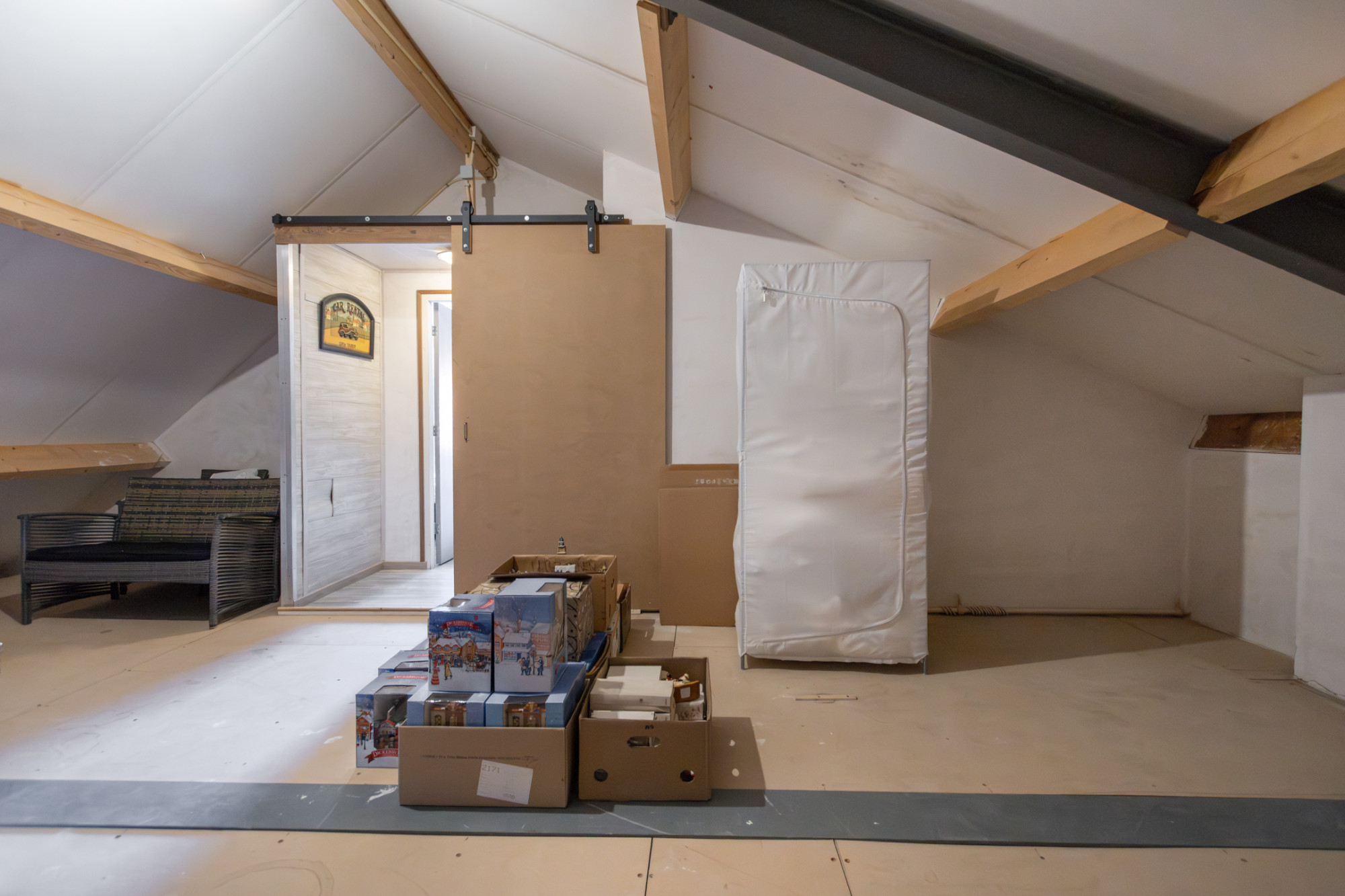 Op de zolder is veel bergruimte en zit de aansluiting van de cv-ketel (Nefit 2015). Ook zit er een boiler die i.c.m. de cv-ketel werkt en de zonnecollectoren. In een aparte bergruimte bevindt zich de omvormer van de 30 zonnepanelen.