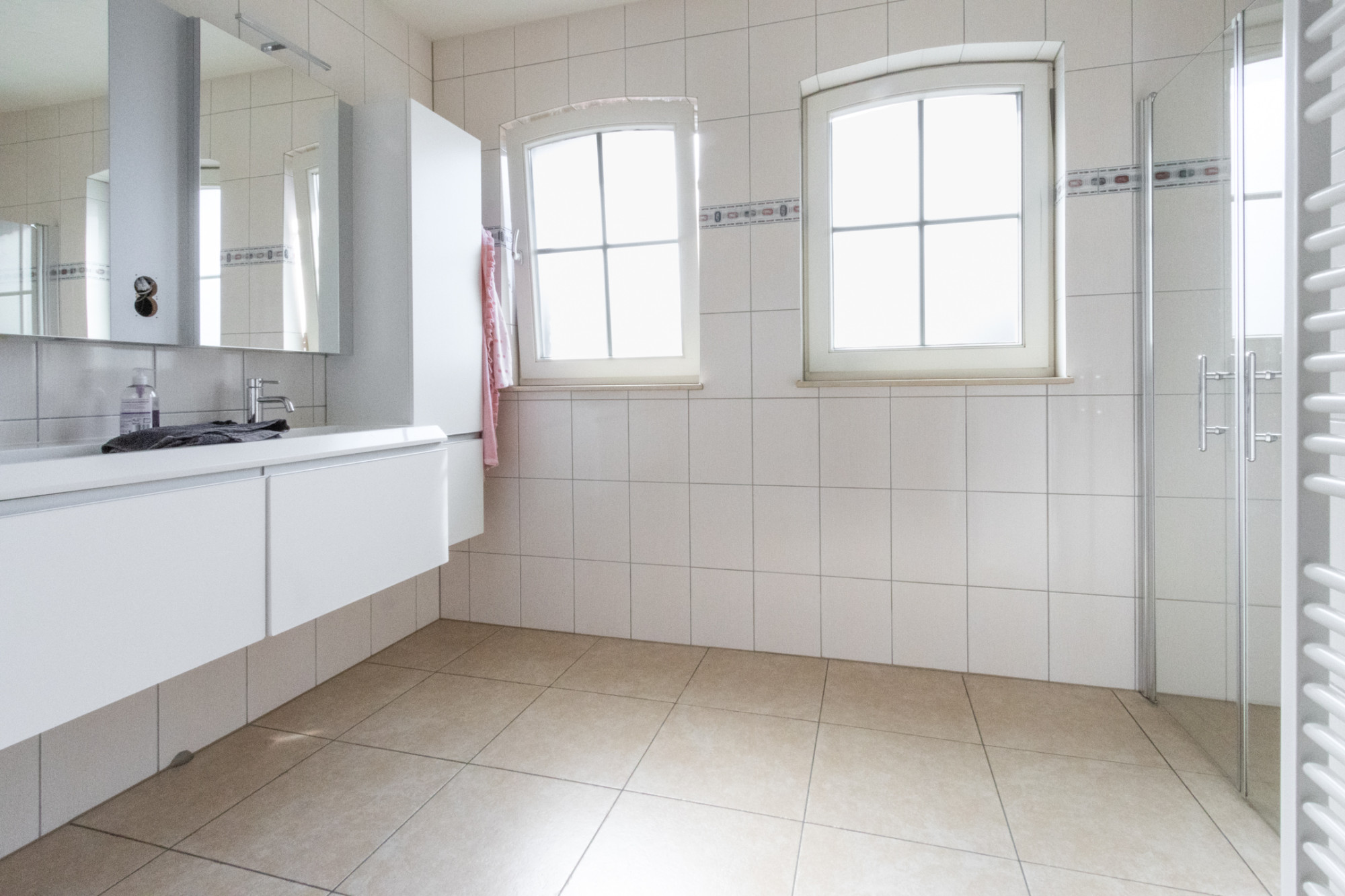 De badkamer heeft een dubbel wastafelmeubel, inloopdouche en wandradiator.