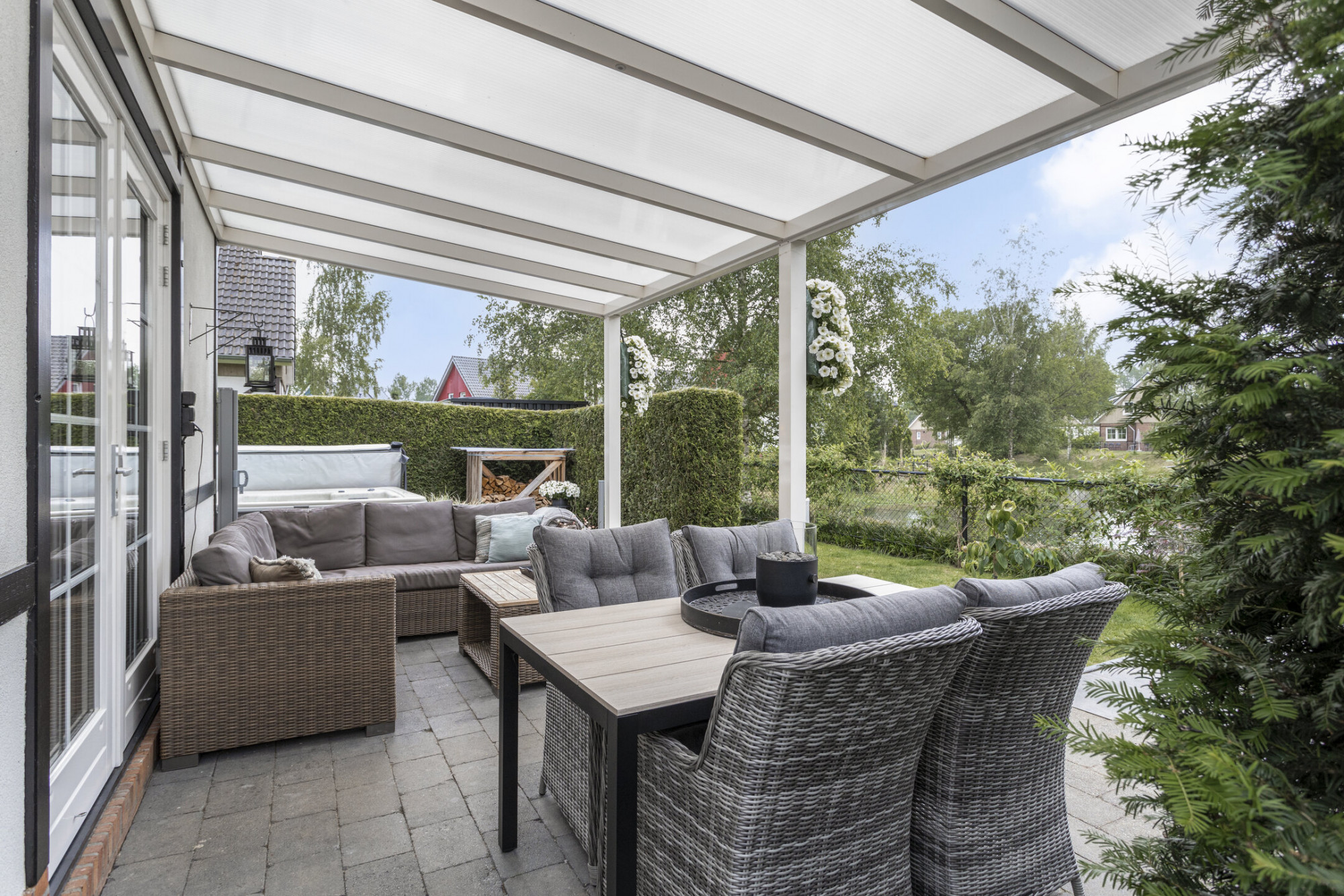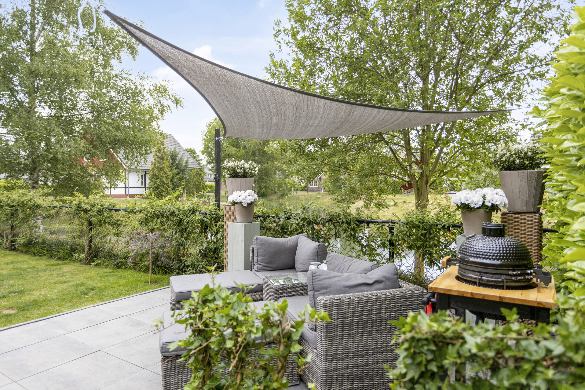 De geheel omheinde tuin is voorzien van diverse betegelde terrasjes, beplanting en gazon. Ook is er een jacuzzi, die het gehele jaar door gebruikt kan worden. De tuin grenst direct aan het water en biedt veel privacy. Ook is er een grote metalen berging aanwezig voor fietsen en tuingereedschap.