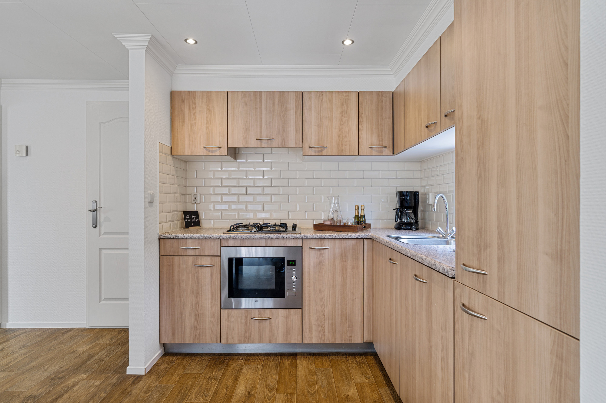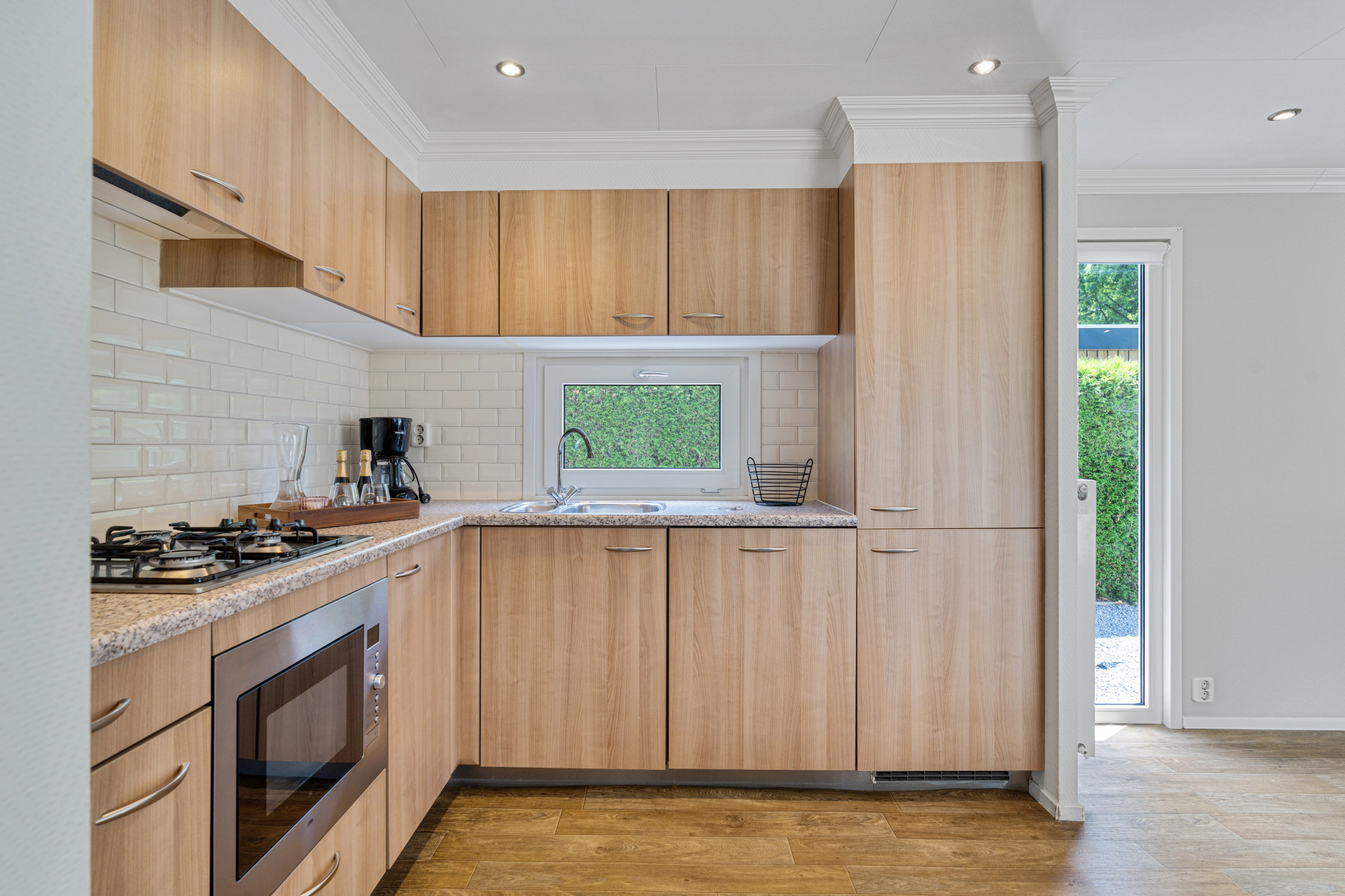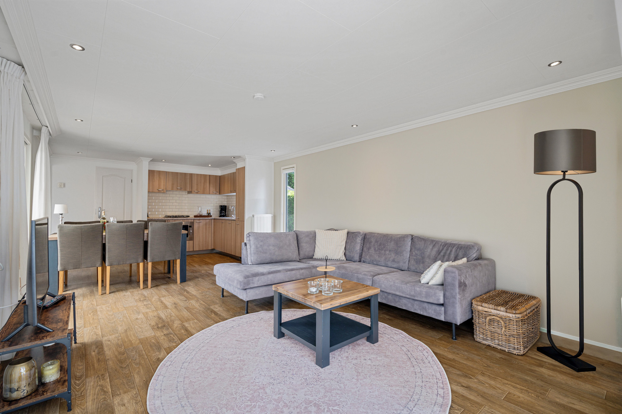 Via de hal, die toegang geeft tot de verschillende vertrekken, kom je binnen in deze goed ingedeelde woning. De gezellige woonkamer is voorzien van een pvc-vloer en dankzij de schuifpui naar de overkapping vloeien binnen en buiten naadloos in elkaar over. De open keuken is compleet uitgerust met een 4-pits gaskookplaat, combi-oven, vaatwasser, koelkast en vriezer.