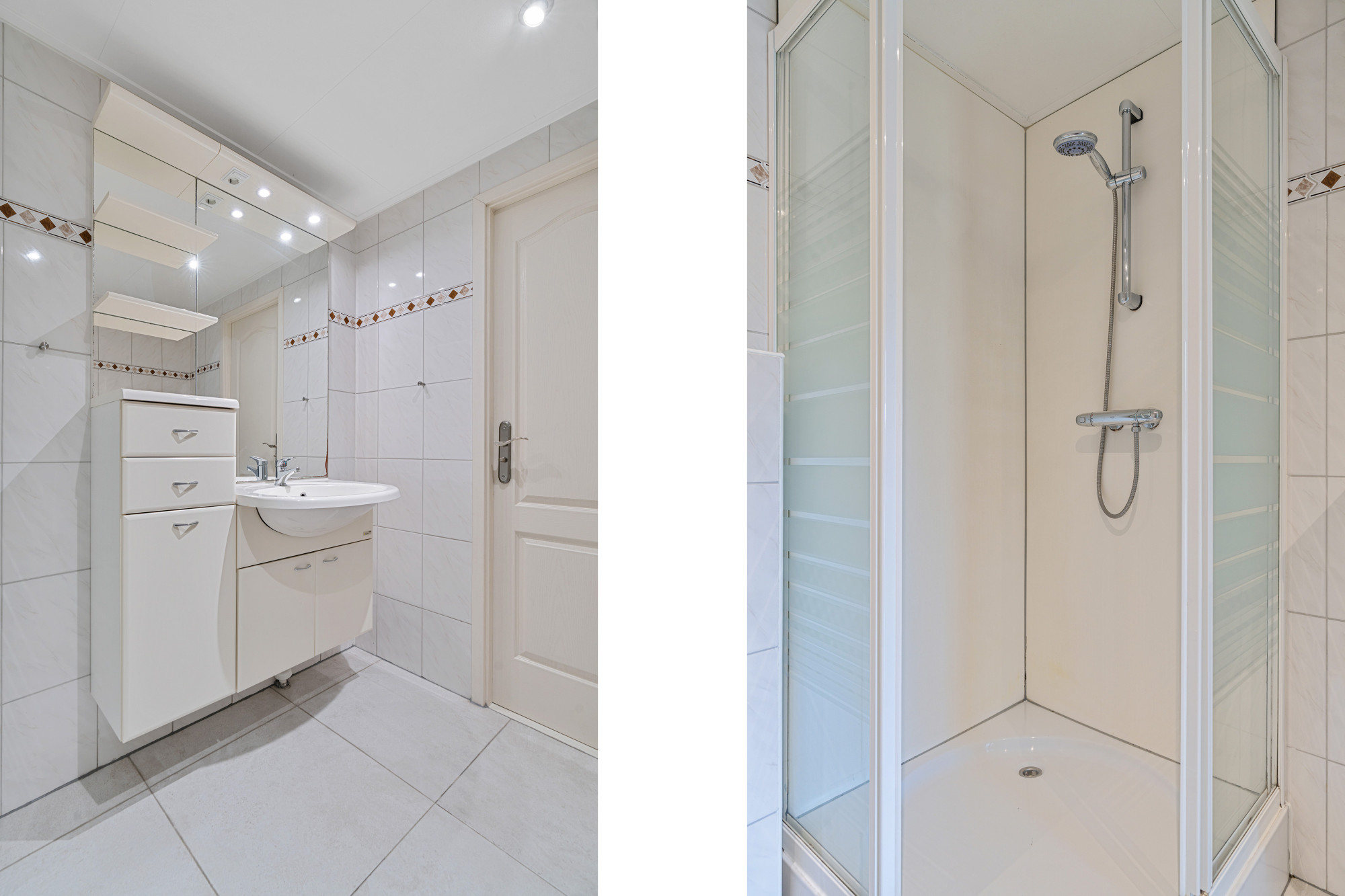 De badkamer is compact maar praktisch en beschikt over een douche, toilet en badmeubel.