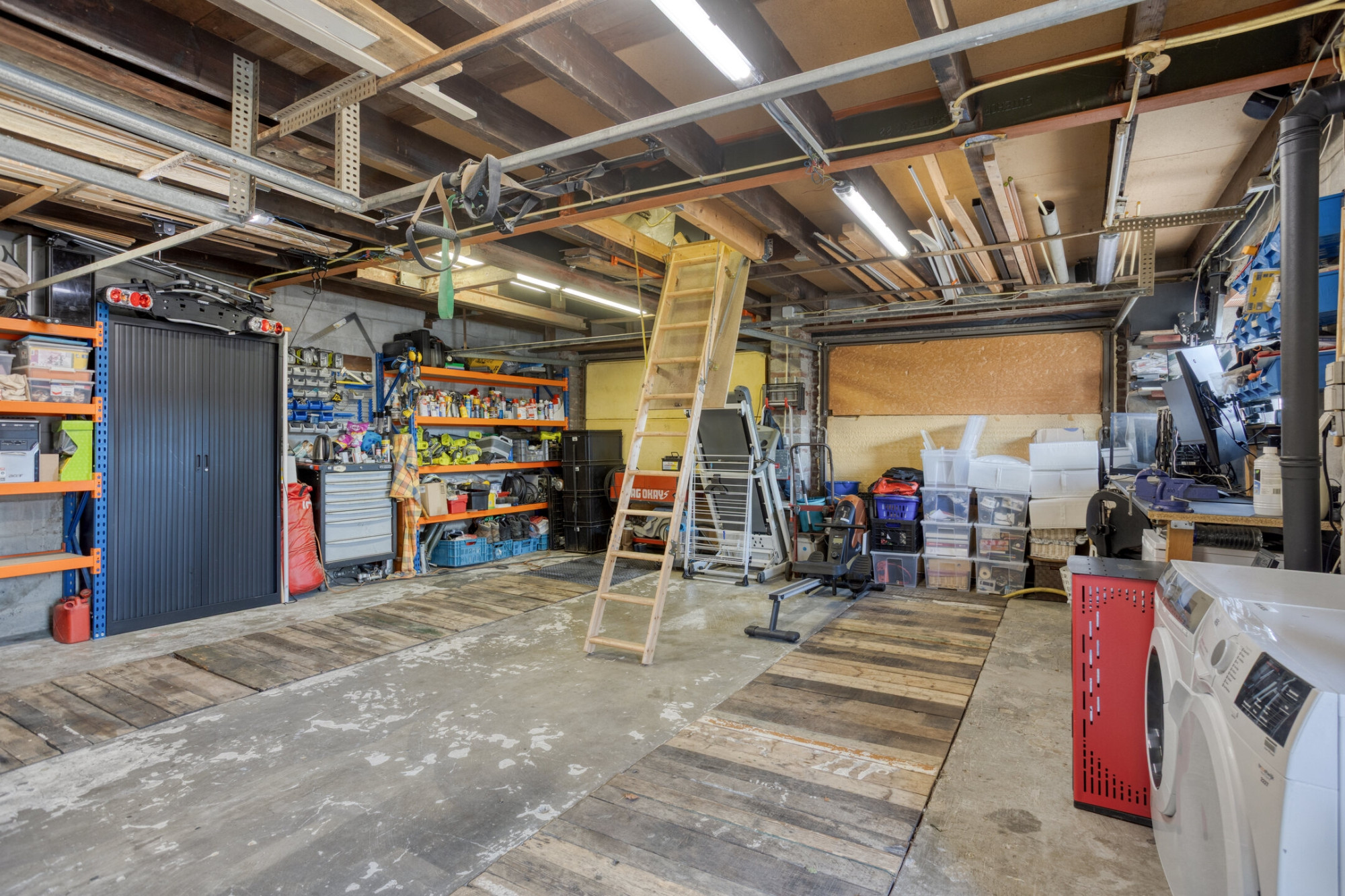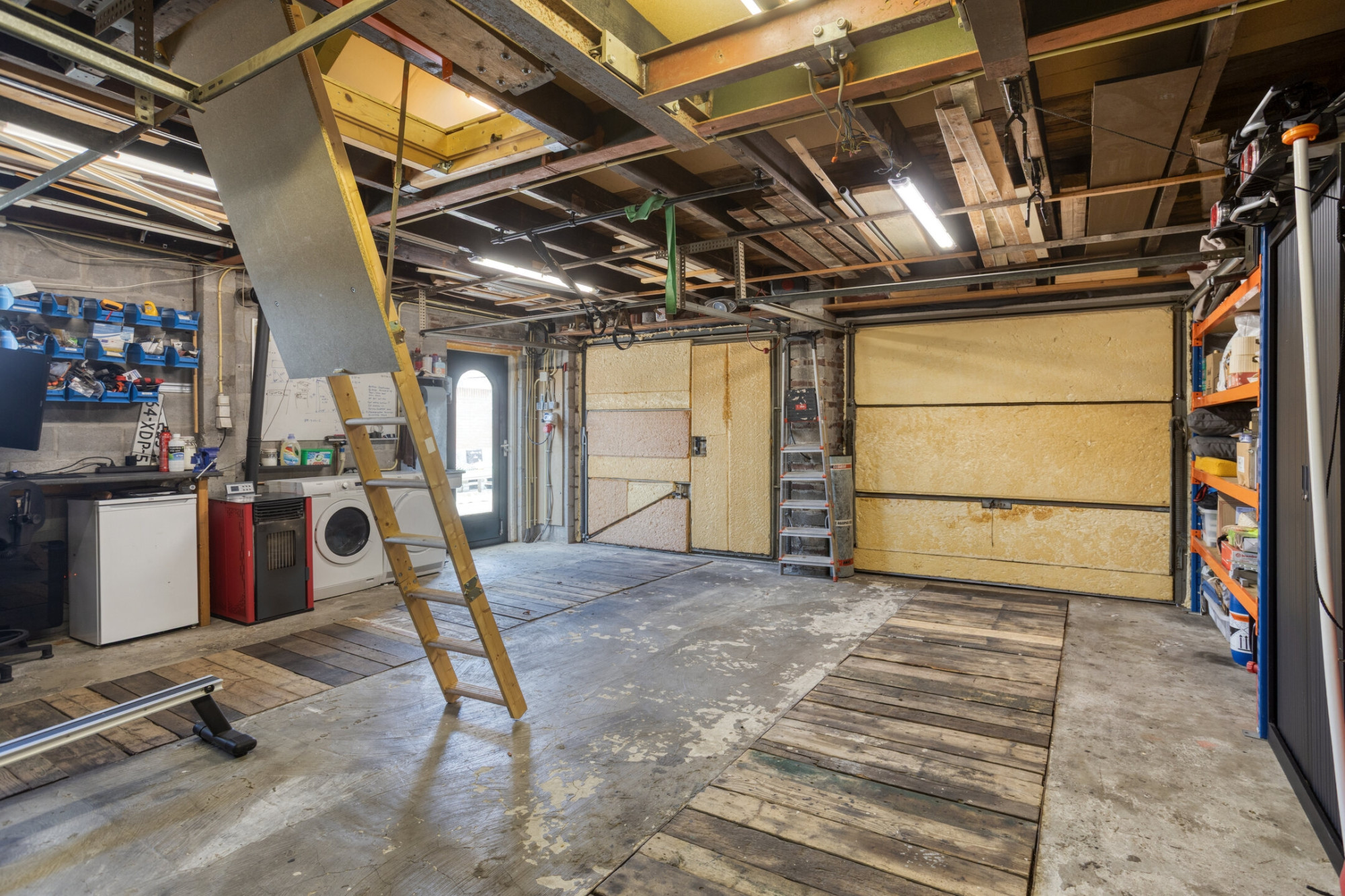 Zolder: via vlizotrap bereikbare geïsoleerde zolder. De garage beschikt over twee kantelpoorten en heeft een ruime berging op de vliering (15m2).