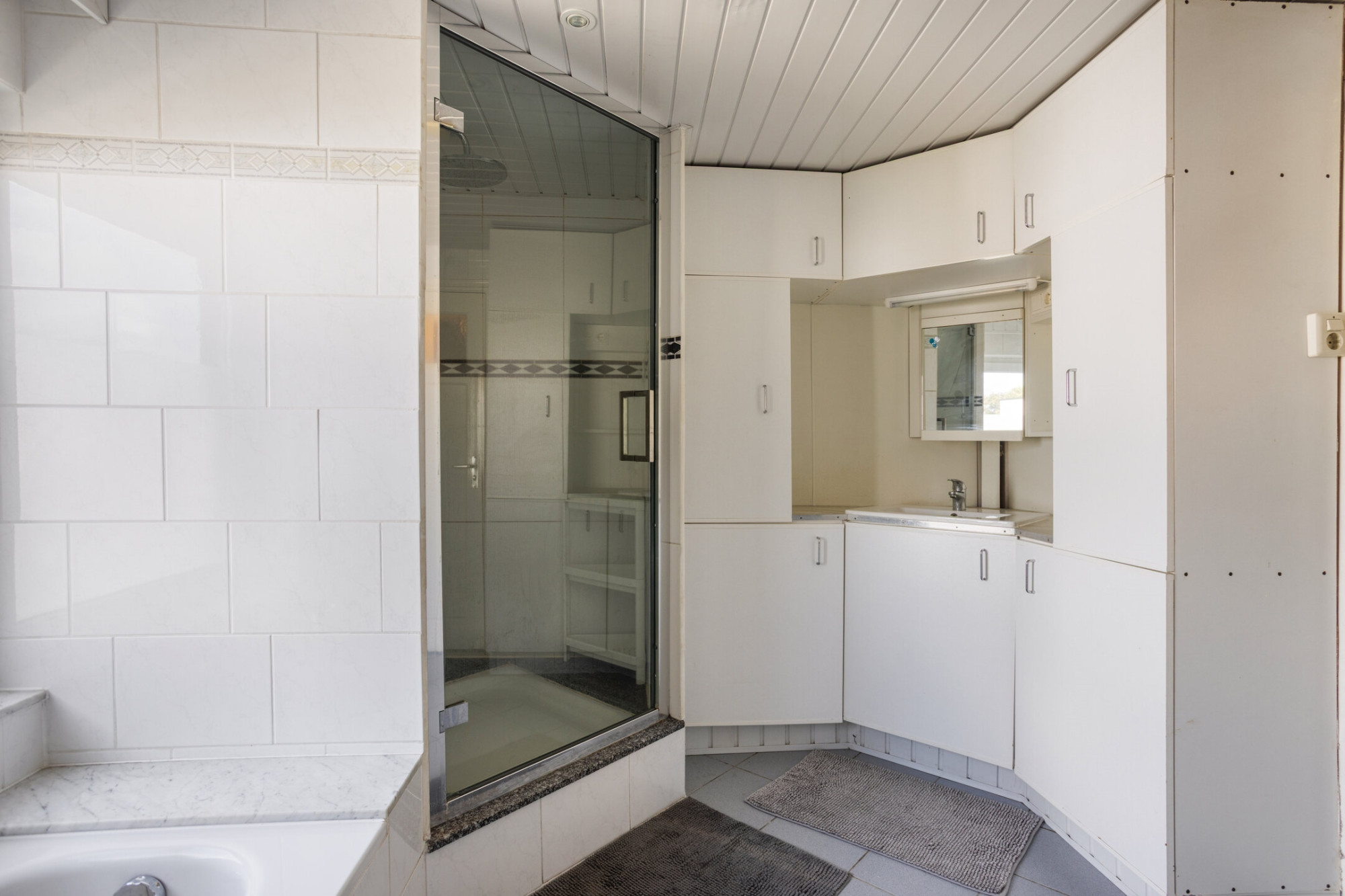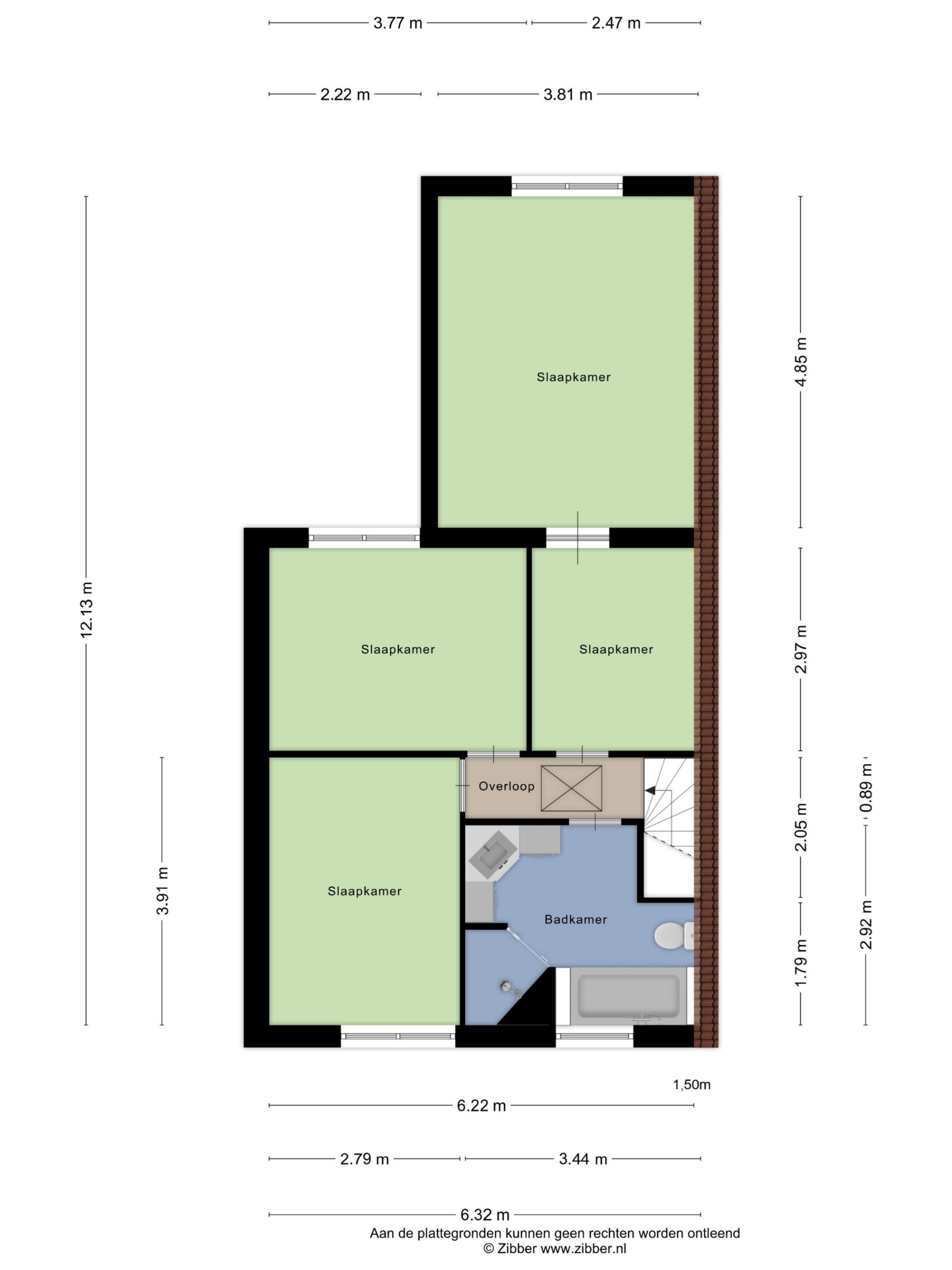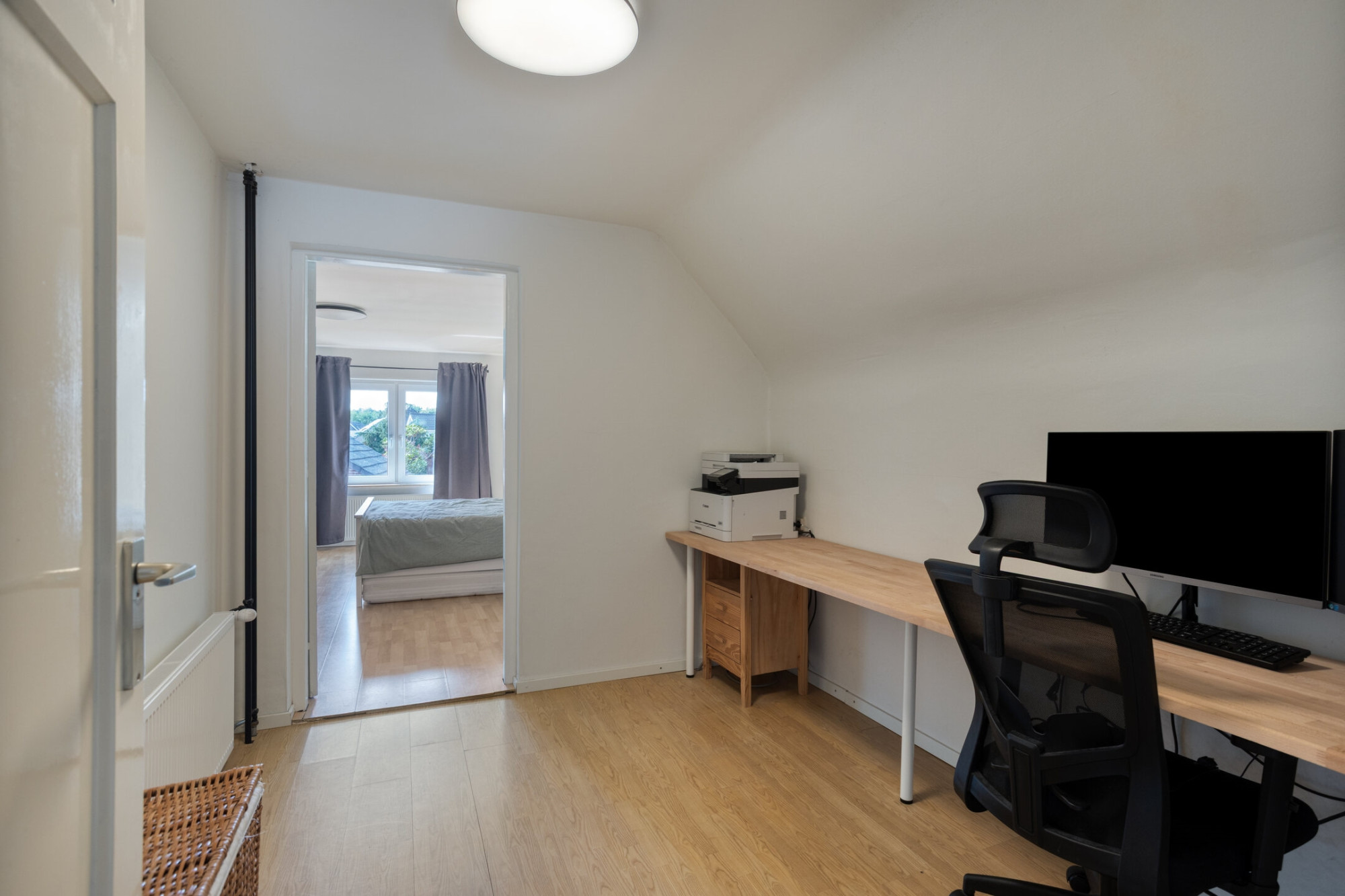 Verdieping: overloop naar 3 slaapkamers; kantoorkamer; badkamer met ligbad, douche, toilet en wastafel.