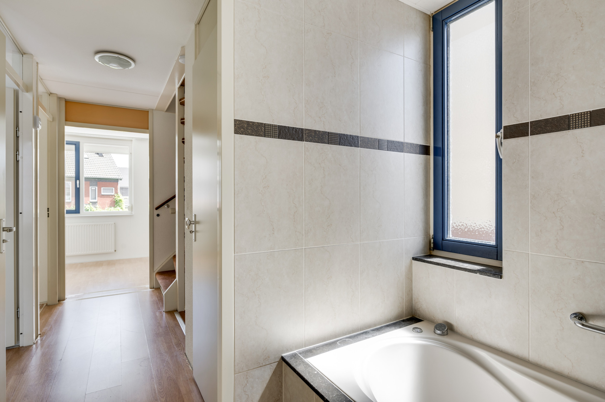 De overloop biedt toegang tot de eerste drie ruime slaapkamers, de badkamer en een bergkast met de cv-ruimte. De moderne badkamer is geheel betegeld en uitgerust met een ligbad/douche combinatie met whirlpool, een extra toilet, wastafel met meubel, designradiator én elektrische vloerverwarming. De riante slaapkamer aan de voorzijde beschikt over een leuk dakterras, welke toegankelijk is via dubbele openslaande deuren. In de bergkast is de cv-opstelling (Vaillant HR, eigendom, ca. 2005) netjes weggewerkt.