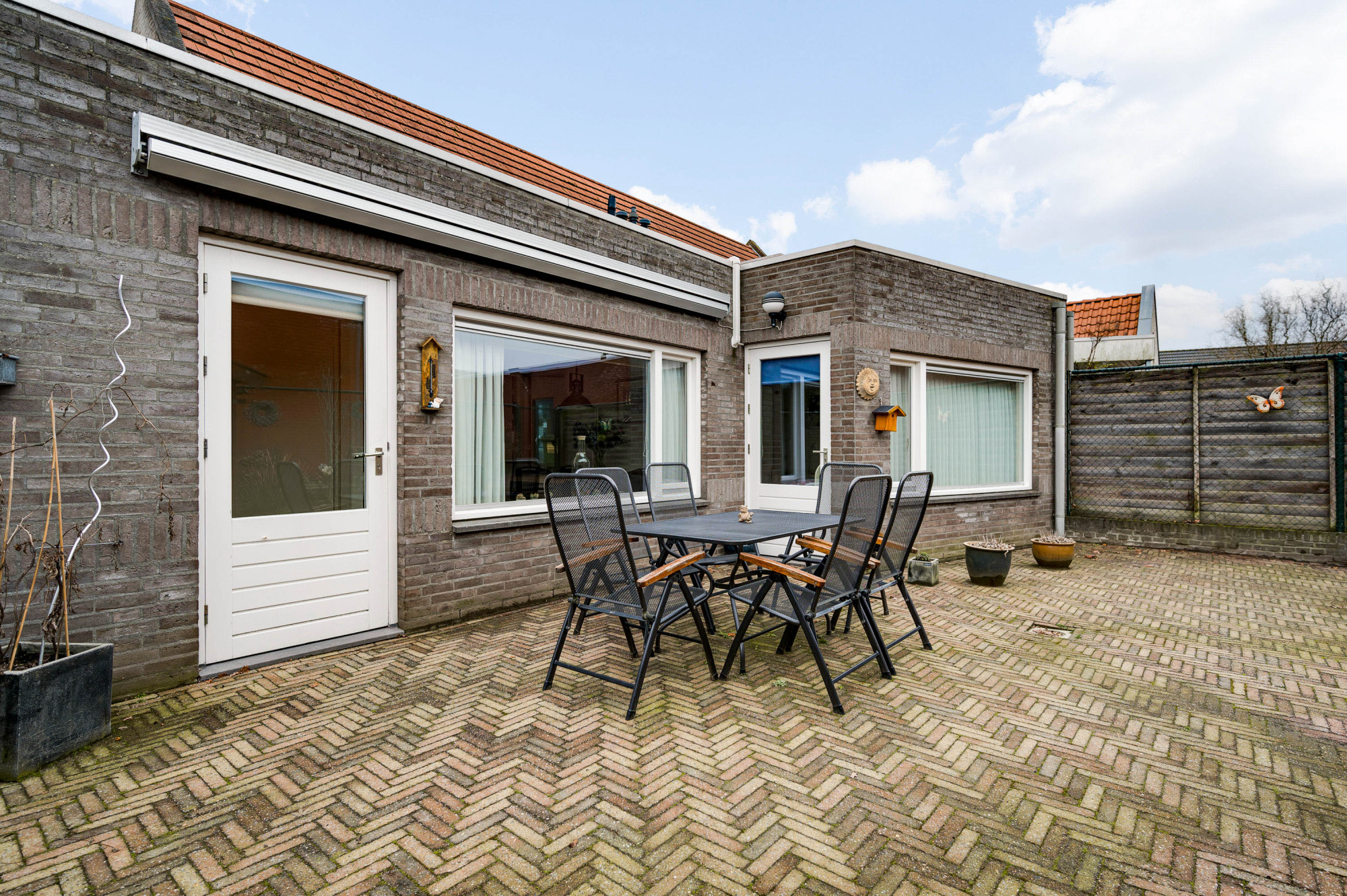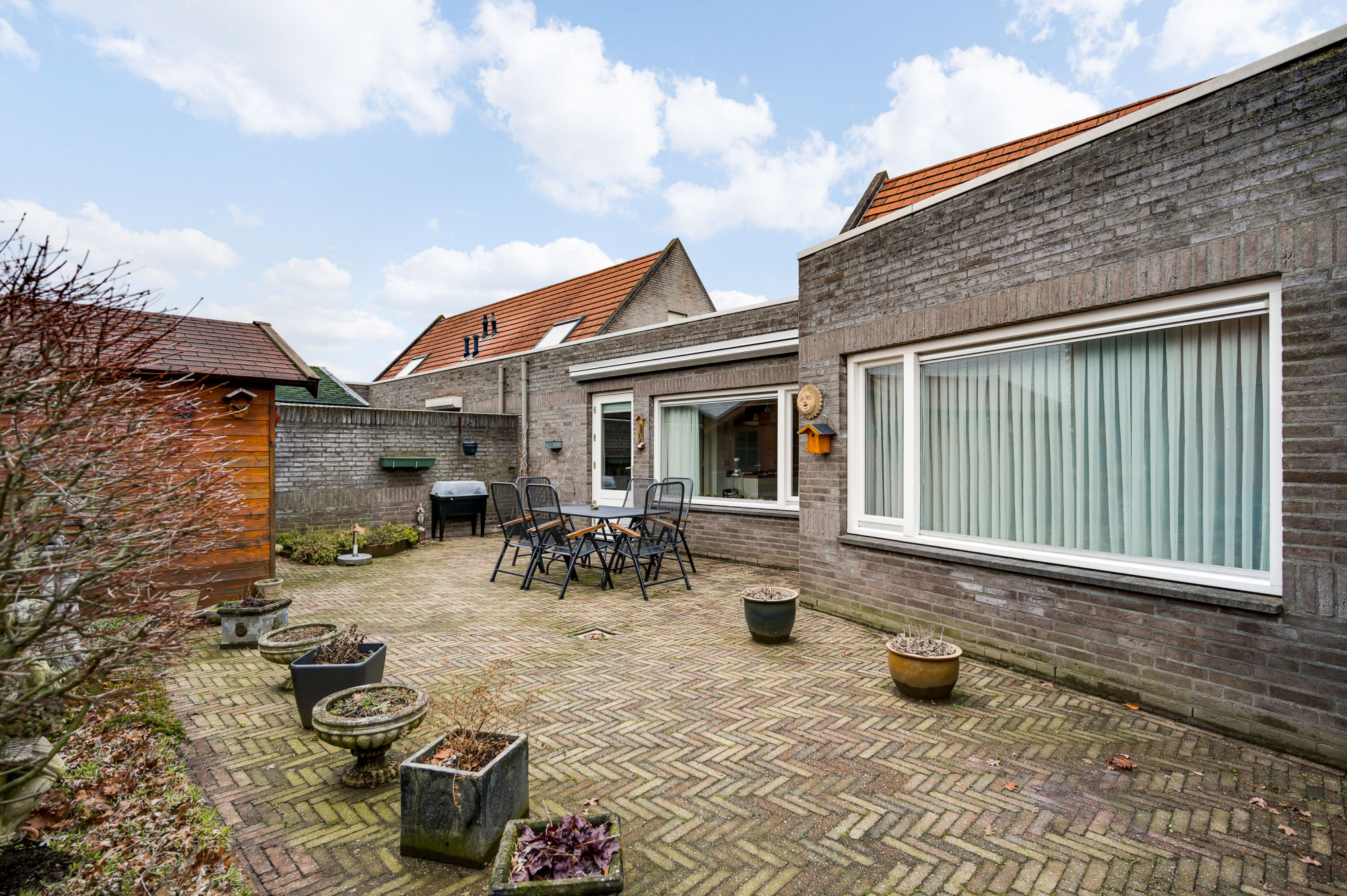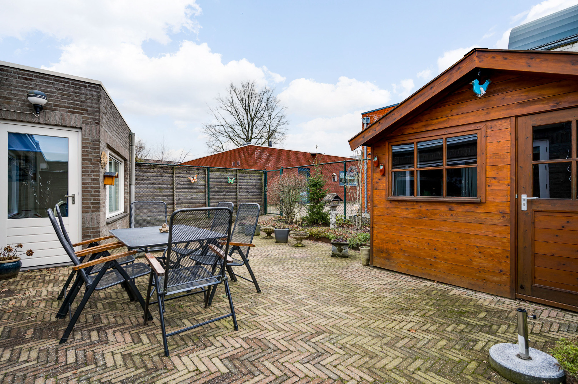 De voortuin met oprit biedt parkeergelegenheid op eigen terrein en leidt naar de berging. De achtertuin is zonnig, onderhoudsvriendelijk aangelegd en voorzien van een elektrisch bedienbaar zonnescherm (ter overname), houten tuinhuis en onderhoudsvriendelijke bestrating