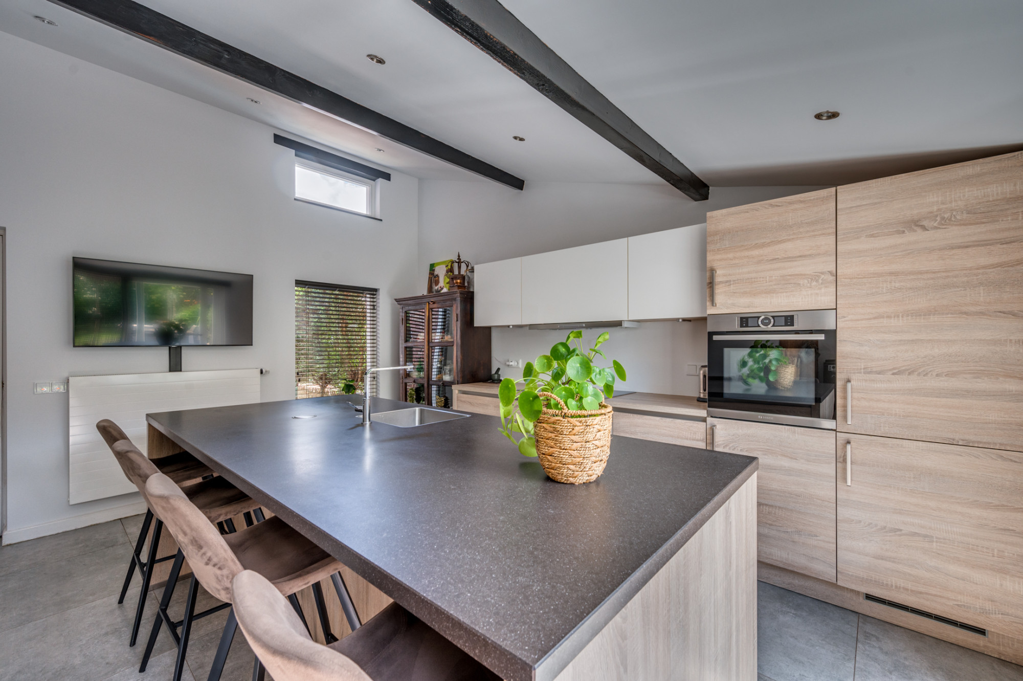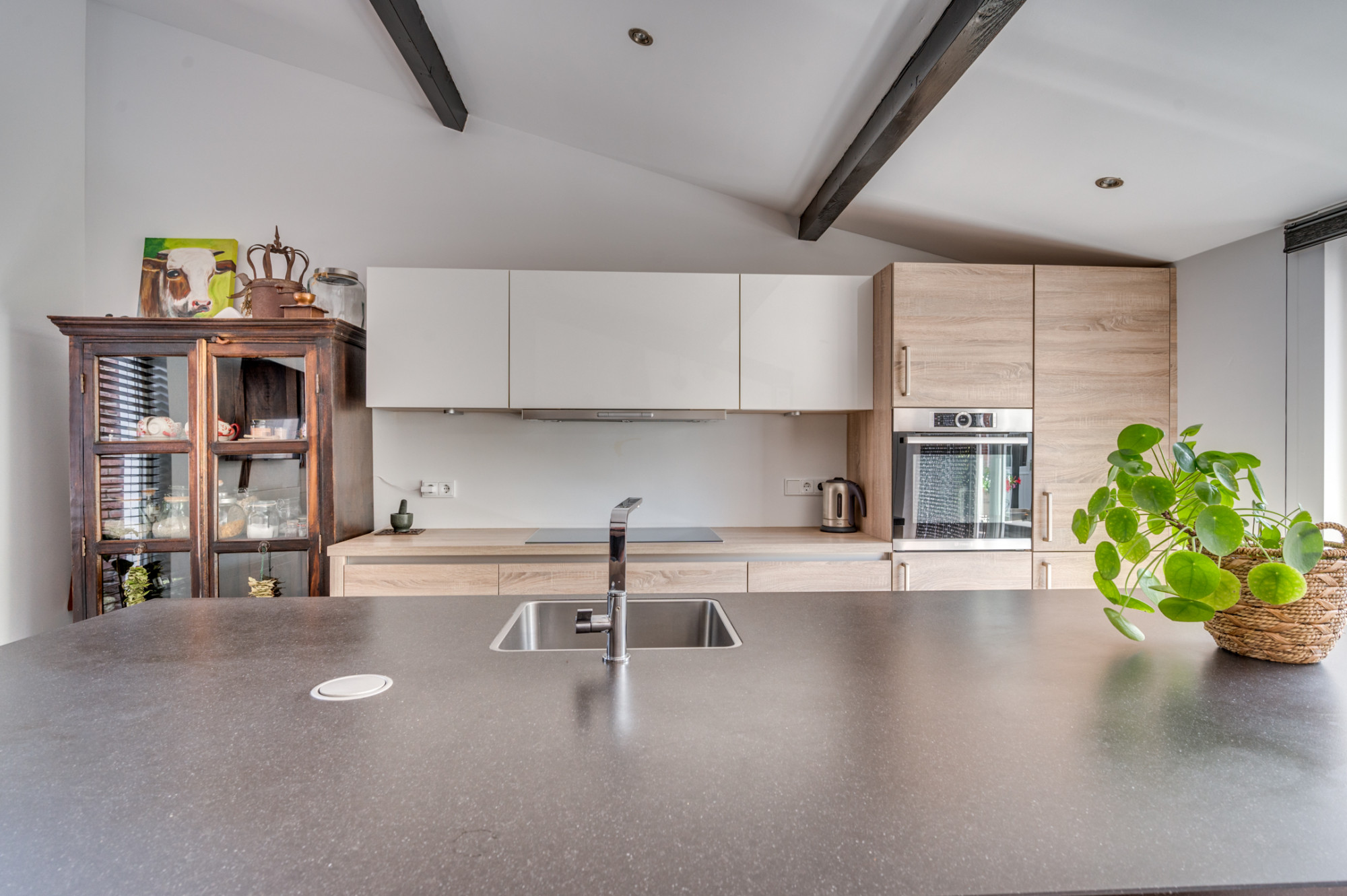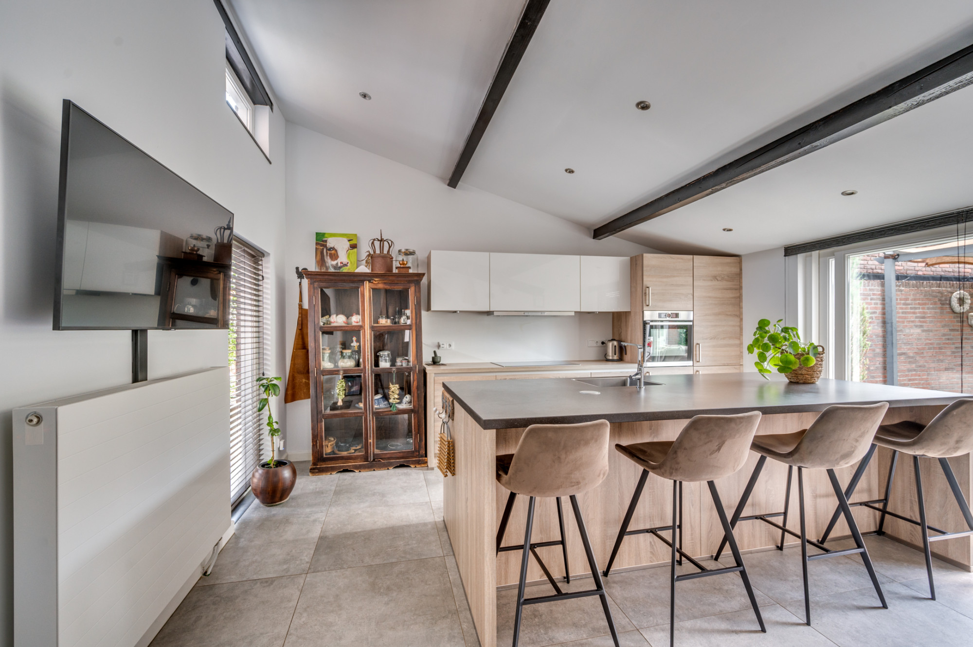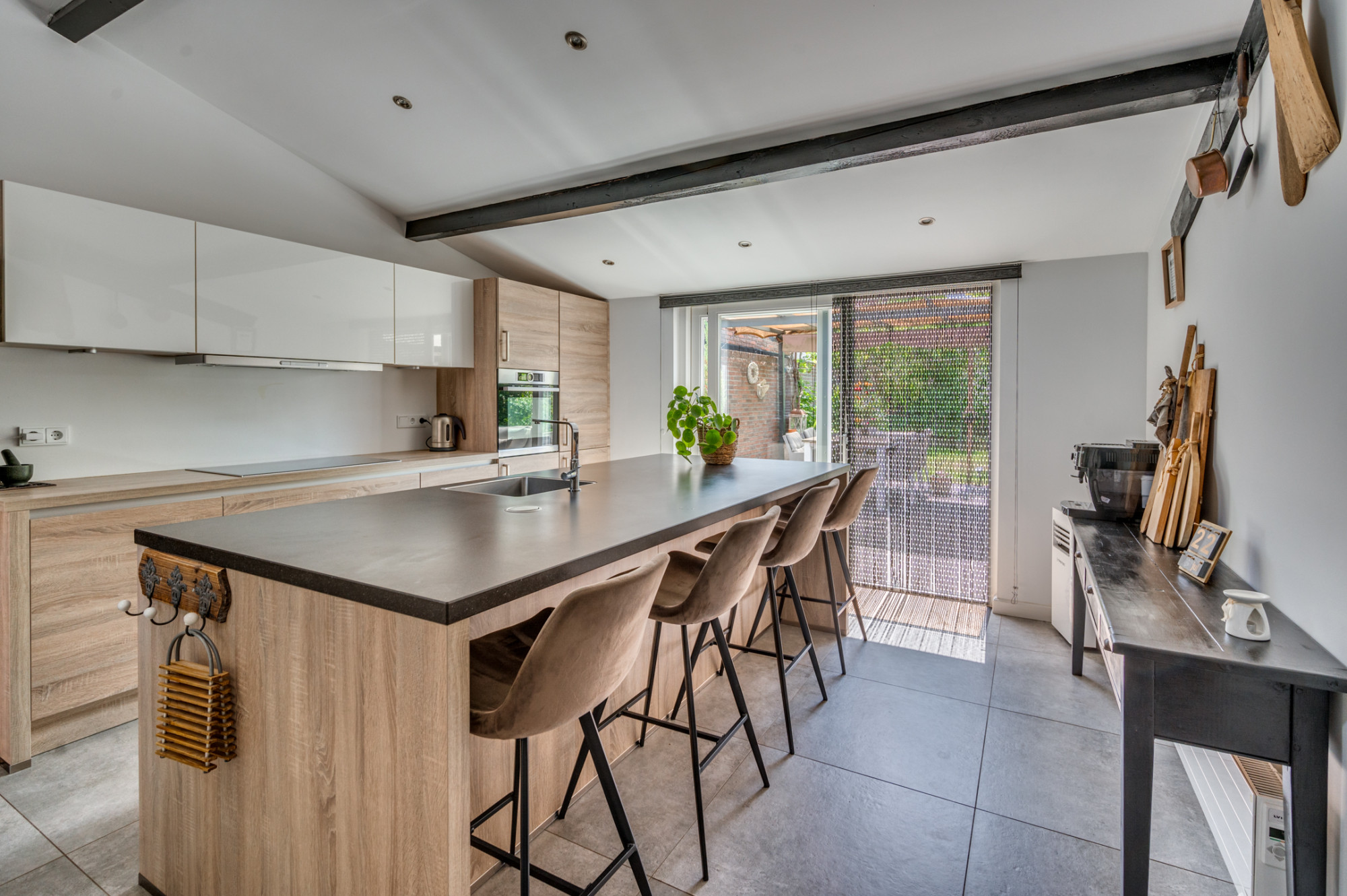 Het hart van de woning vormt de woonkeuken, geplaatst in de aanbouw. Deze ruimte is ingericht met een stijlvol eiland, hoogwaardige inbouwapparatuur, waaronder een inductiekookplaat, afzuigkap, combi-oven, koel/vries-combinatie en een vaatwasser. Een grote schuifpui zorgt voor een prachtig contact met de achtertuin. Direct aangrenzend ligt de praktische bijkeuken met witgoedaansluitingen, cv-opstelling (Vaillant VHR, huur, installatiejaar 2022) en een modern toilet. Vanuit hier is er tevens een handige loopdeur naar de achtertuin.