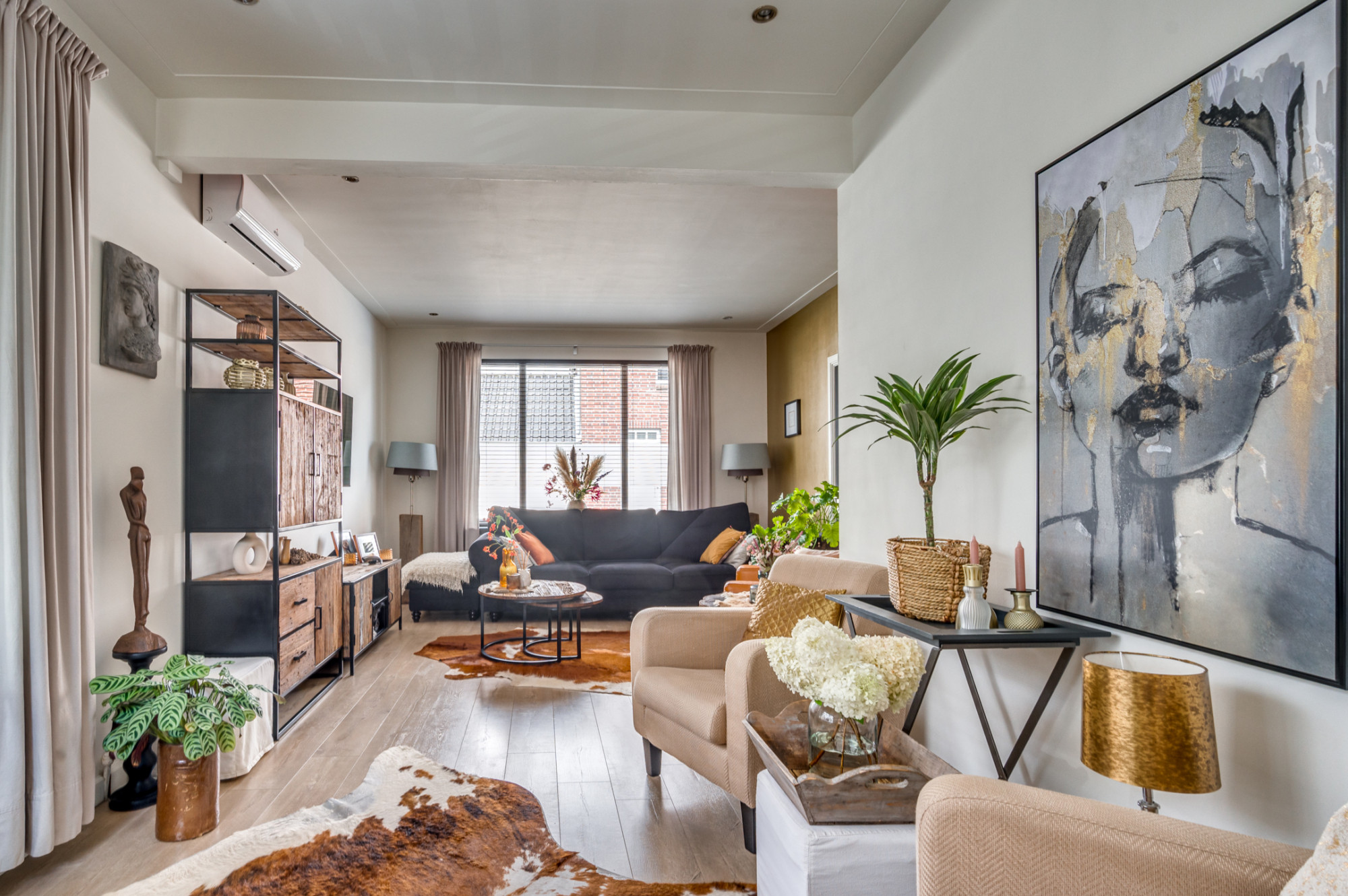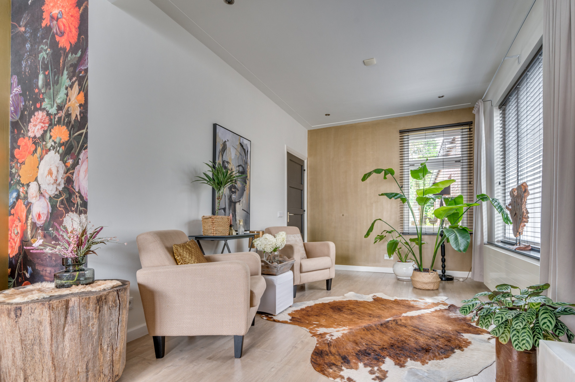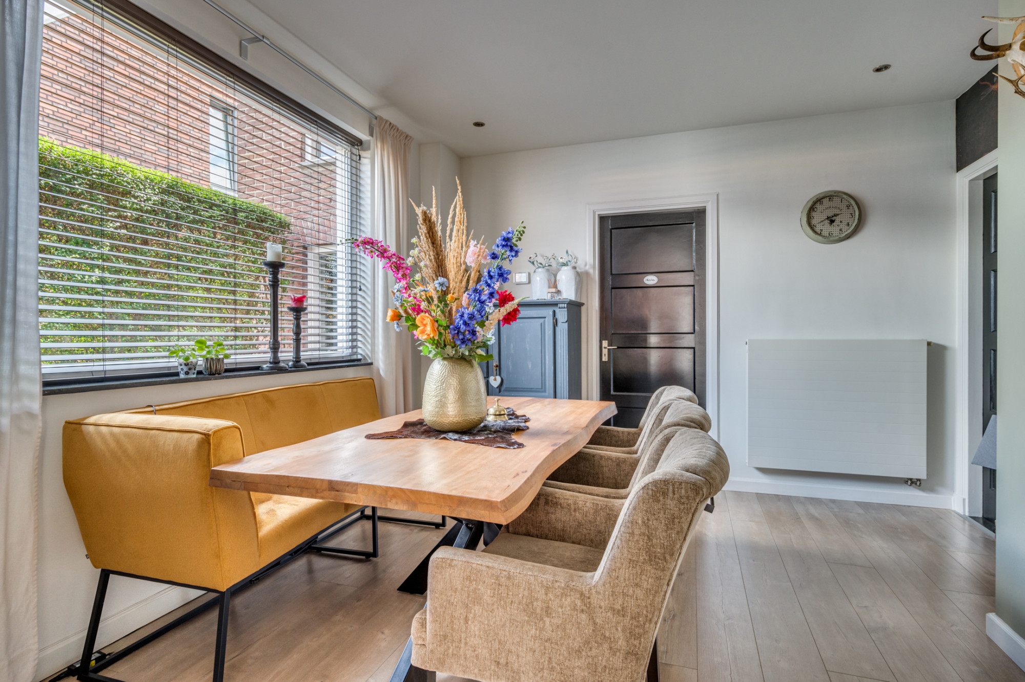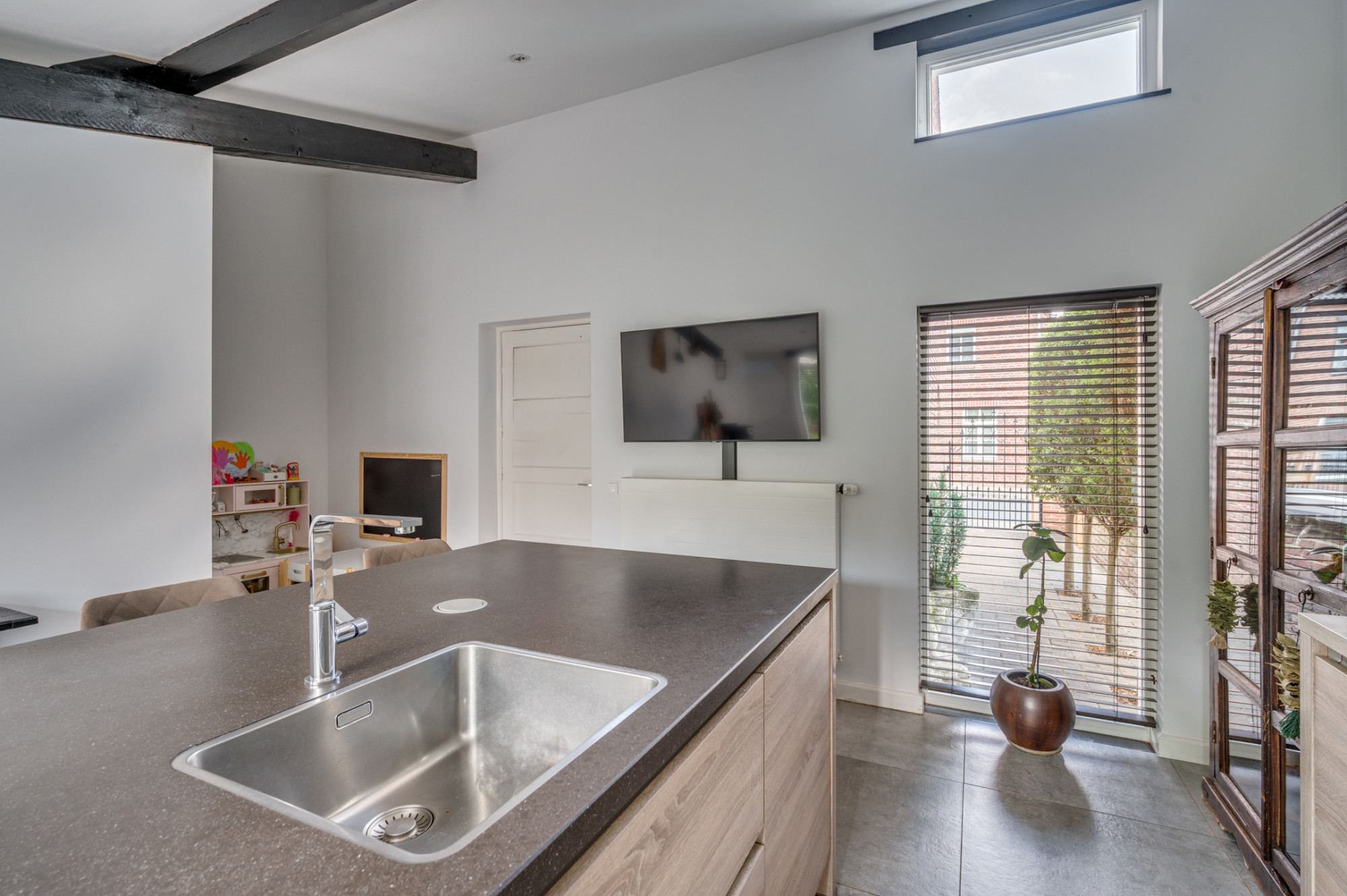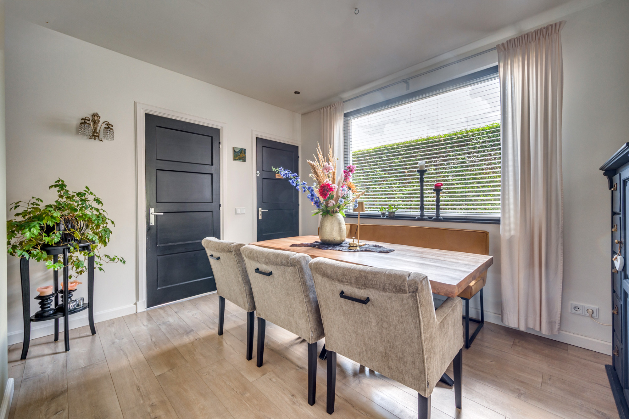 Het hart van de woning vormt de woonkeuken, geplaatst in de aanbouw. Deze ruimte is ingericht met een stijlvol eiland, hoogwaardige inbouwapparatuur, waaronder een inductiekookplaat, afzuigkap, combi-oven, koel/vries-combinatie en een vaatwasser. Een grote schuifpui zorgt voor een prachtig contact met de achtertuin. Direct aangrenzend ligt de praktische bijkeuken met witgoedaansluitingen, cv-opstelling (Vaillant VHR, huur, installatiejaar 2022) en een modern toilet. Vanuit hier is er tevens een handige loopdeur naar de achtertuin.