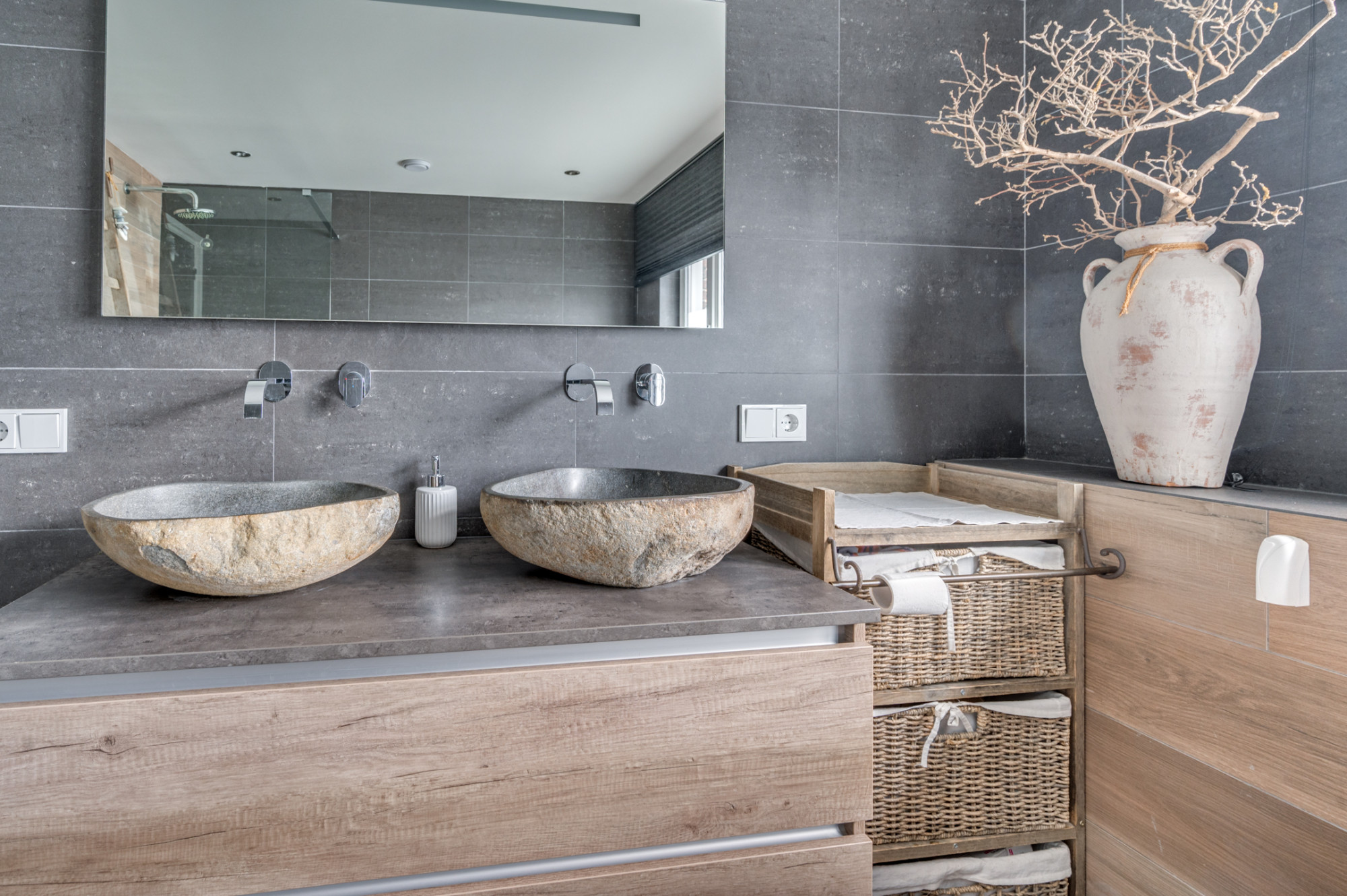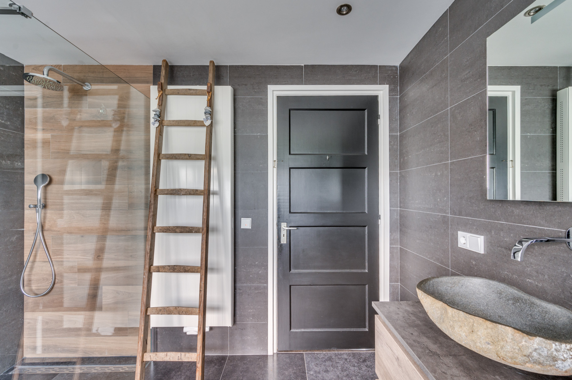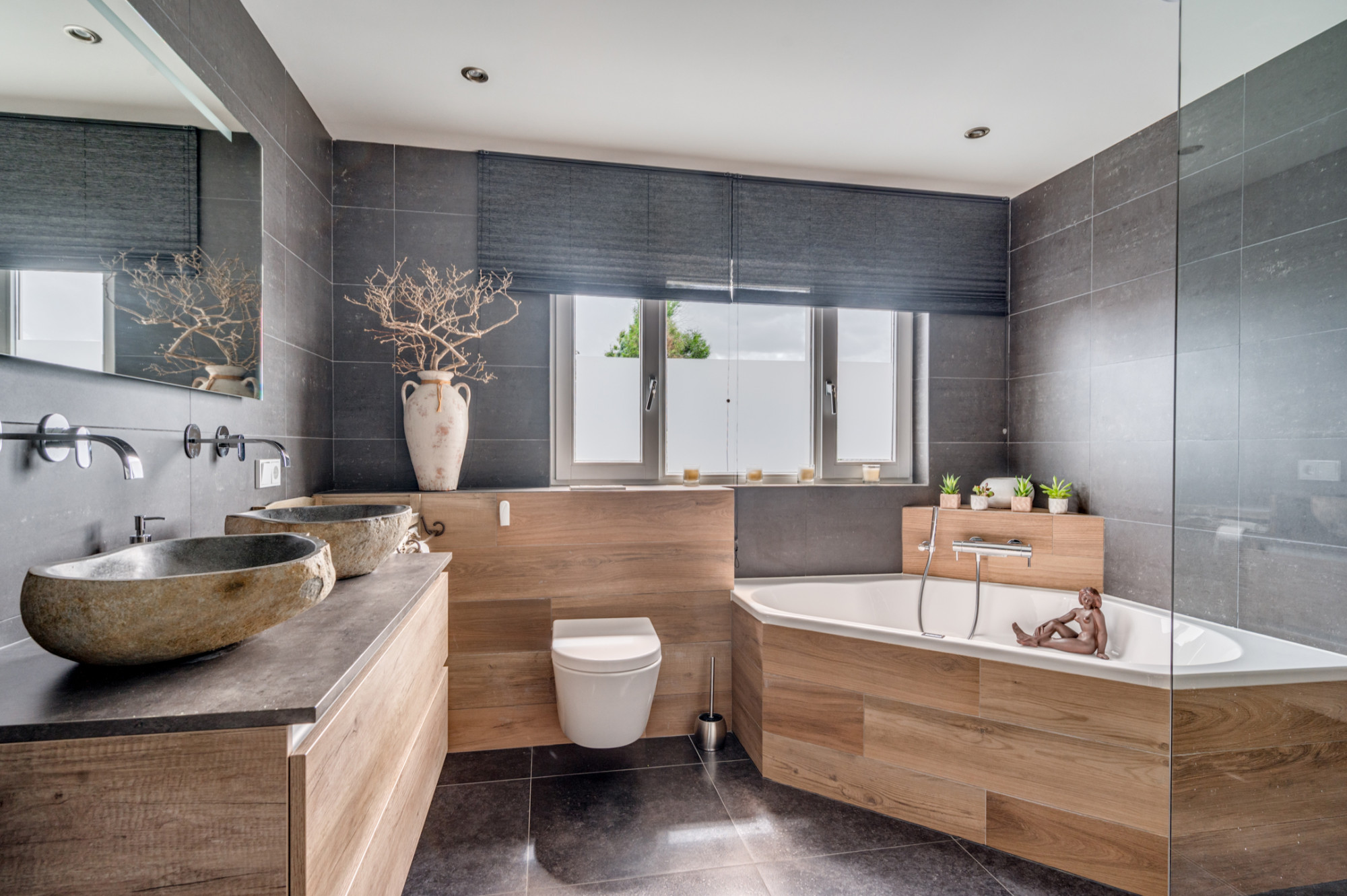 De overloop biedt toegang tot de eerste drie slaapkamers, allen voorzien van airconditioning en waarvan één met dubbele muurkast. Alle kamers zijn voorzien van een laminaatvloer en een fijne lichtinval. De badkamer straalt luxe uit en is ingericht met een ruime inloopdouche en een hoekbad met whirlpool, een dubbele wastafel met meubel en een zwevend toilet.