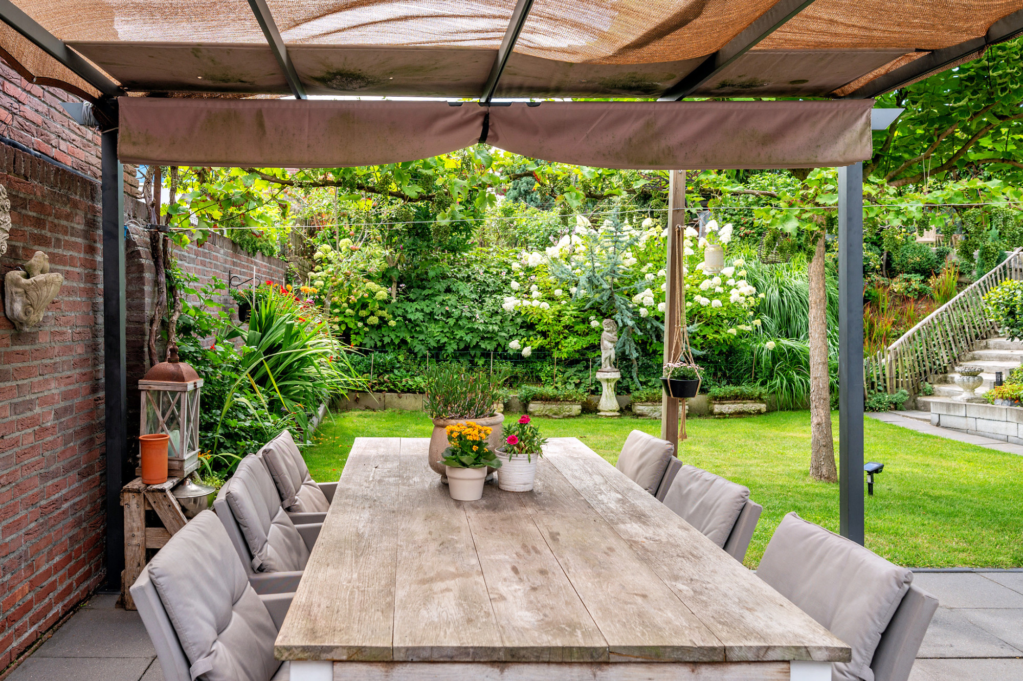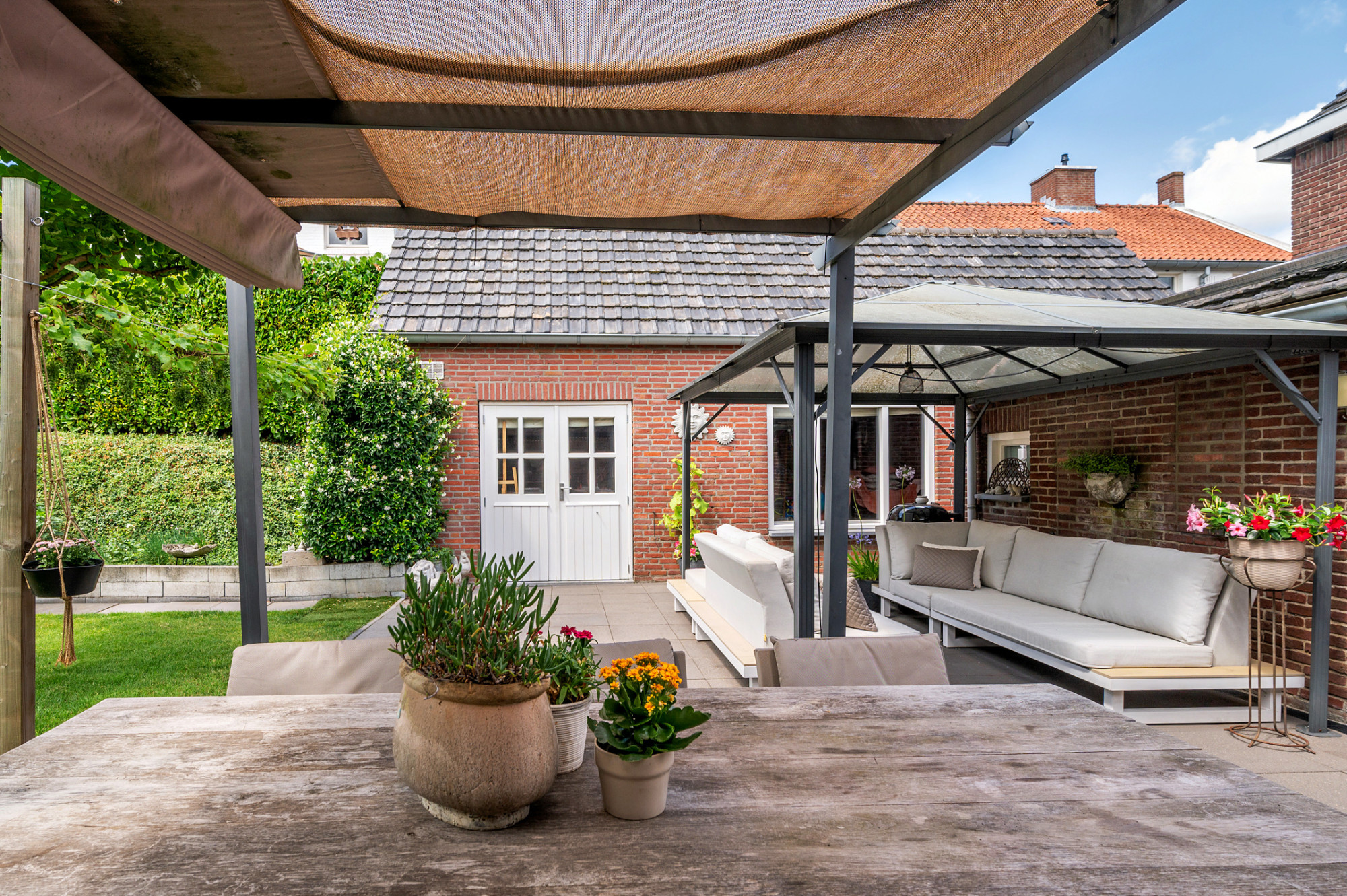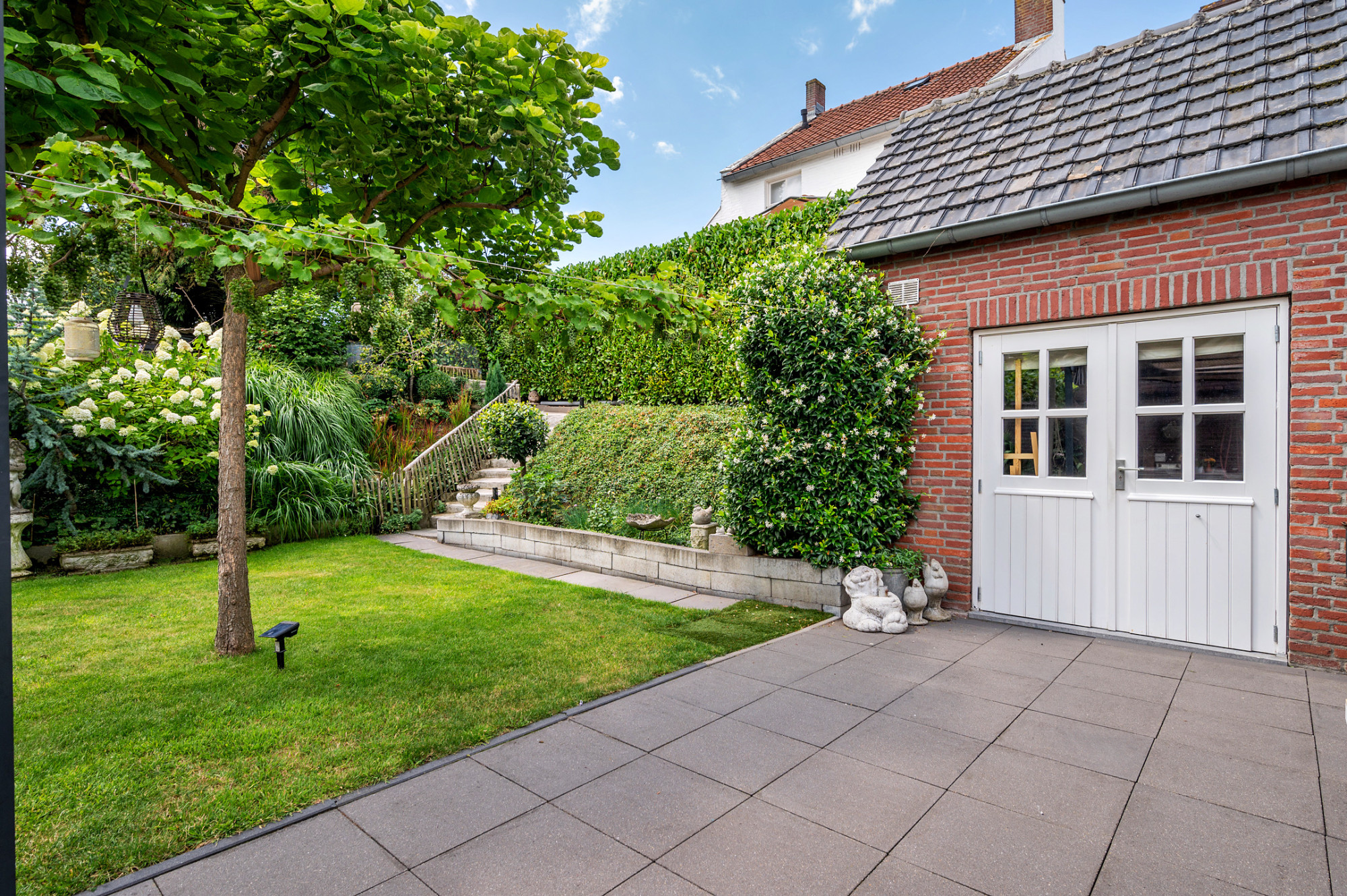 Er is een riante, diepe achtertuin aanwezig, die smaakvol is aangelegd met een ruim terras, gazon en groene aanplant, waardoor er een fijne plek is ontstaan om te genieten van de buitenlucht. Verhoogd is heel verrassend nog een 2e stuk tuin gelegen met groen en een kippenrennetje. Er is verder ook nog een klein sfeervol zijtuintje aanwezig. Het vrijstaande bijgebouw, momenteel in gebruik als garage/hobbyruimte, is voorzien van dubbele houten poorten en een loopdeur en biedt volop mogelijkheden voor een andere invulling, zoals een atelier, kantoor of andere doeleinden. Dankzij de eigen ruime oprit is parkeren op eigen terrein altijd mogelijk voor meer auto's.