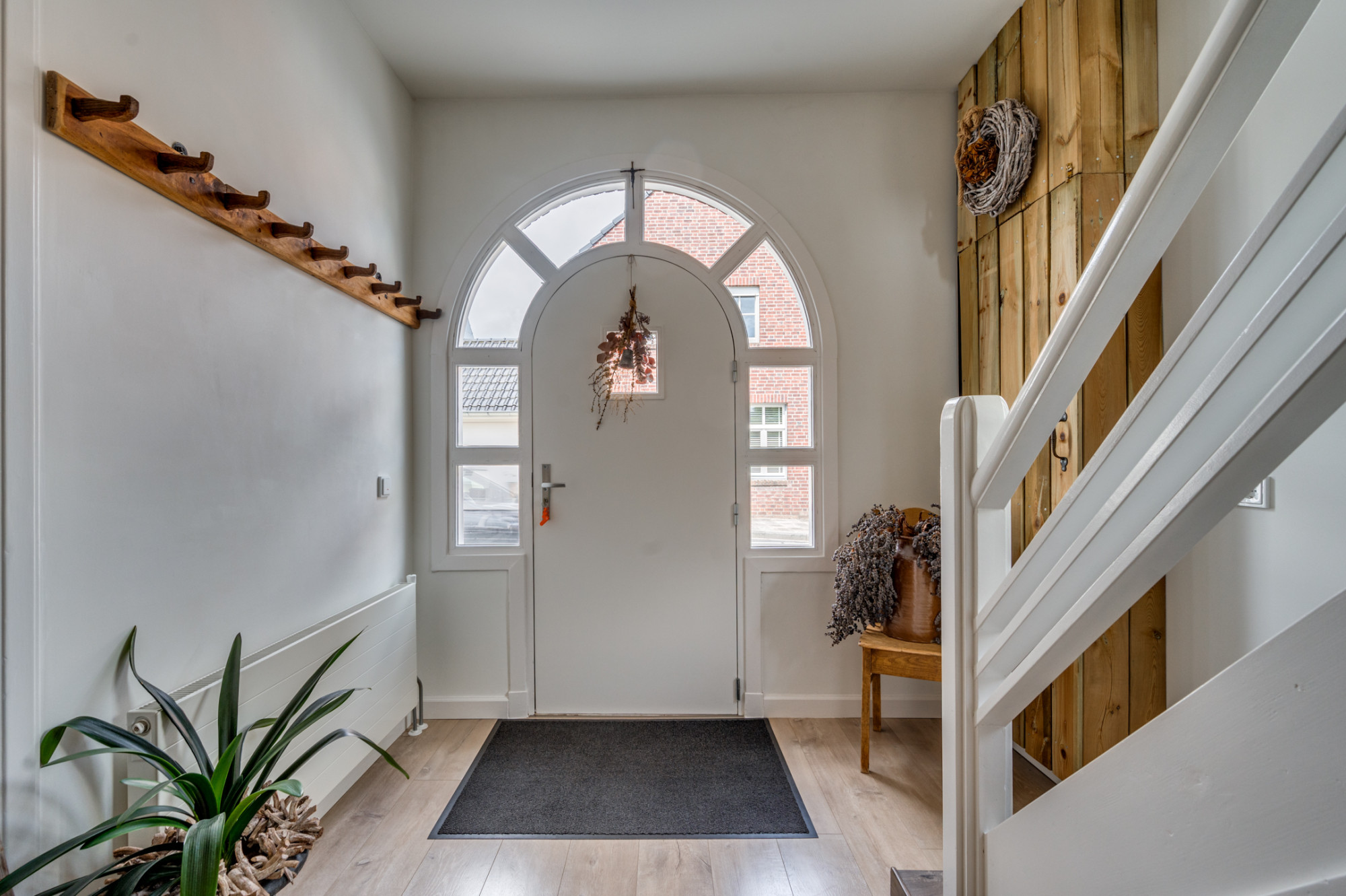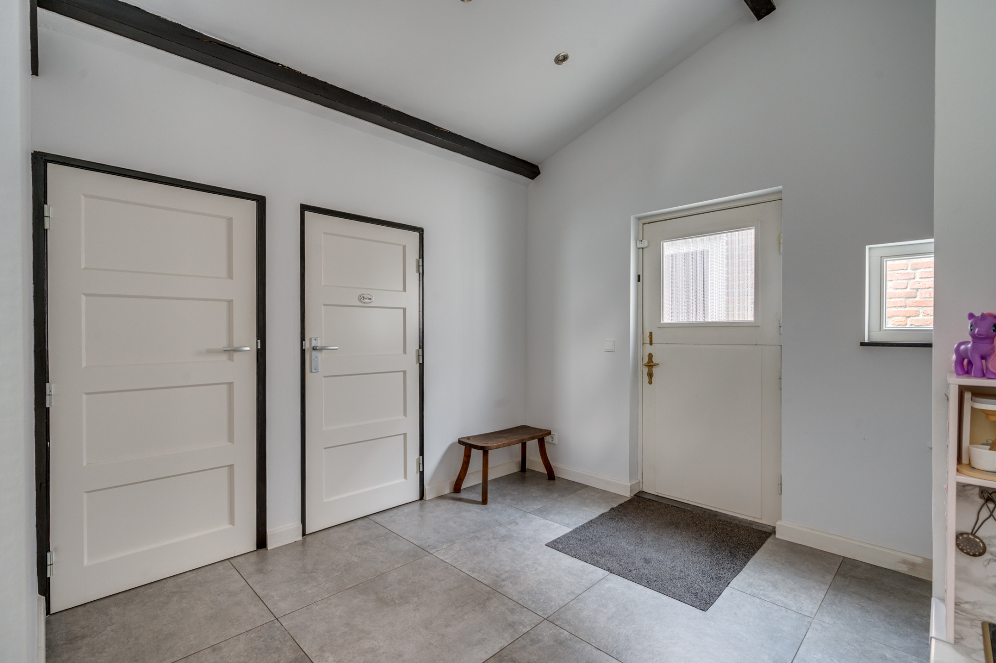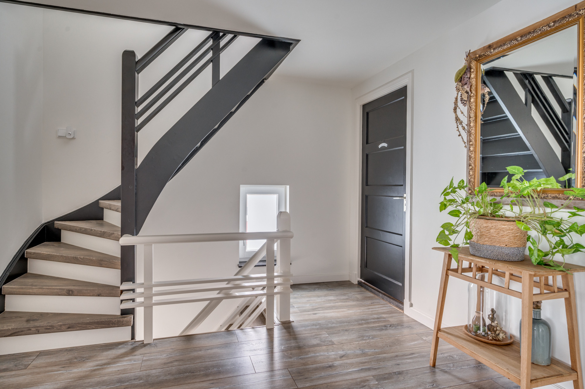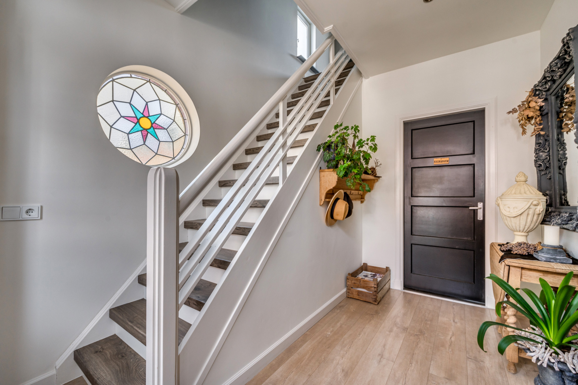 De karakteristieke entree verwelkomt u in een royale, sfeervolle hal met meterkast en trapopgang. Vanuit hier bereikt u zowel de woonkamer als een multifunctionele tussenkamer, in gebruik als aparte eetkamer van circa 15 m², die zich ook uitstekend leent als werk-, speel- of hobbyruimte. De woonkamer zelf is royaal van opzet en biedt dankzij de grote ramen een prettige lichtinval.