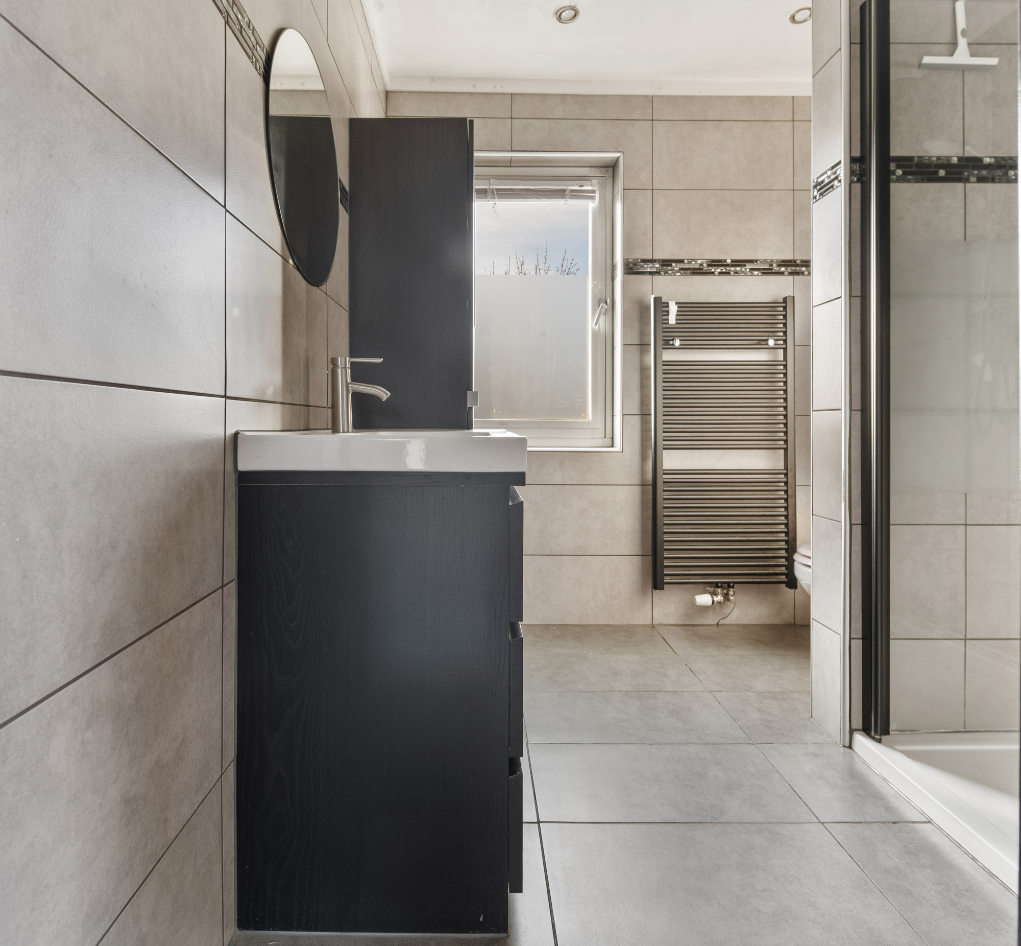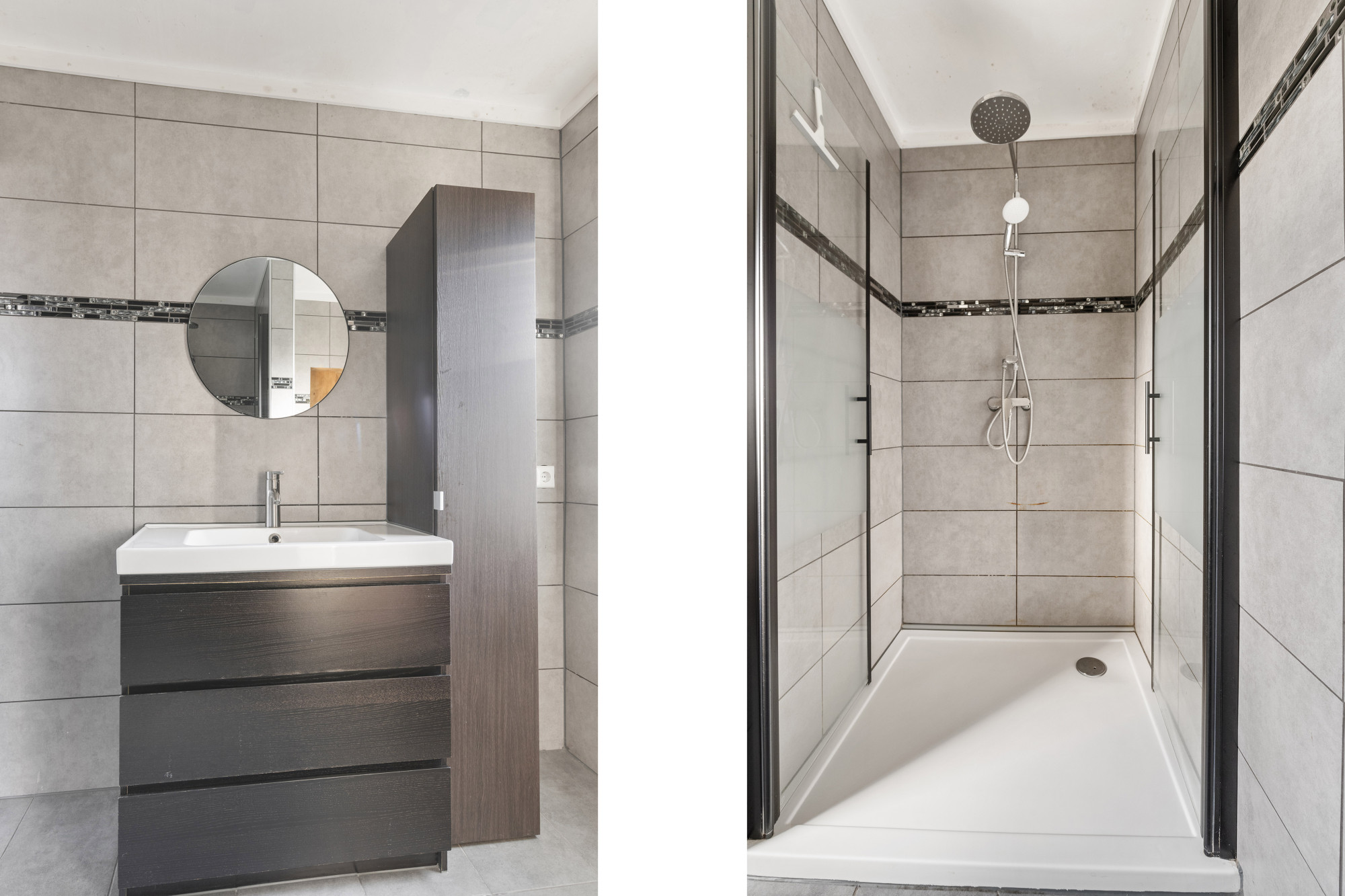 De moderne badkamer is functioneel ingericht met een inloopdouche, wastafel met meubel en toilet.