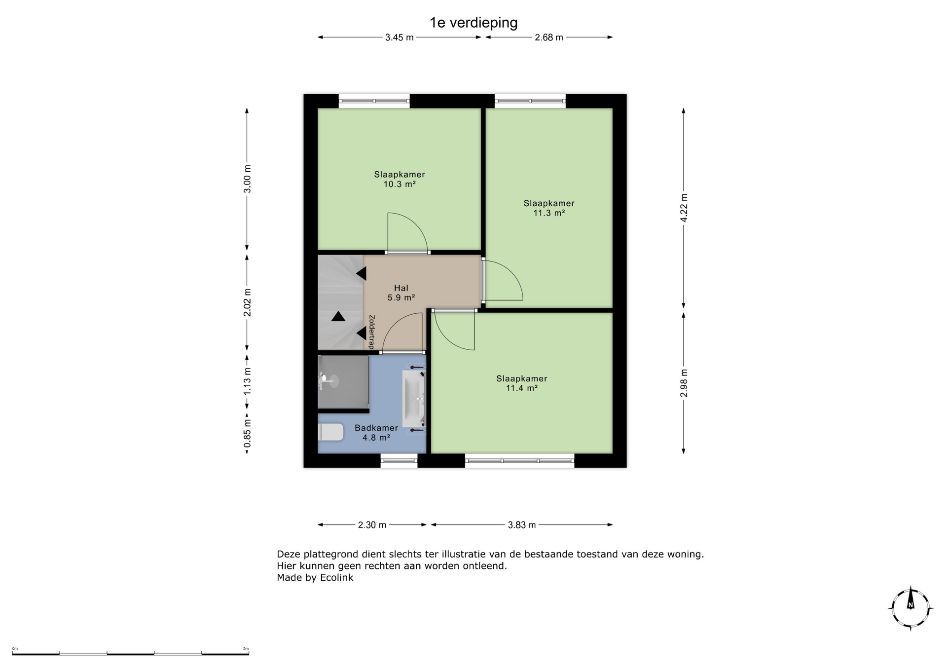 Via de overloop bereikt u drie ruime slaapkamers en de badkamer. Alle slaapkamers zijn voorzien van een laminaatvloer en beschikken over veel daglichttoetreding.