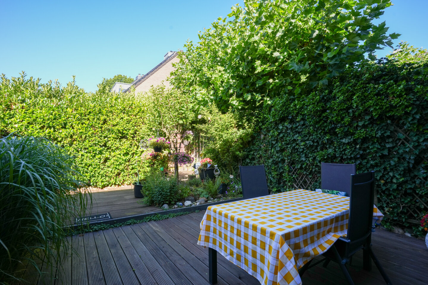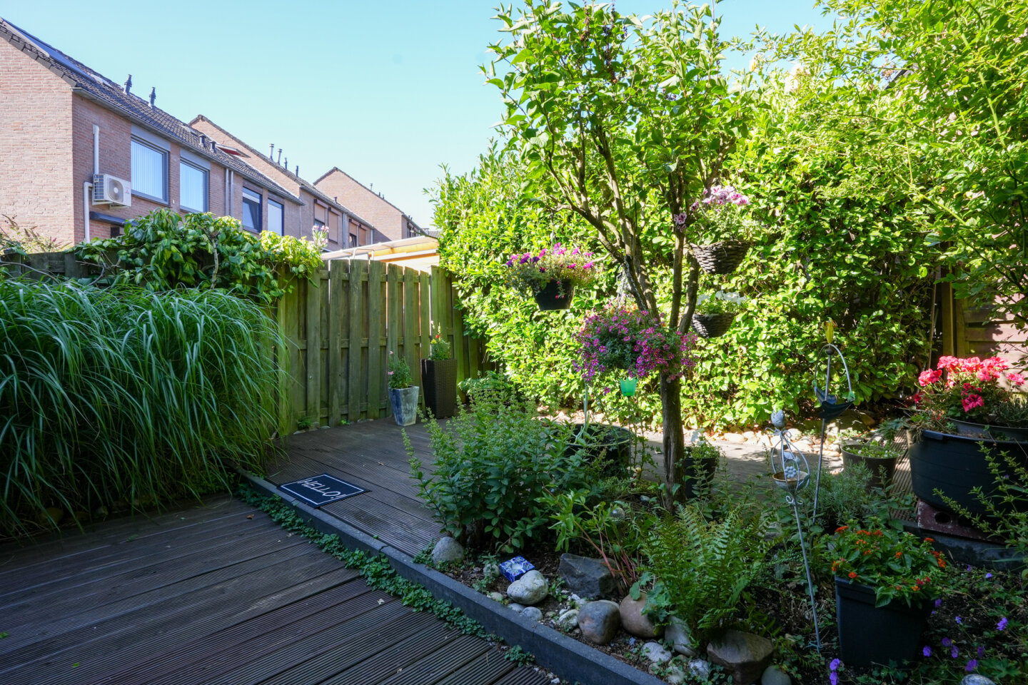 Fraaie achtertuin gelegen op het Westen met een achteruitgang. Diverse beplanting en een terras met zonneluifel zorgen voor een sfeervolle tuin.