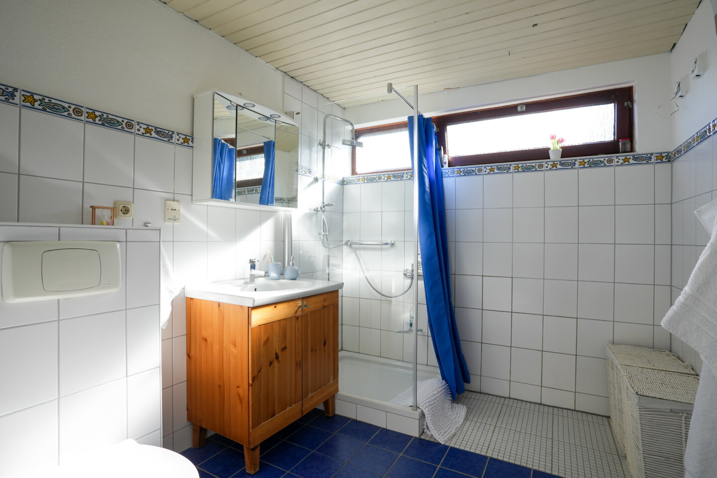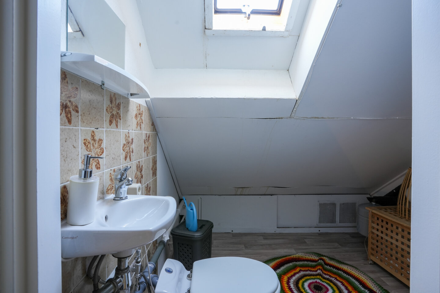 Eenvoudige maar nette badkamer (6,2m2) voorzien van douche, toilet en wastafel.