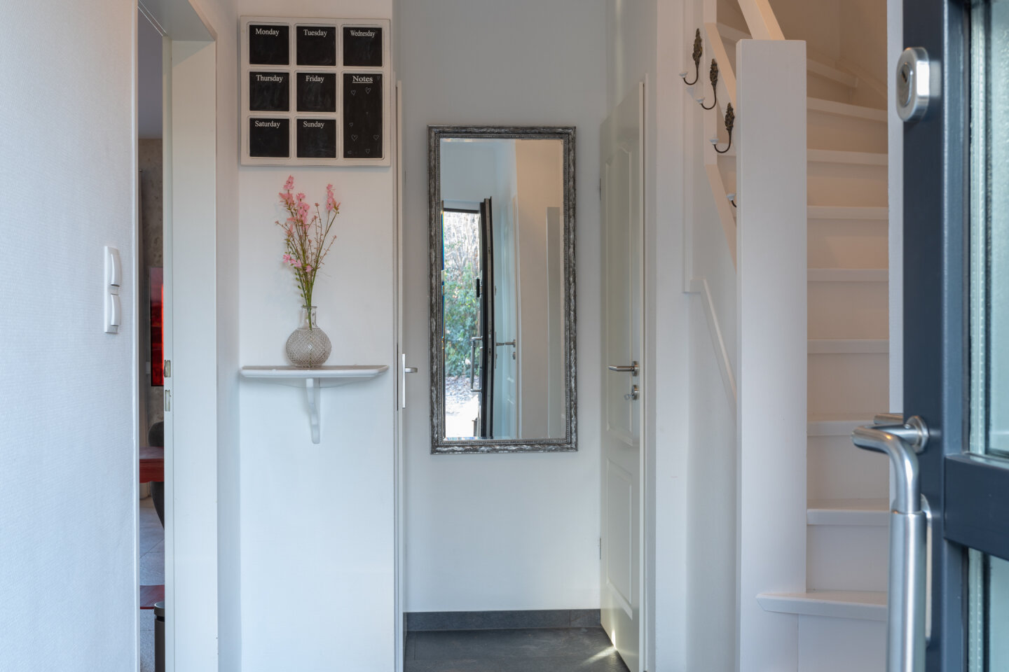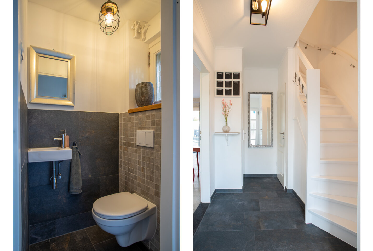 Entree met meterkast. Trapberging, toegang naar de eerste verdieping, de woonkamer en keuken. Modern toilet met fontein.