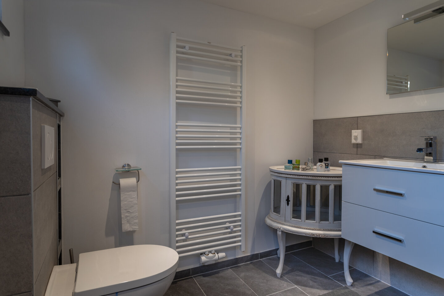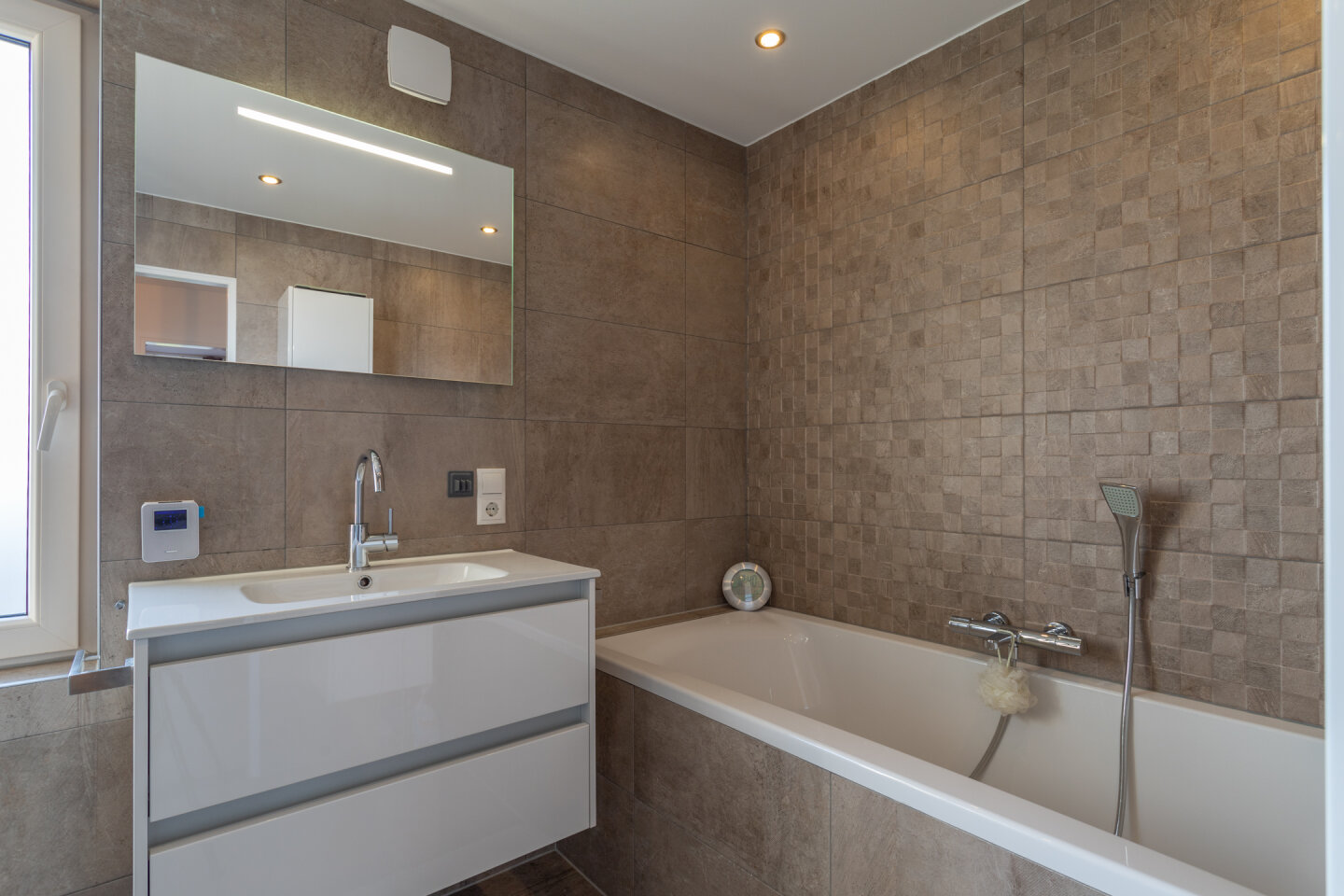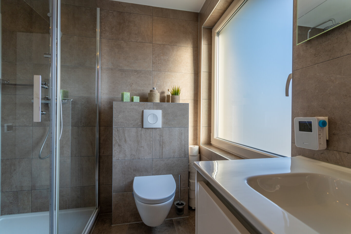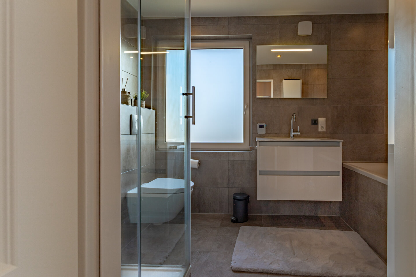 Moderne badkamer met douche, ligbad, toilet en wastafel. De badkamer is voorzien van vloerverwarming.