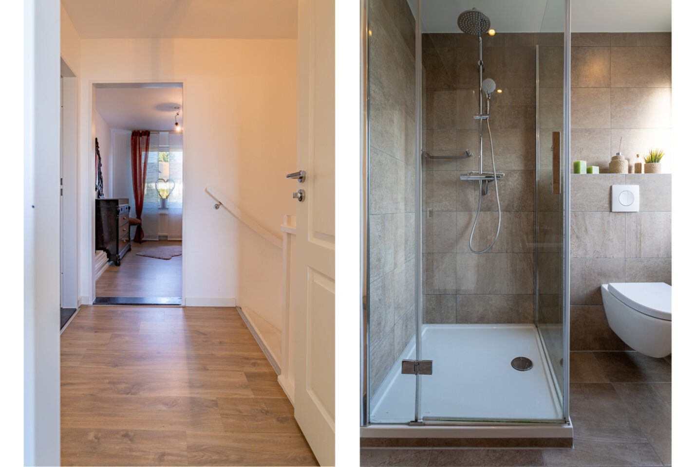 Overloop, drie slaapkamers en een badkamer.