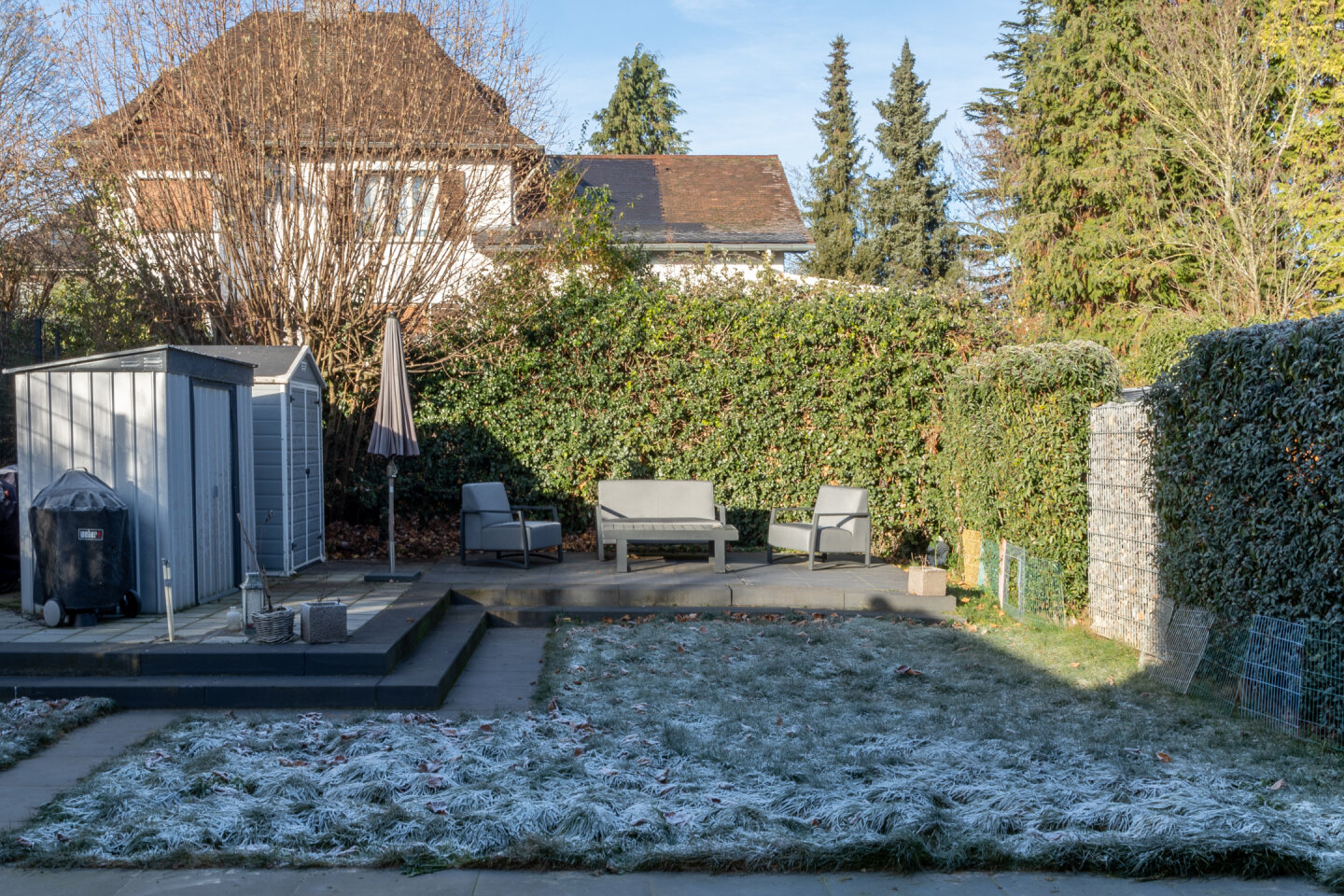 Privacy rijke achtertuin met twee terrassen, gazon en beplanting. De achtertuin is gelegen op het Noordwesten.