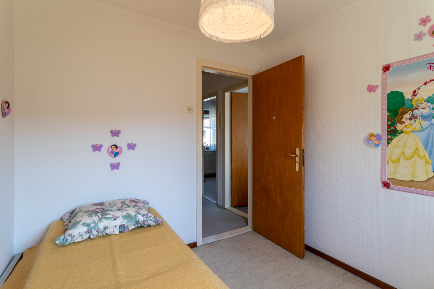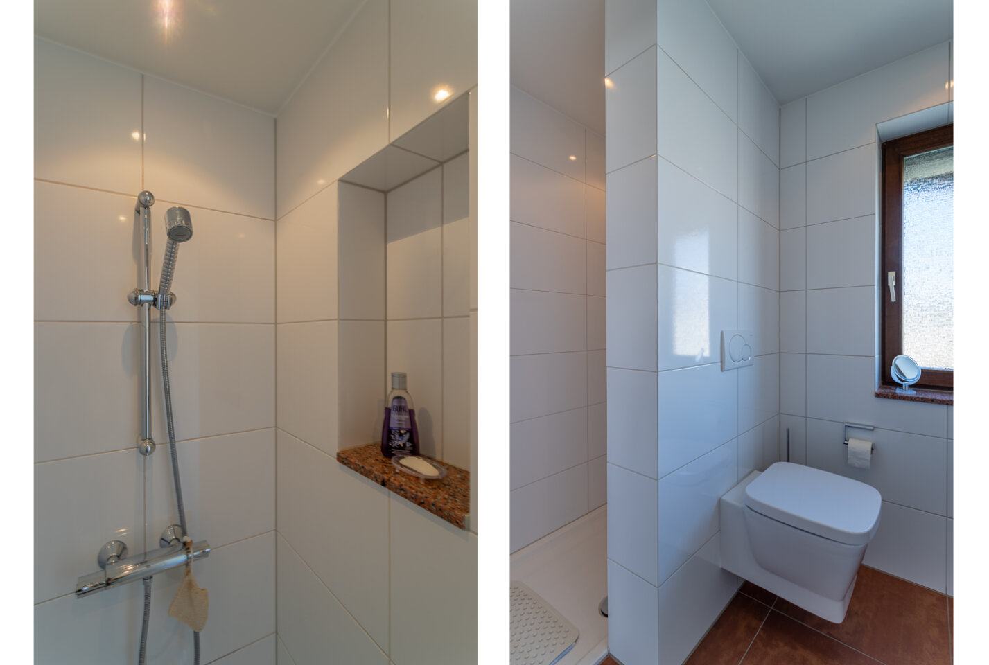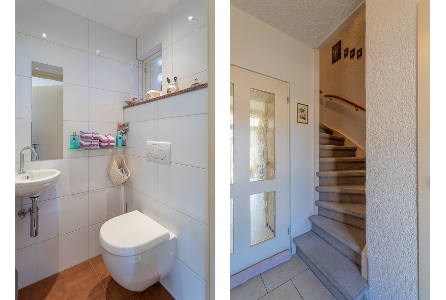 Overloop met toegang naar drie slaapkamers van 13,2 m², 9,8 m² en 7,5 m². Vernieuwde badkamer (5 m²) met inloopdouche, toilet en wastafel.