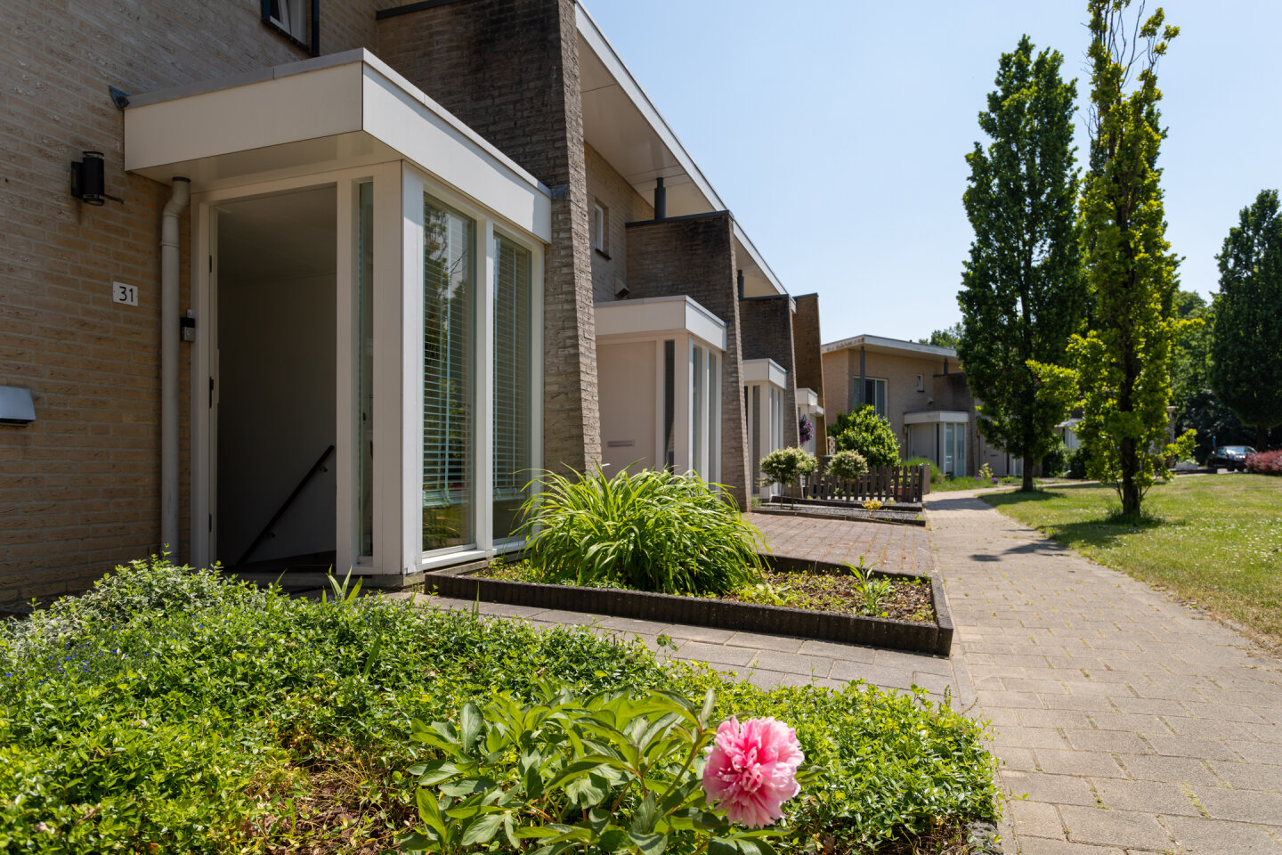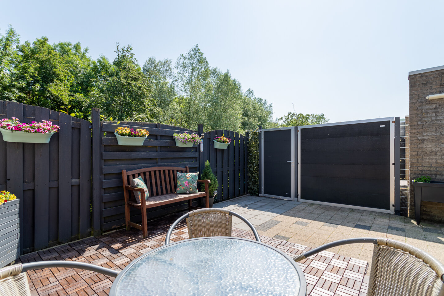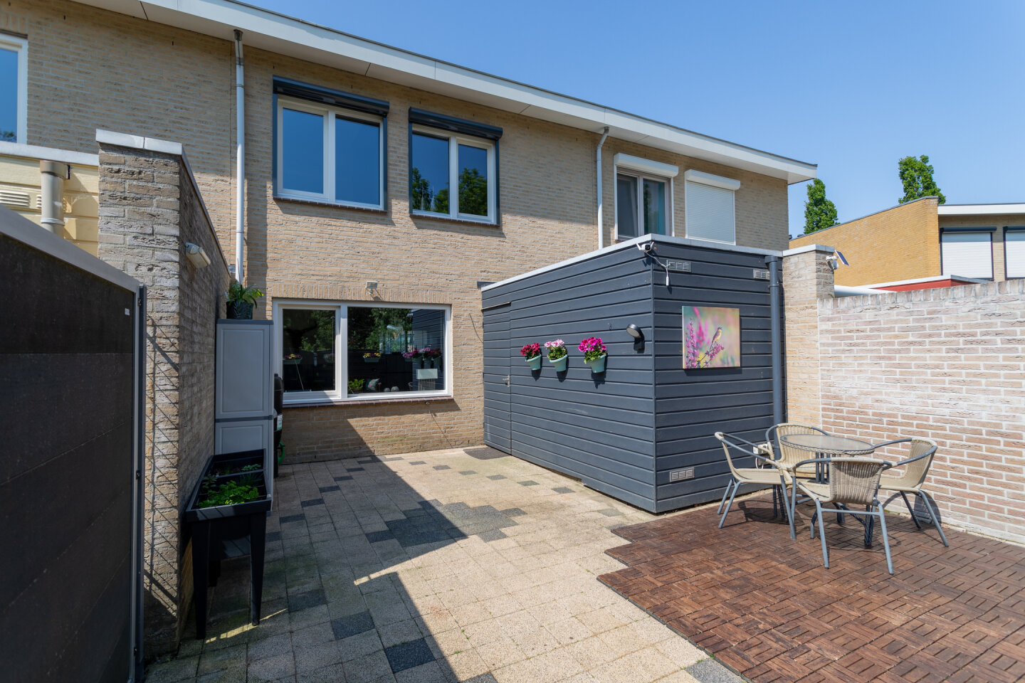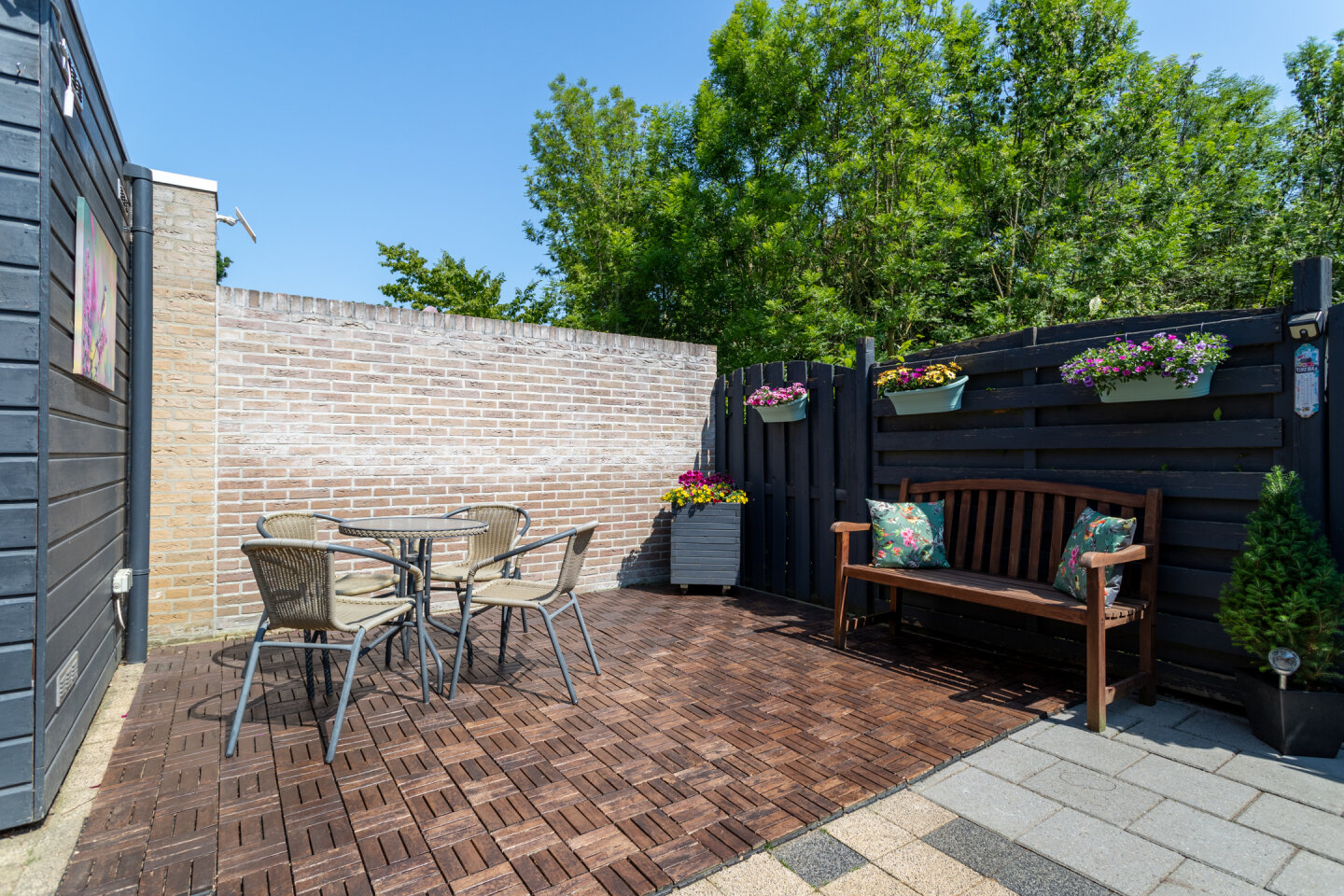 Onderhoudsvriendelijke tuin geheel voorzien van bestrating. De tuin heeft een achterom en is gelegen op het Oosten! De voortuin is mooi beplant.