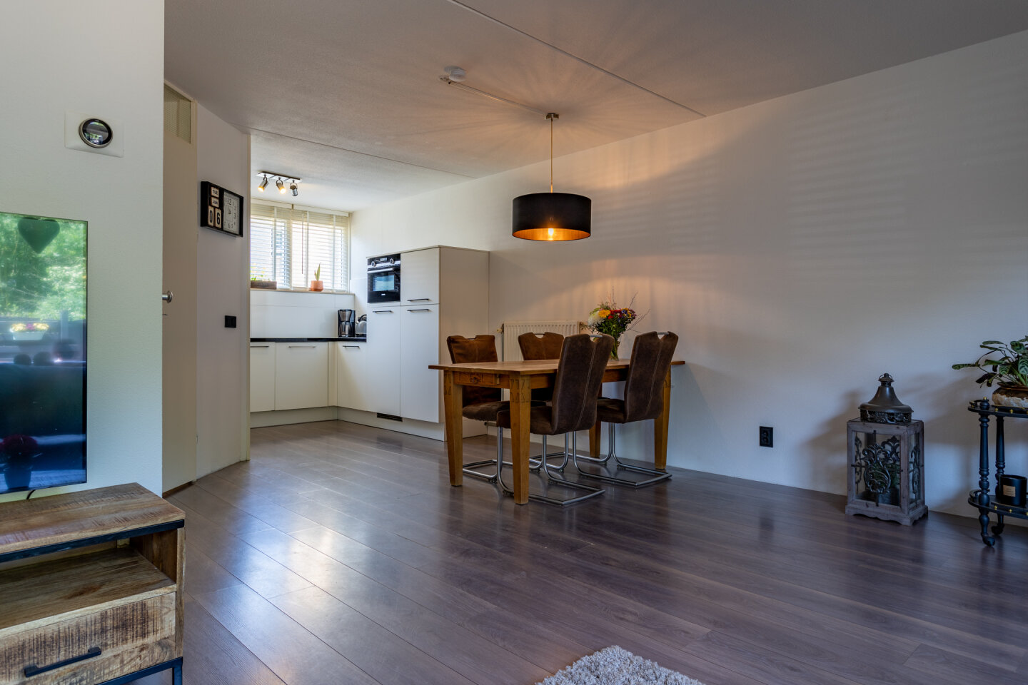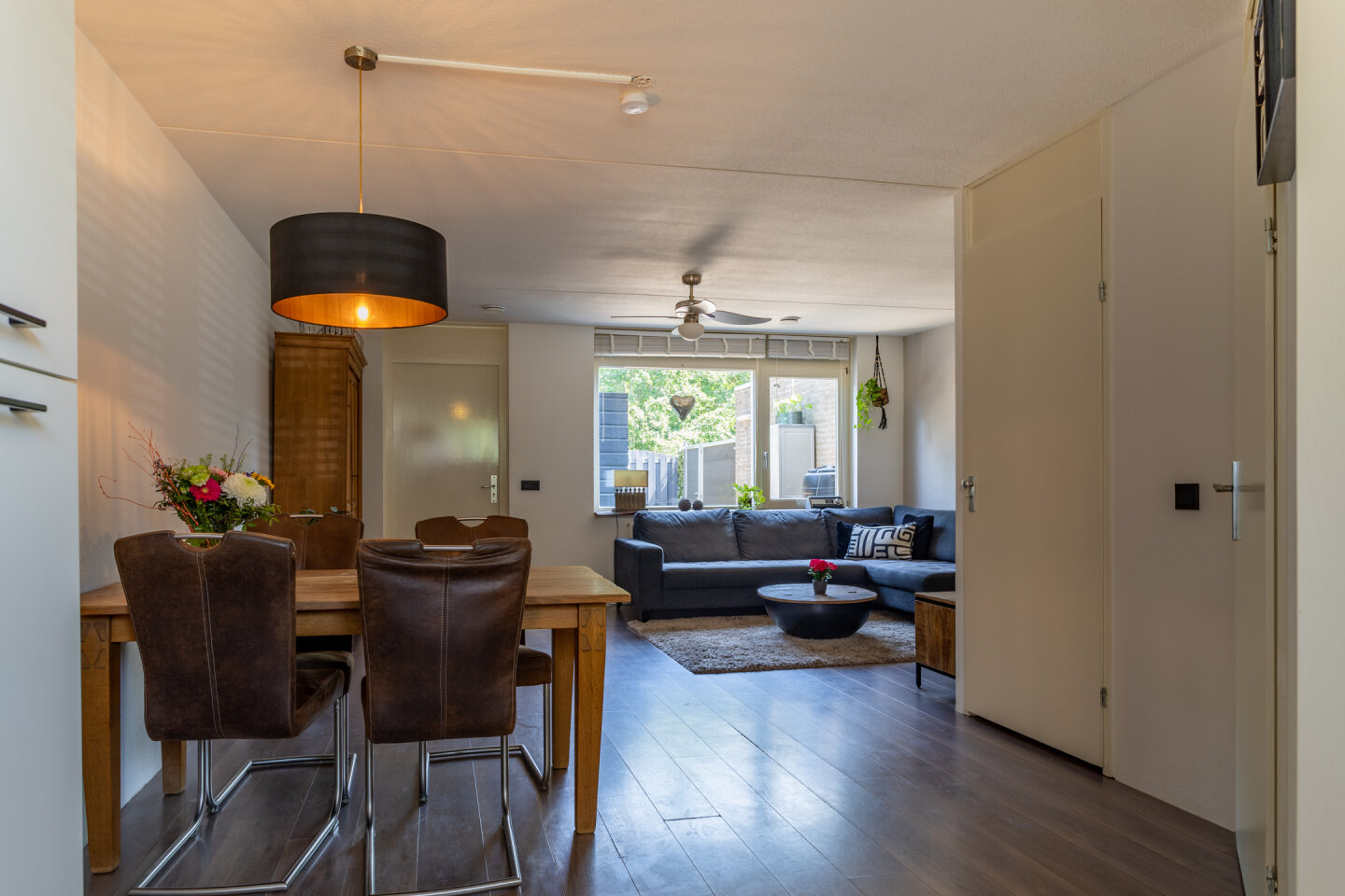 Entree met meterkast, vernieuwd toilet met fontein en toegang naar de keuken en woonkamer. De moderne open keuken is uitgerust met vaatwasser, koelkast, combi magnetron, afzuigkap en gas kookplaat. De lichte woonkamer en open keuken zijn voorzien van laminaat en hebben een oppervlakte van 34 m². Vanuit de woonkamer zijn de ruime berging en het terras/tuin bereikbaar.