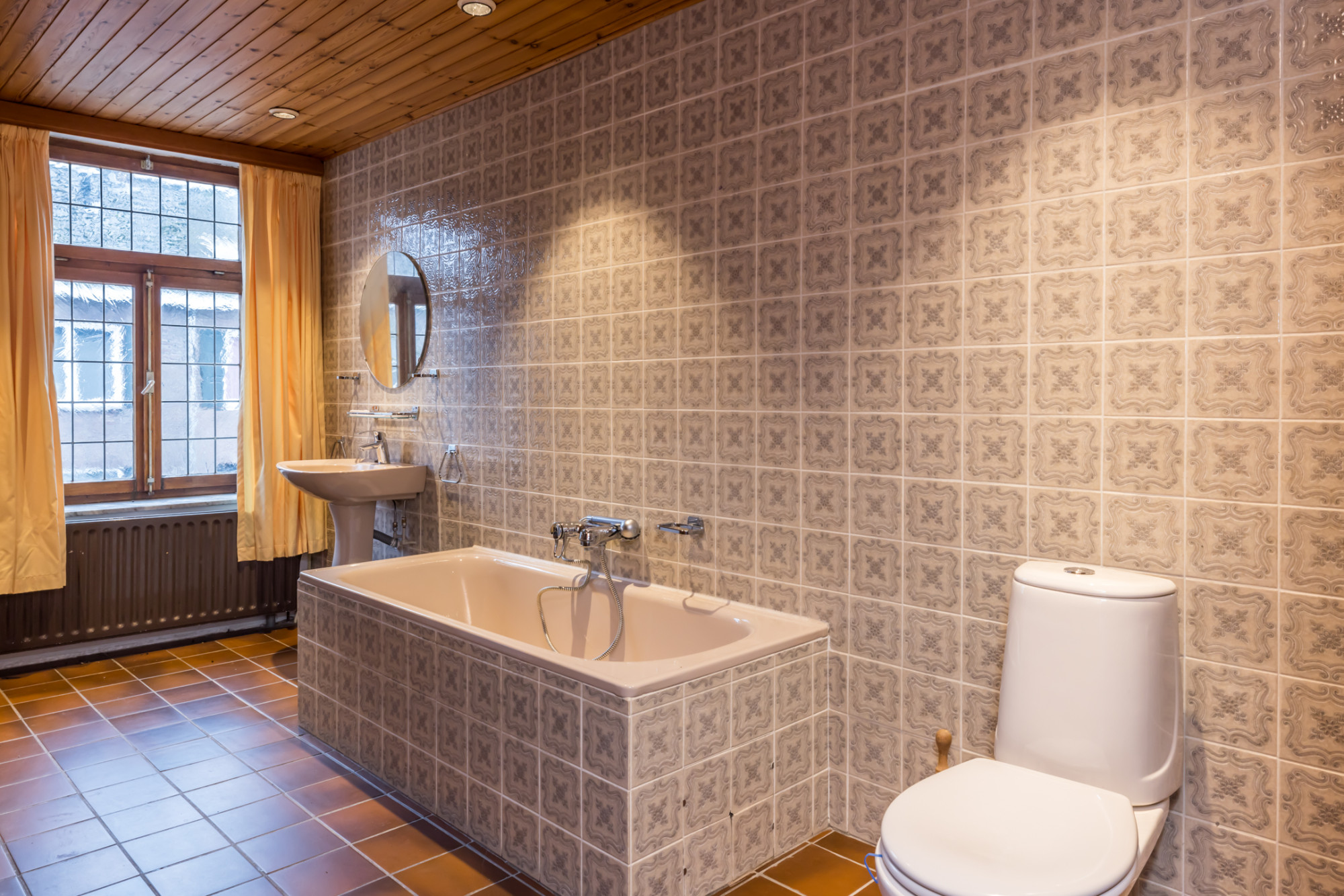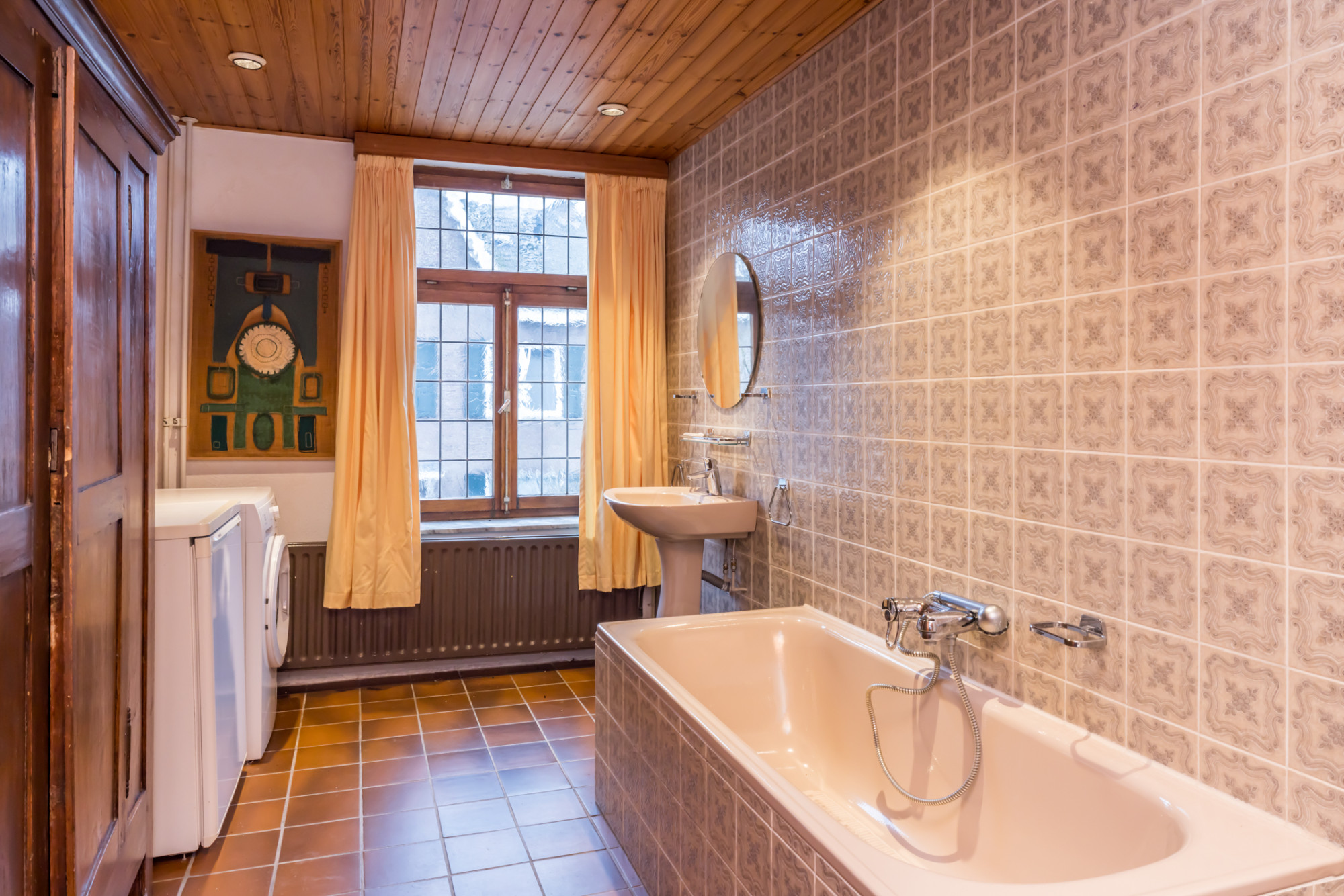 - badkamer voorzien van wastafel ligbad, toilet en aansluitingen witgoed