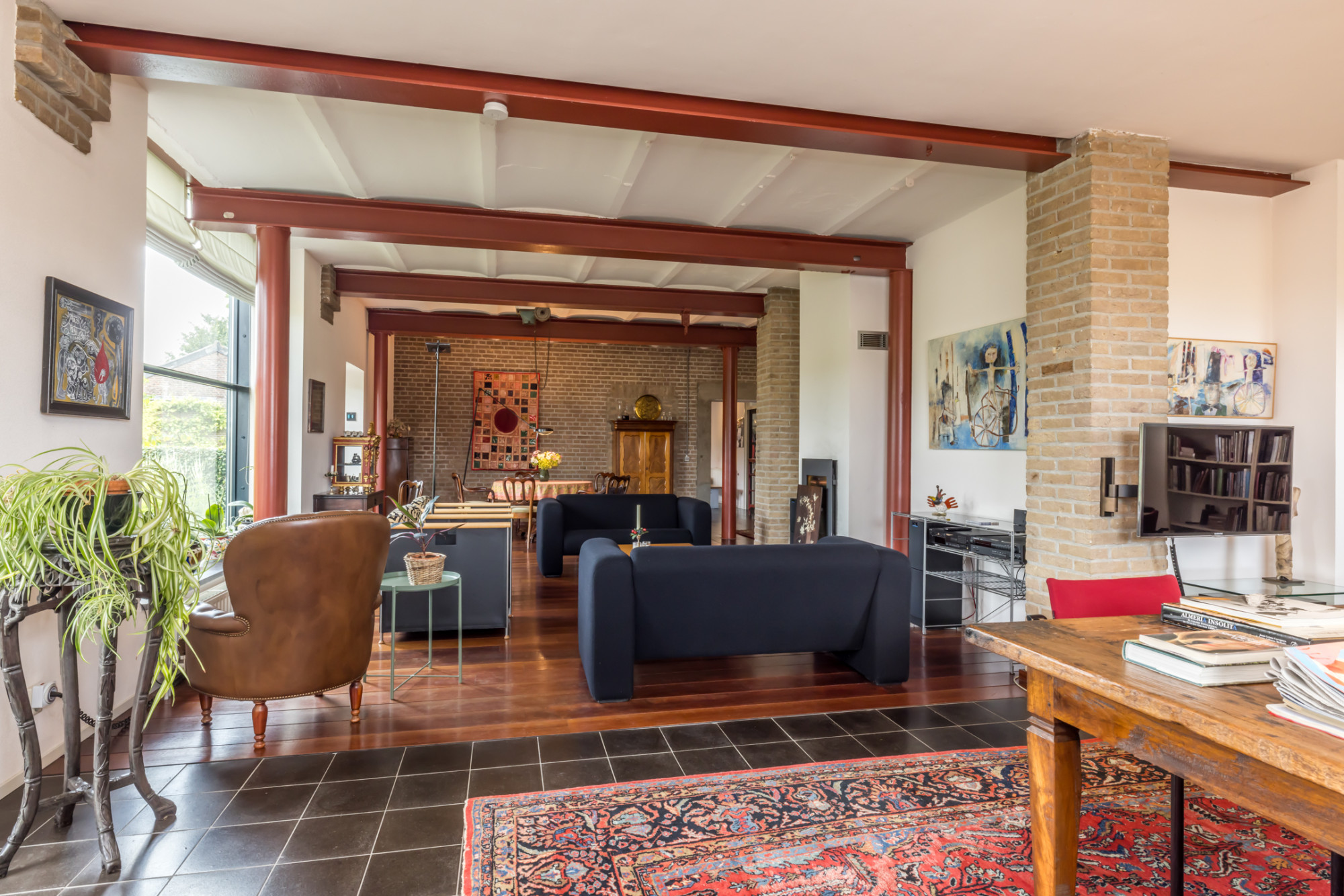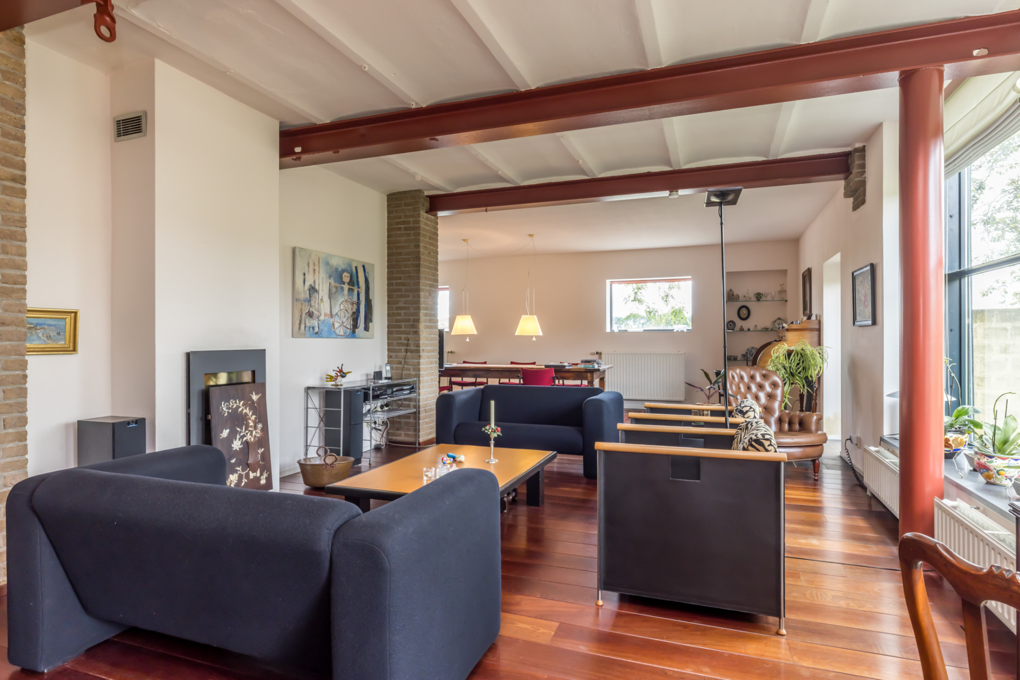 - living 91.2m² met houthaard, deels voorzien van parketvloer en deels plavuizenvloer, trap naar de verdieping