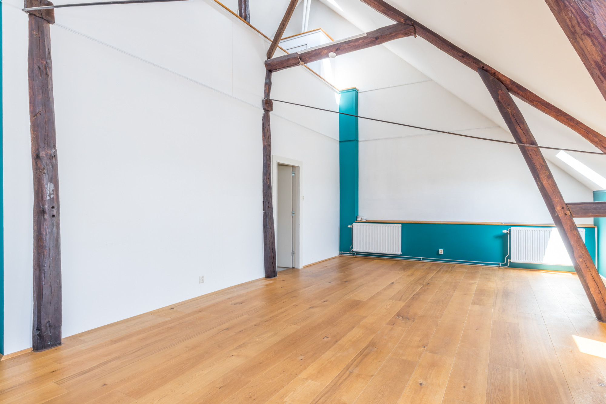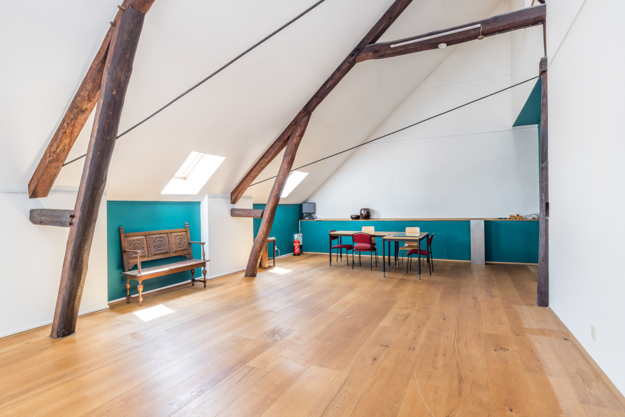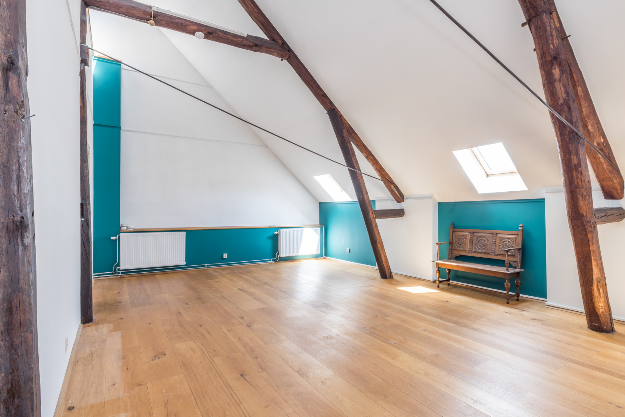 - ruime slaapkamer/werkkamer circa 56m2 met parketvloer, authentieke houten balken en dakramen