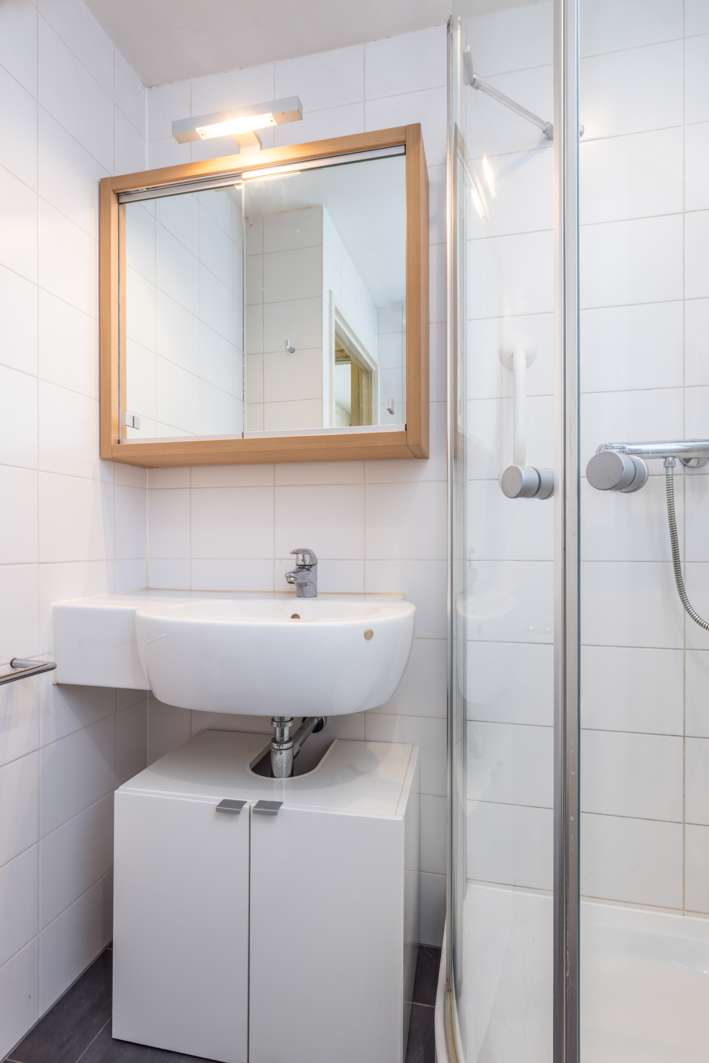 - badkamer met douchecabine, hangend closet en wasbak