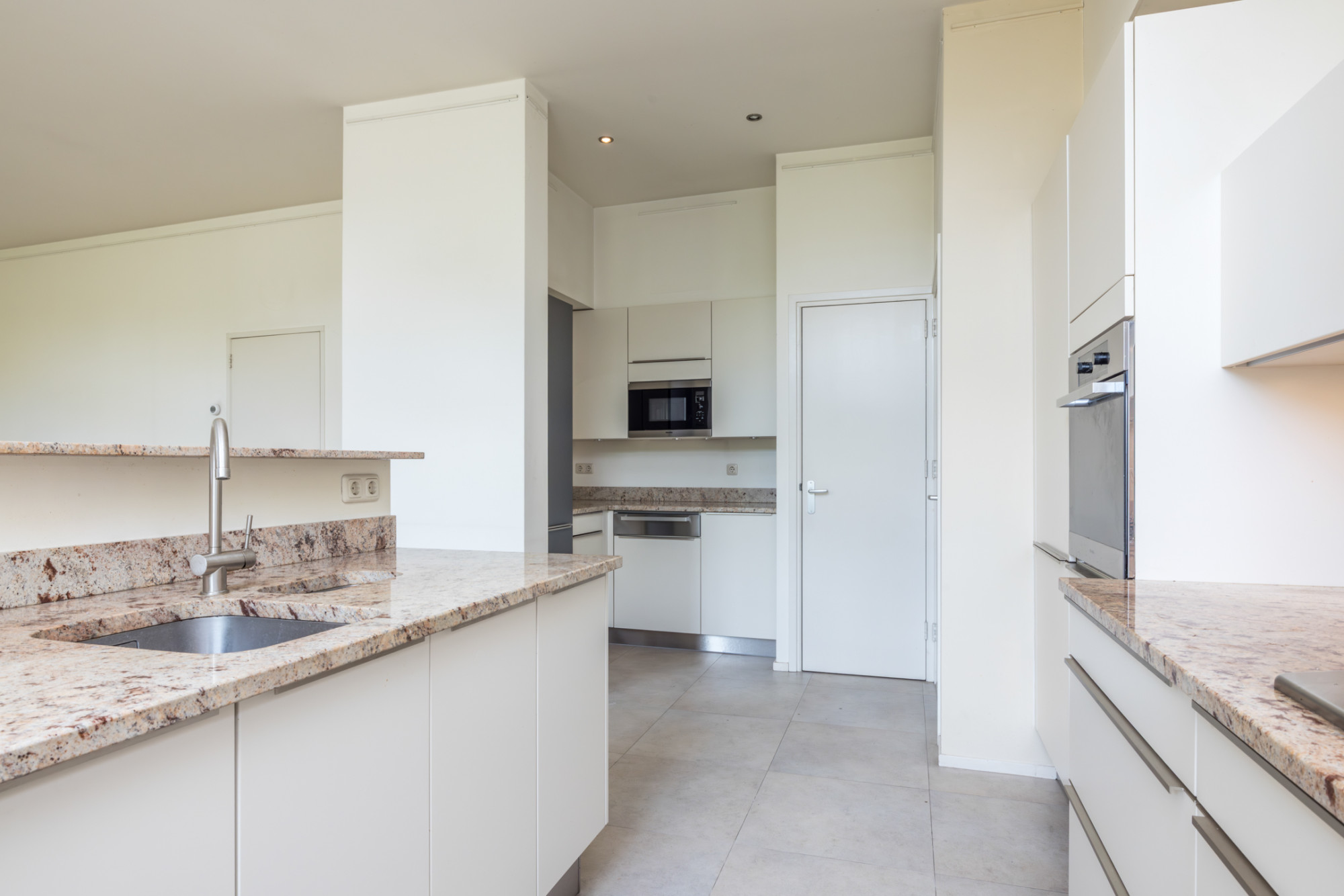 - open keuken met tegelvloer en moderne keukenopstelling voorzien van vaatwasser, koel- en vriescombinatie, 5 pits gascomfort met wokbrander, afzuigkap, oven, magnetron, warmhoudlade en granieten aanrechtblad en tevens muurkast met