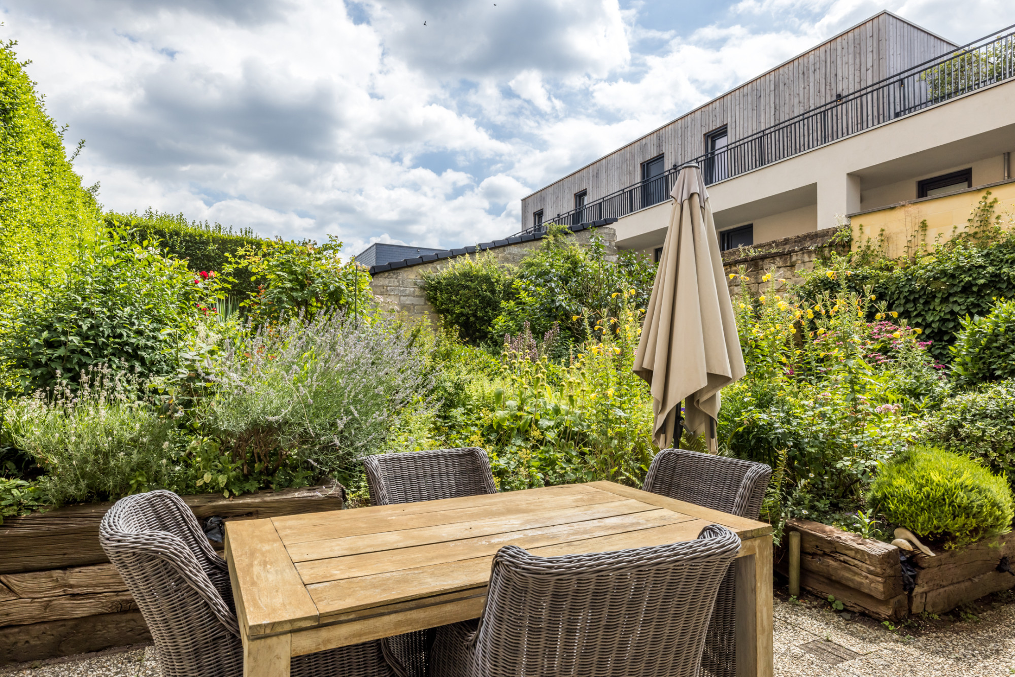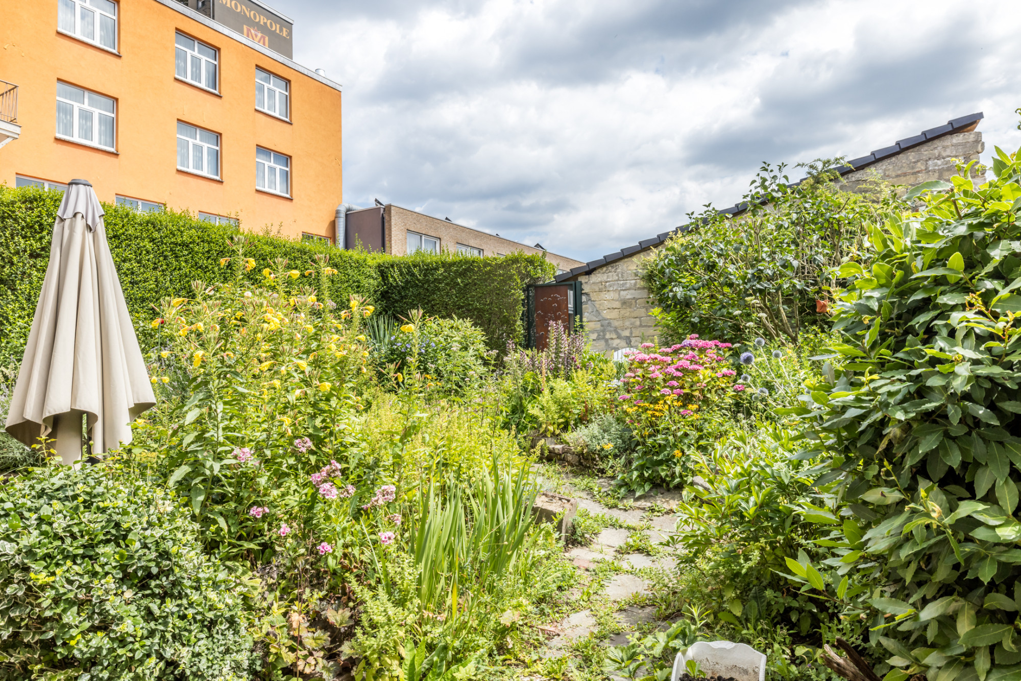 - sfeervolle stadstuin met achteringang (middels recht van overpad/erfdienstbaarheid), deels ommuurd met mergelwanden.