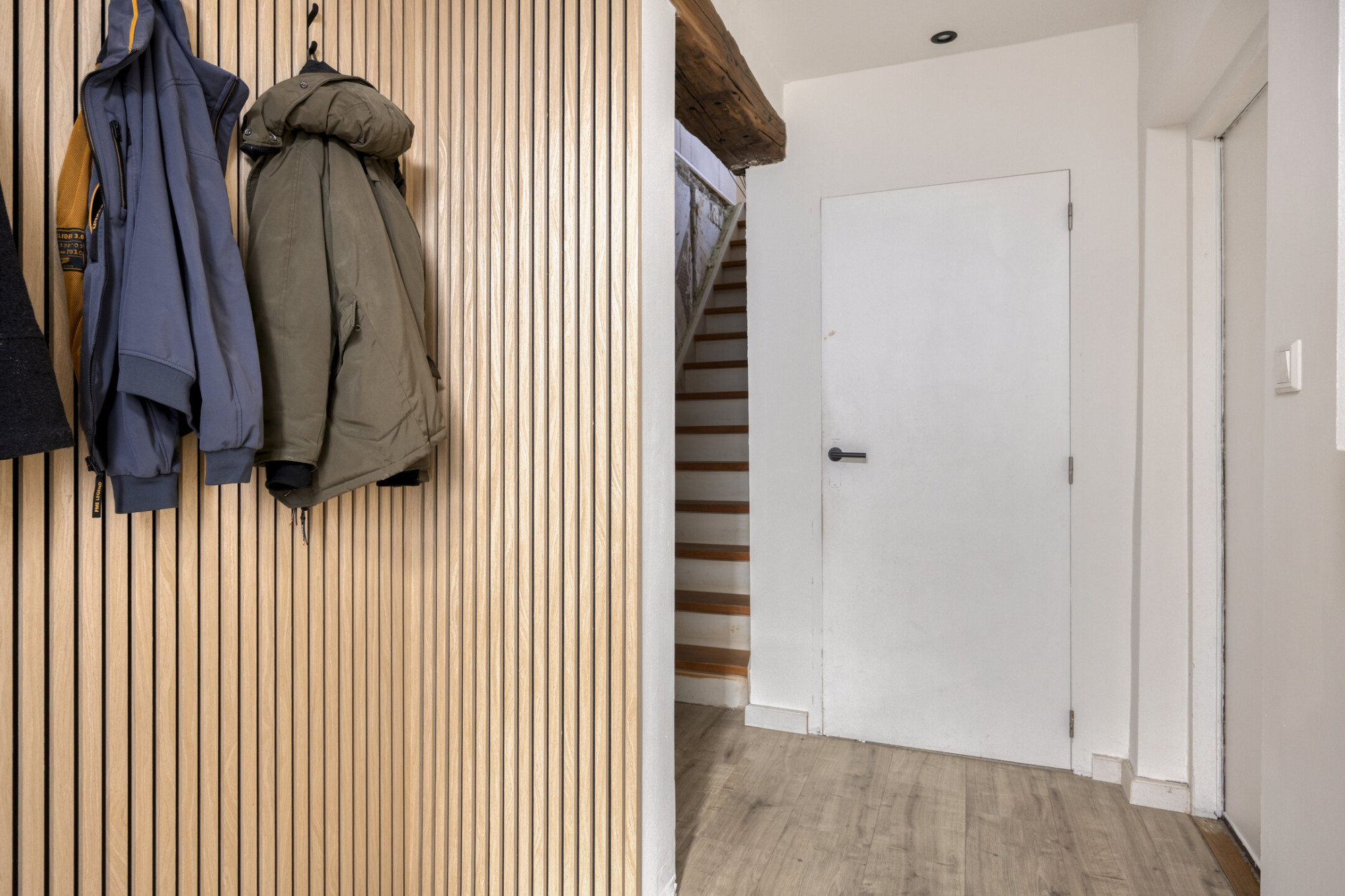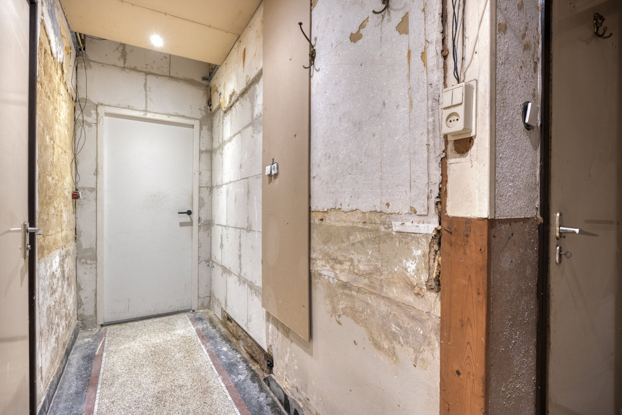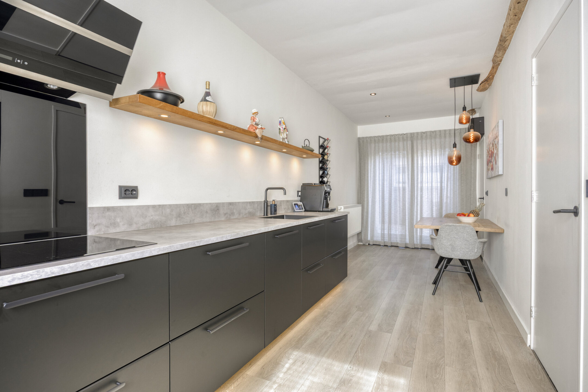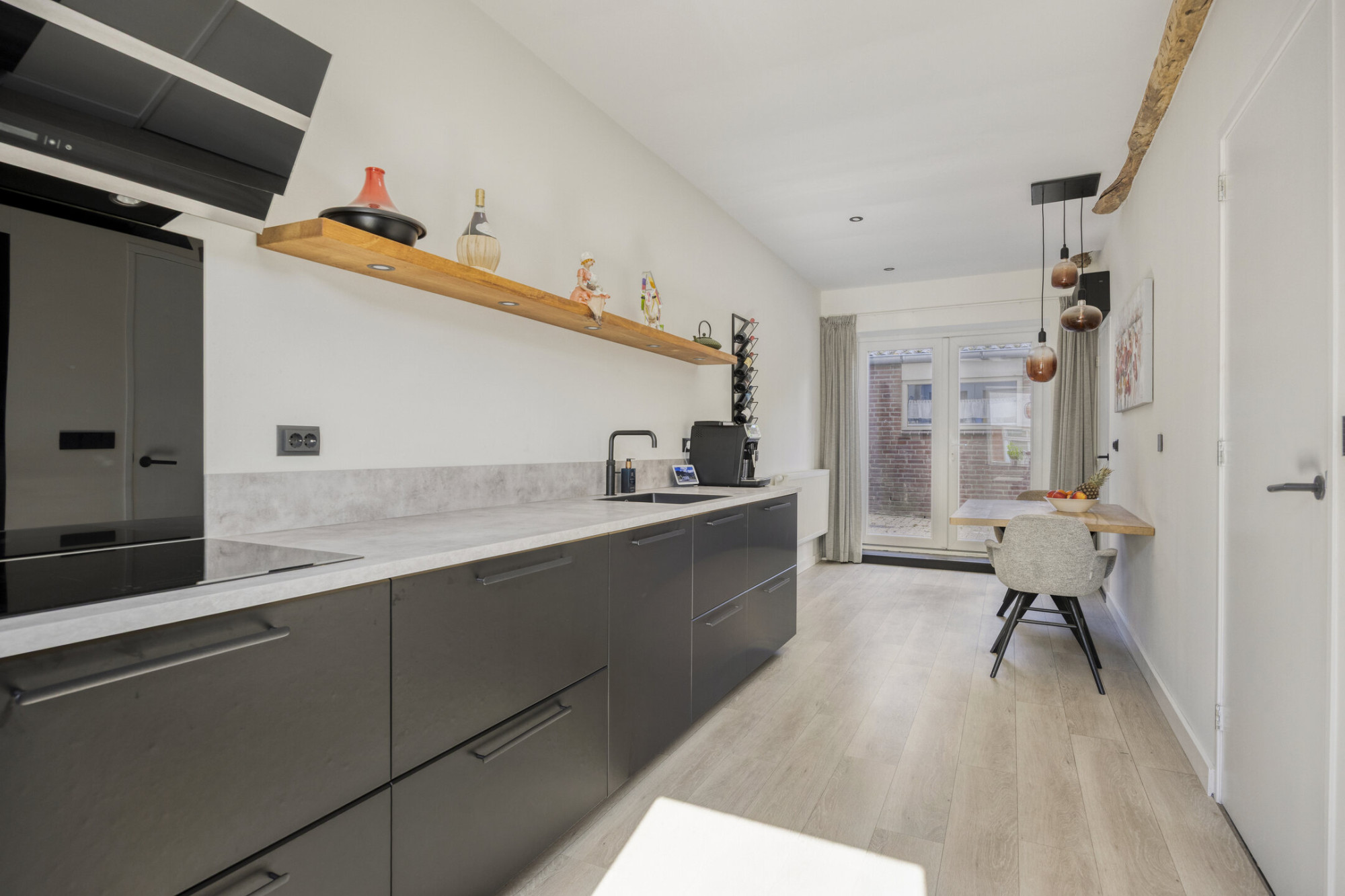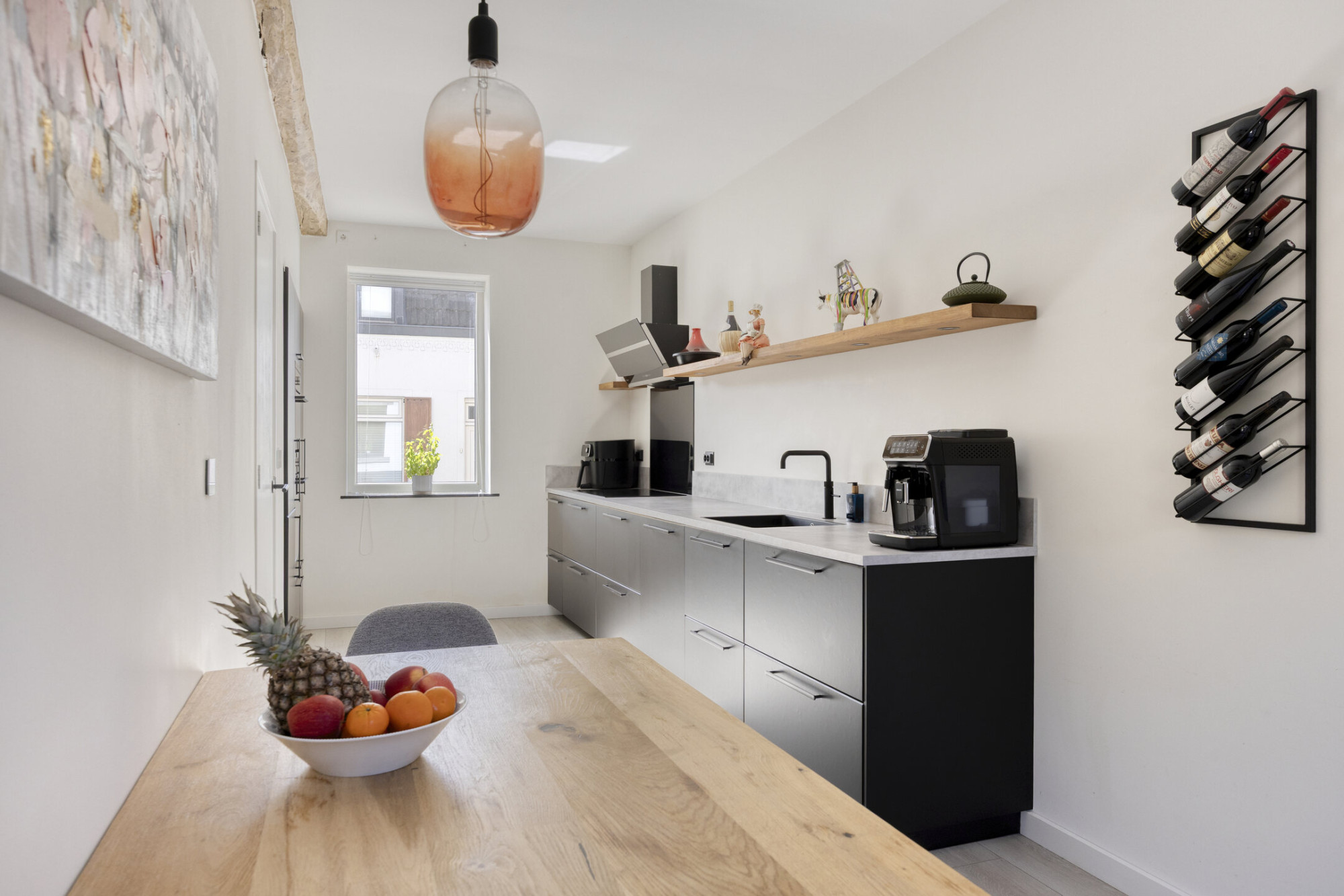 Links van de hal bevind zich de nieuwe moderne keuken (2.91 x 77.22m) geplaatst in 2021 en voorzien van diverse apparatuur. Ook via de keuken is er middels een dubbele deur toegang tot de achtertuin. Vanuit de hal is er ook toegang tot een tussenhal met een toilet en doucheruimte (beide nog niet gemoderniseerd) en de trap naar de provisiekelder.