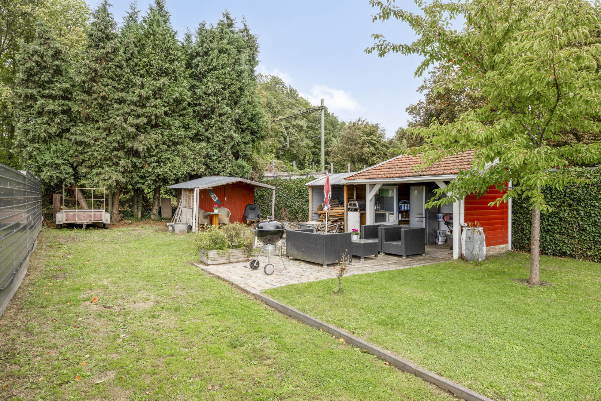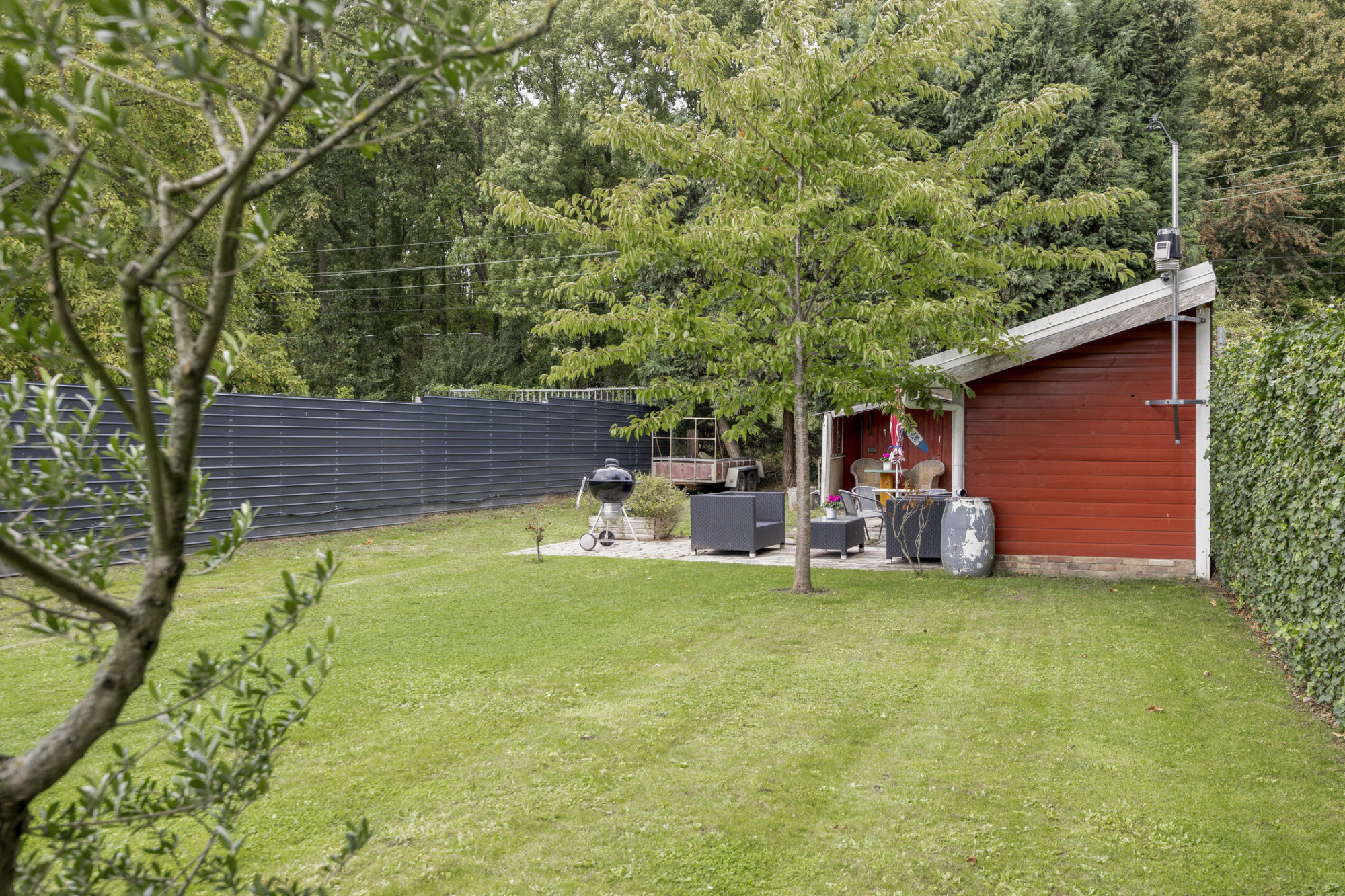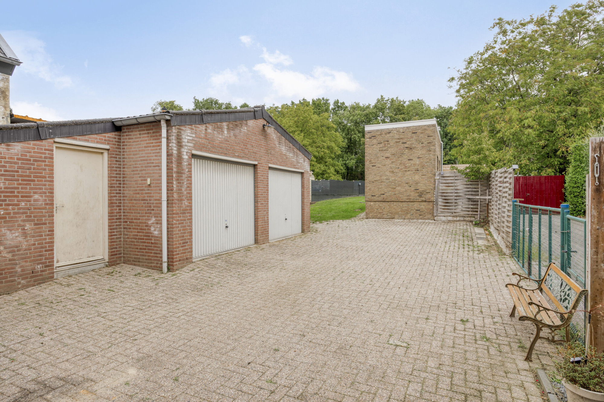 De diepe achtertuin is via een gedeelde weg langs het huis ook met een auto bereikbaar. Hier bevinden zich op het voorste gedeelte 2 garages (ca 4.5 x 3.0m) en een berging. Het achterste gedeelte is netjes aangelegd met gras, beplanting en een tuinhuis.