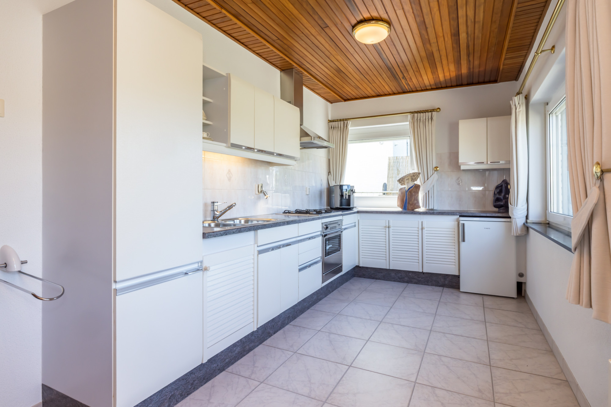 - keuken voorzien van tegelvloer en keukenopstelling met gaskookplaat, afzuigkap, koelkast en oven