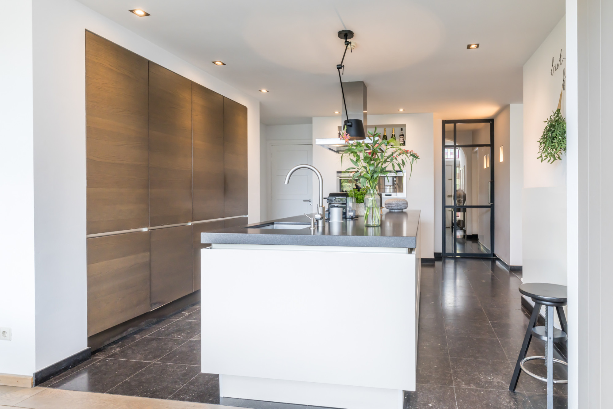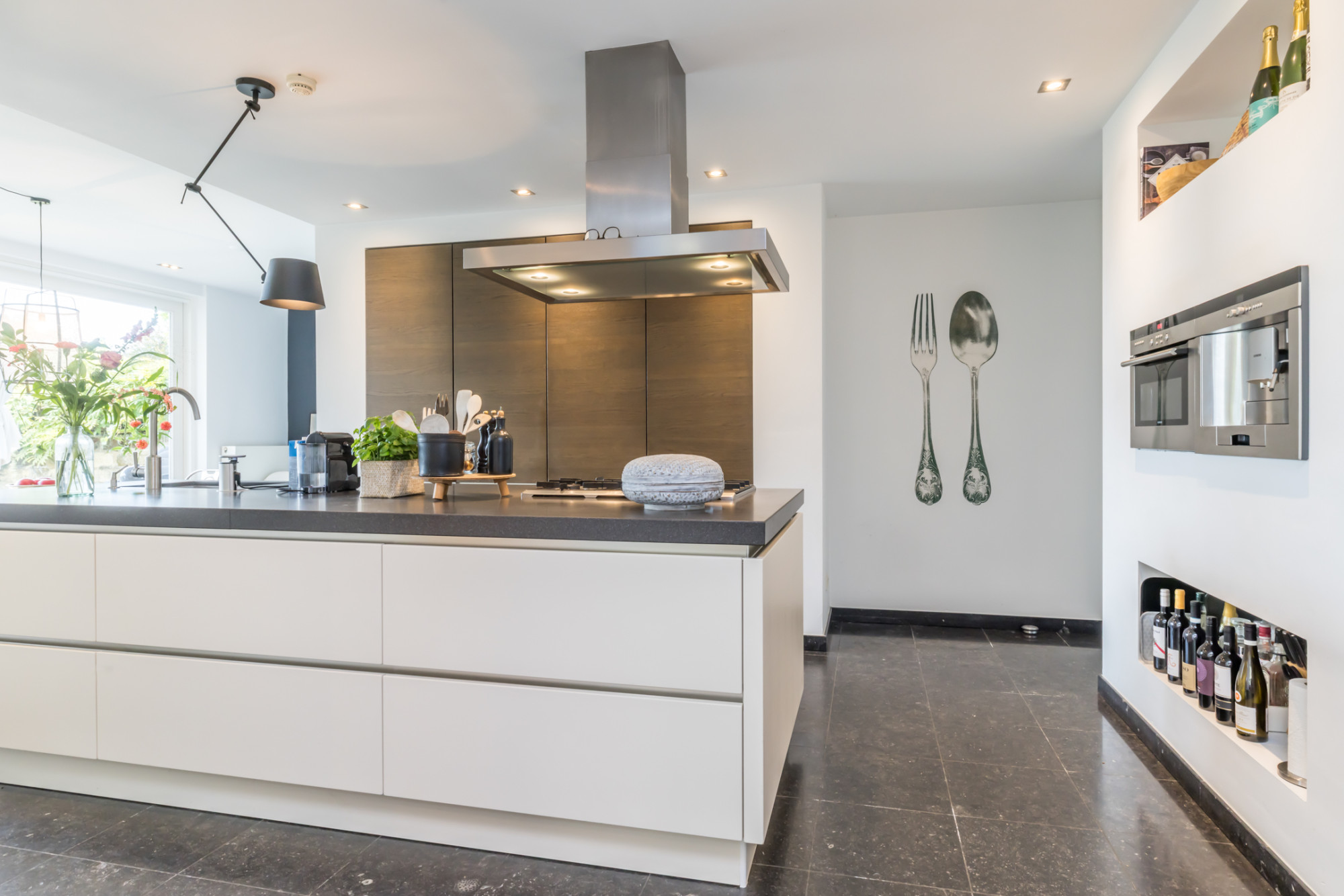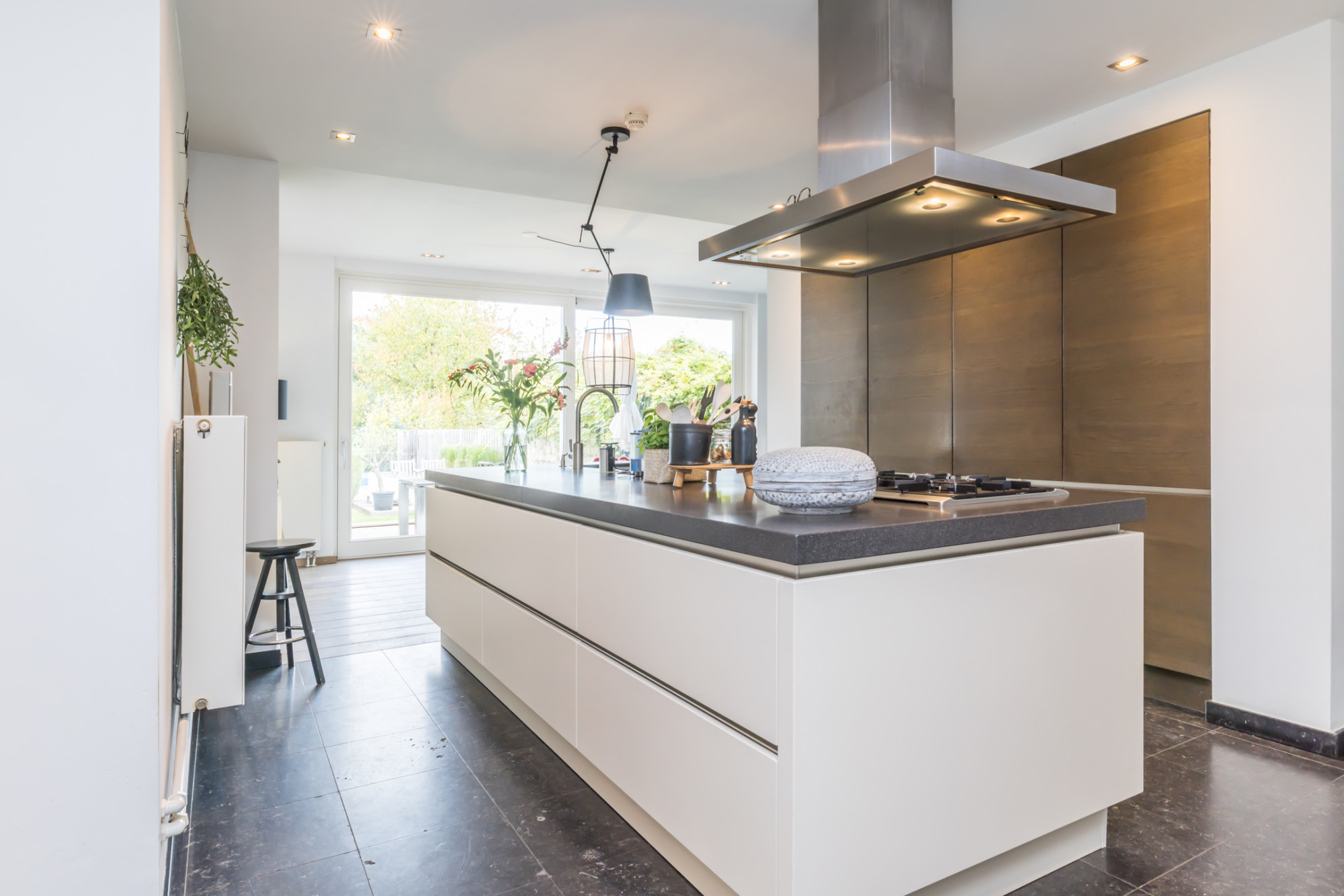 - leefkeuken met keukenopstelling voorzien van kookeiland met 5-pits gaskookplaat, afzuigkap, combioven,