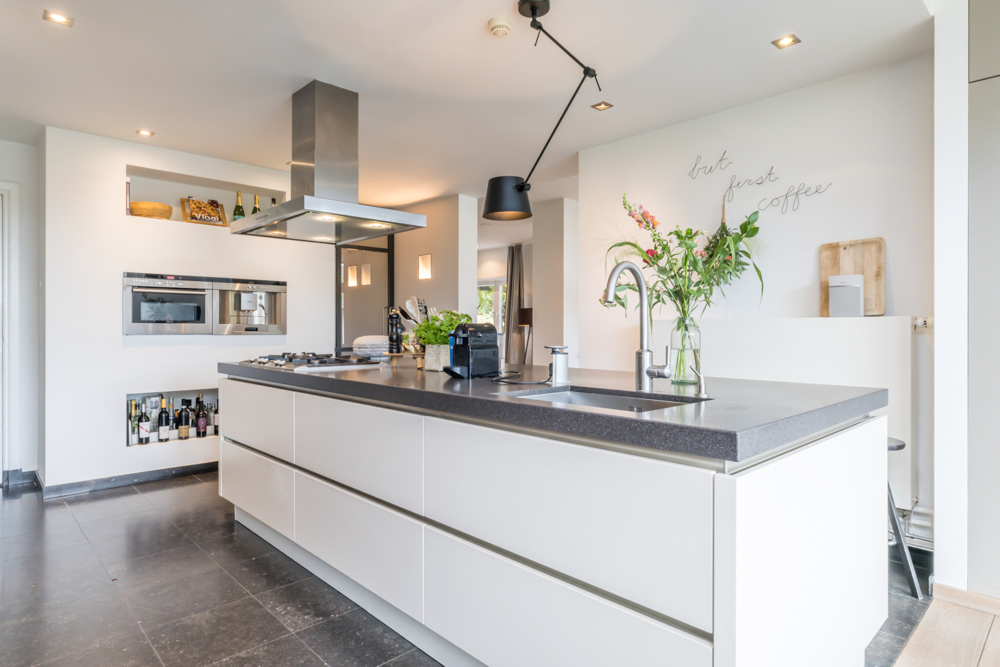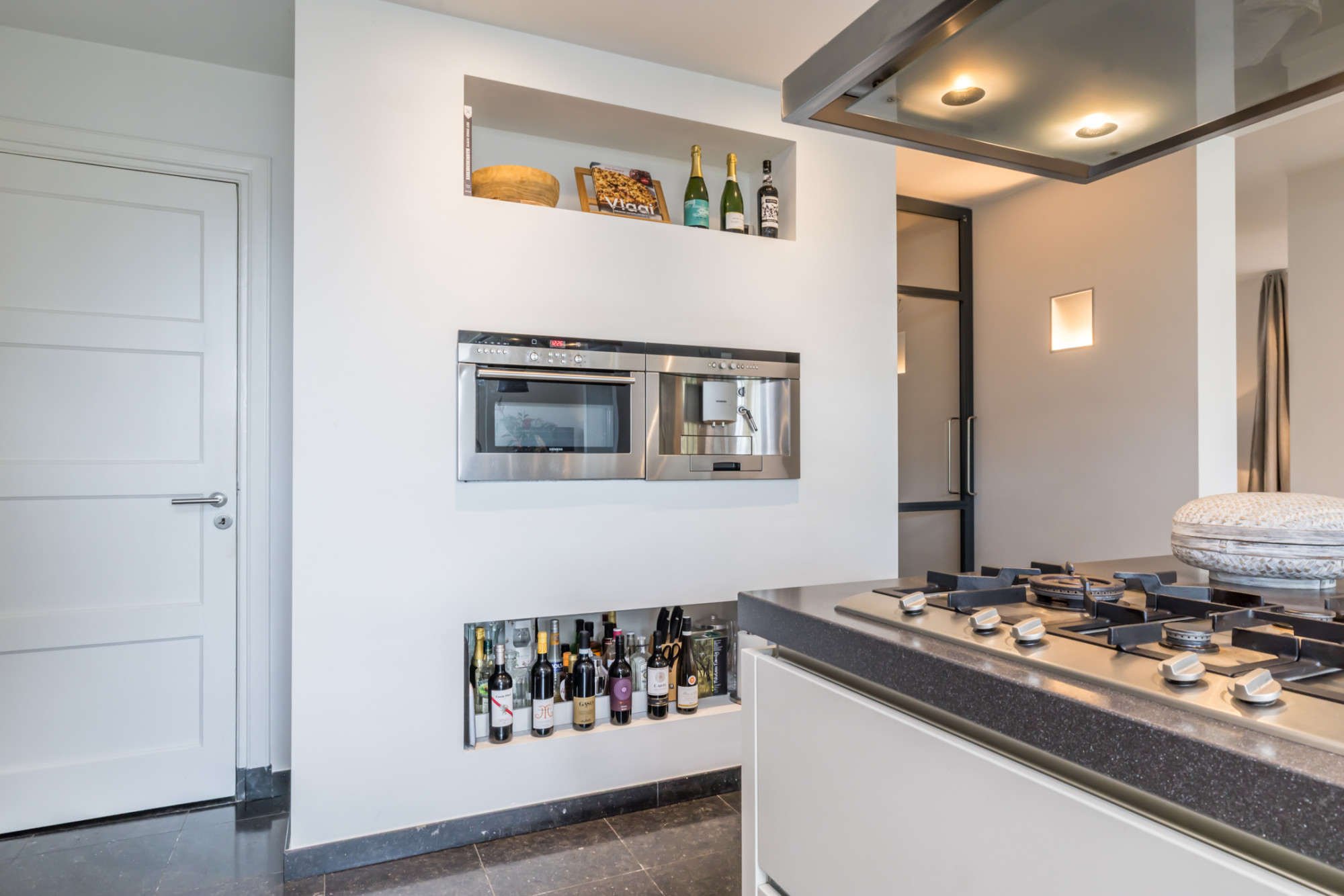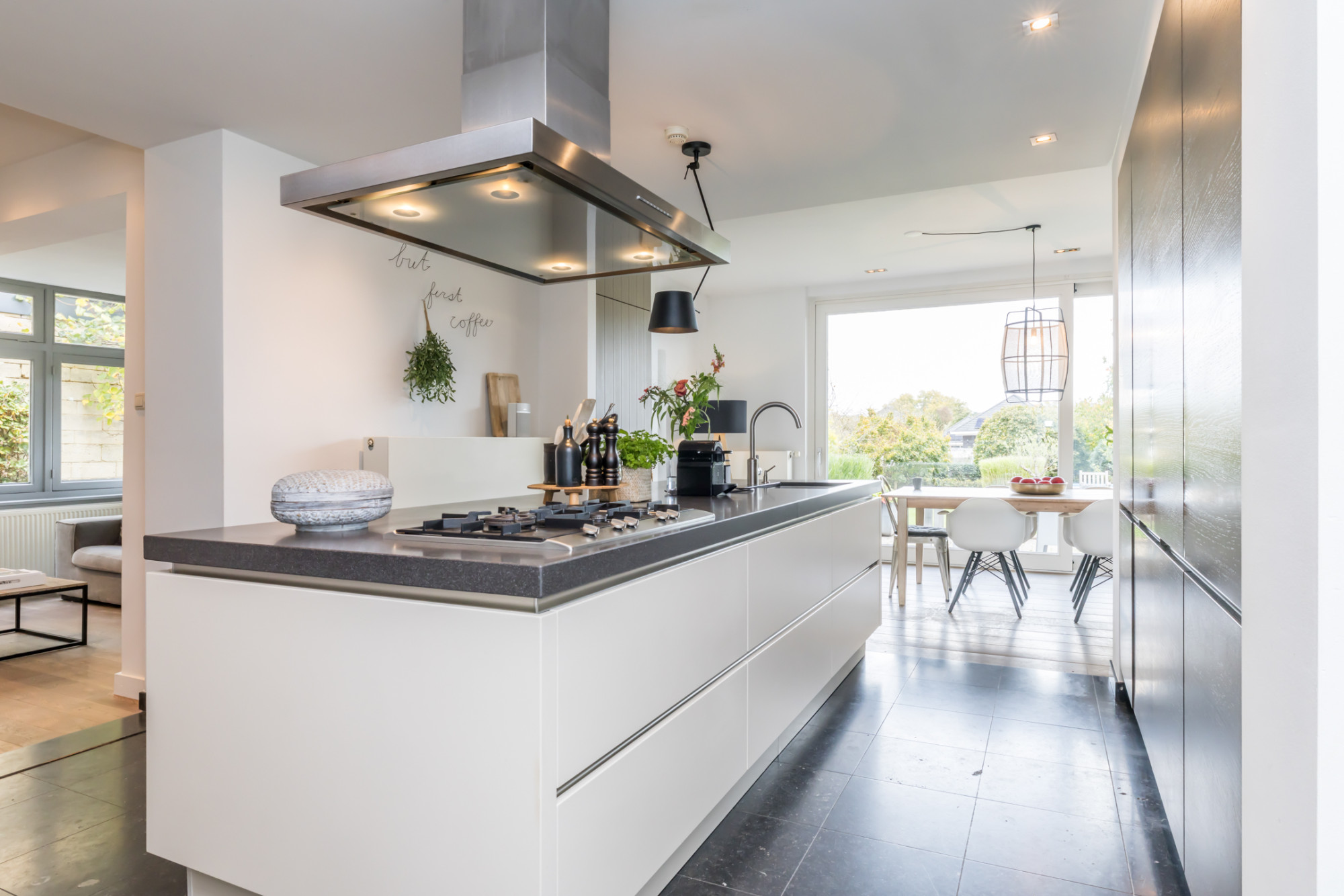 - leefkeuken met keukenopstelling voorzien van kookeiland met 5-pits gaskookplaat, afzuigkap, combioven,