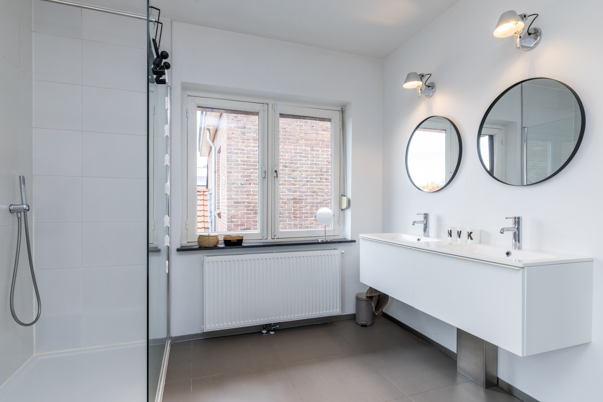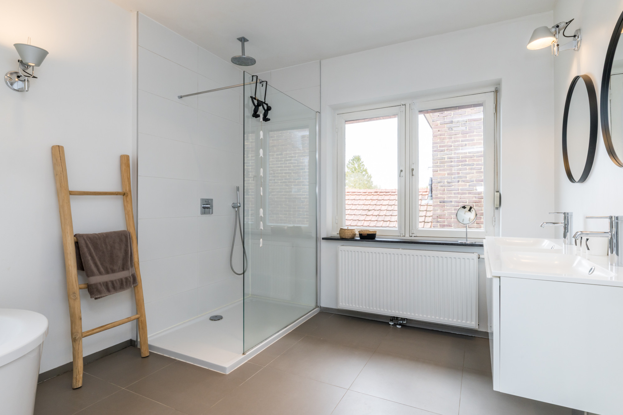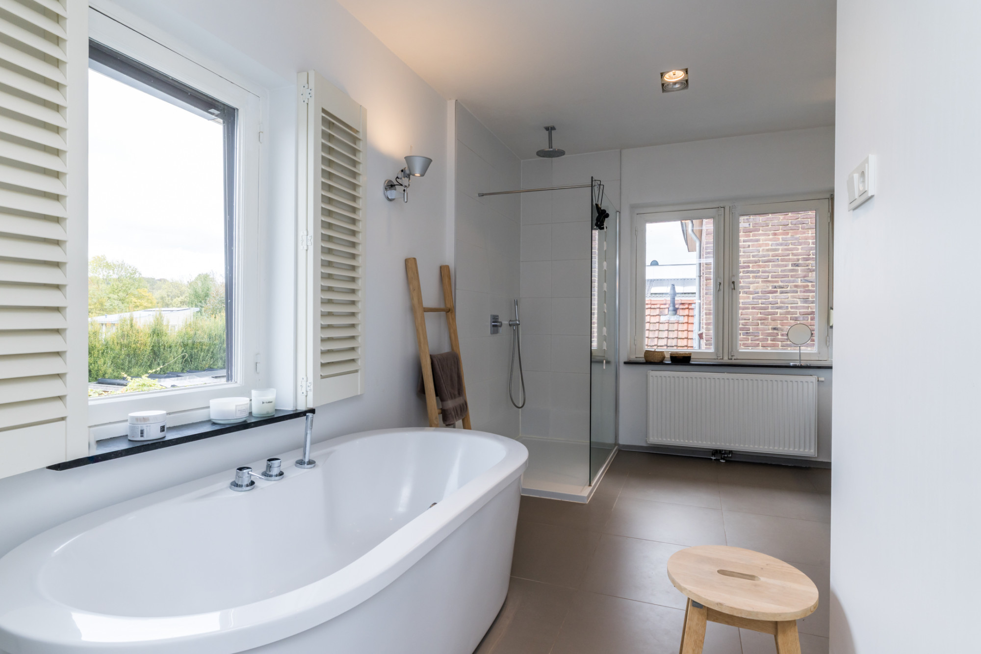 - moderne badkamer voorzien van ligbad, inloopdouche, dubbele wastafel in meubel